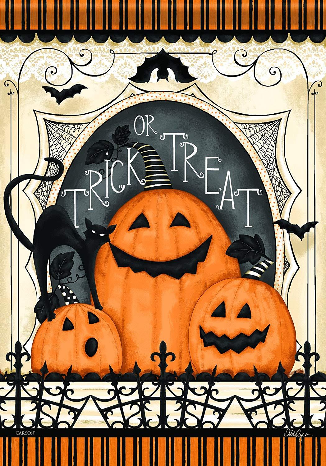 This spooky, yet whimsical, Halloween themed garden flag features three friendly looking jack-o-lanterns hanging out with cats, bats and spider webs. The pumpkin stems are painted up with black and white polka dots and stripes for a little extra Hallowimsy flair. The "Trick or Treat" message reads correctly from both sides. Hang this spooky, but not too scary flag out to decorate your Home or business for this years fright night festivities.Carson Dura Soft garden Flags are made of an innovative soft material that has better durability than many other printed flags. It consists of a 3-ply construction with a center batting panel that blocks the light from bleeding through the other side allowing each flag to be double sided. This flag will fit on any standard 5' pole. Flag size 12"x 18". Flag pole not included.