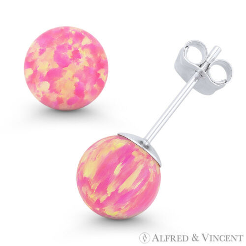 Fiery Royal-Pink Synthetic Opal Ball Pushback Stud Earrings in 14k White Gold