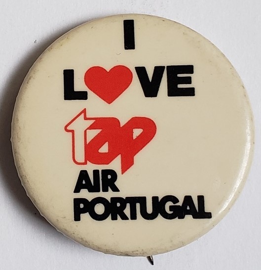 A vintage, original 1-1/2" pinback I Love TAP Air Portugal.