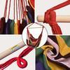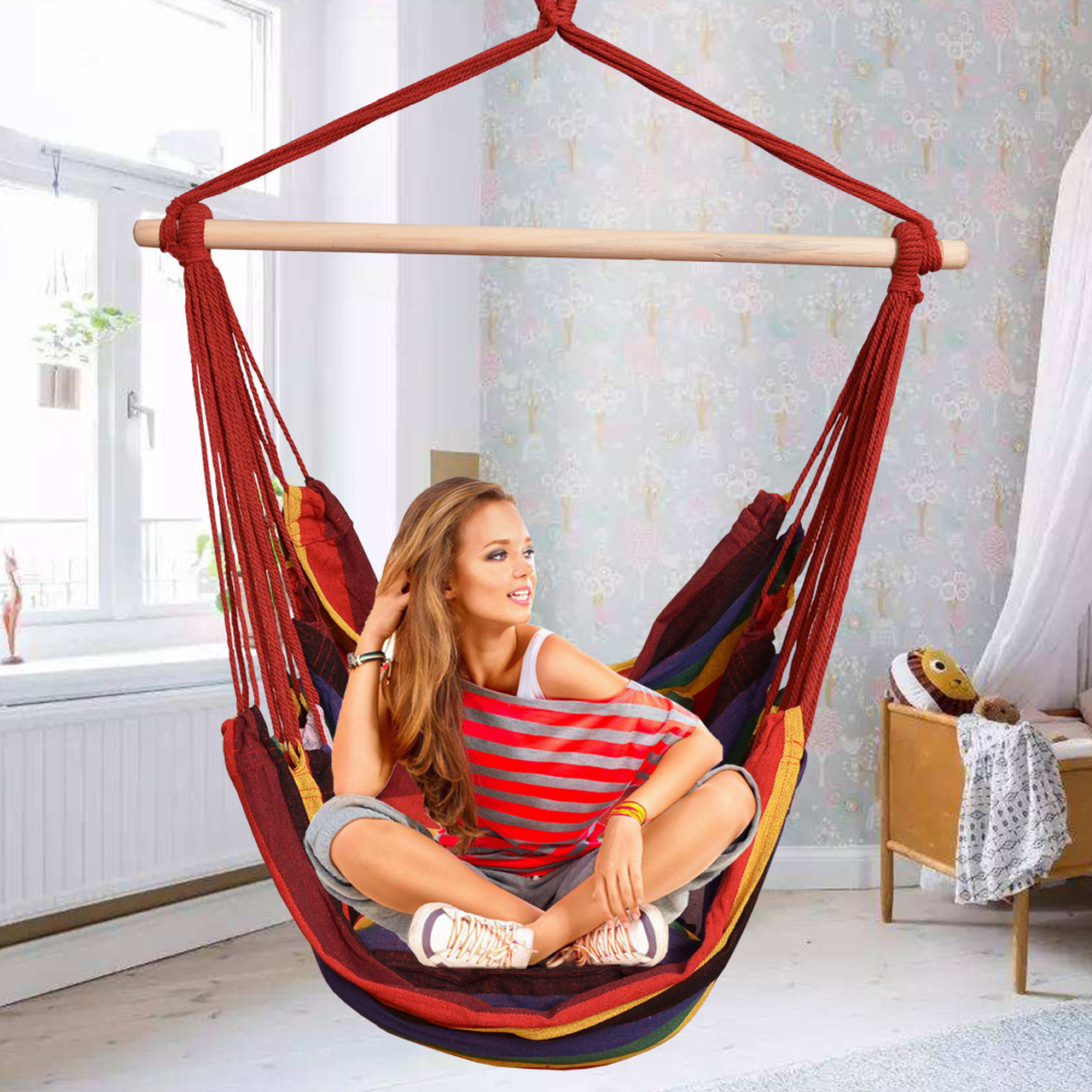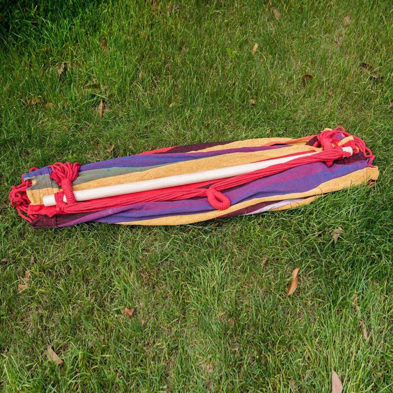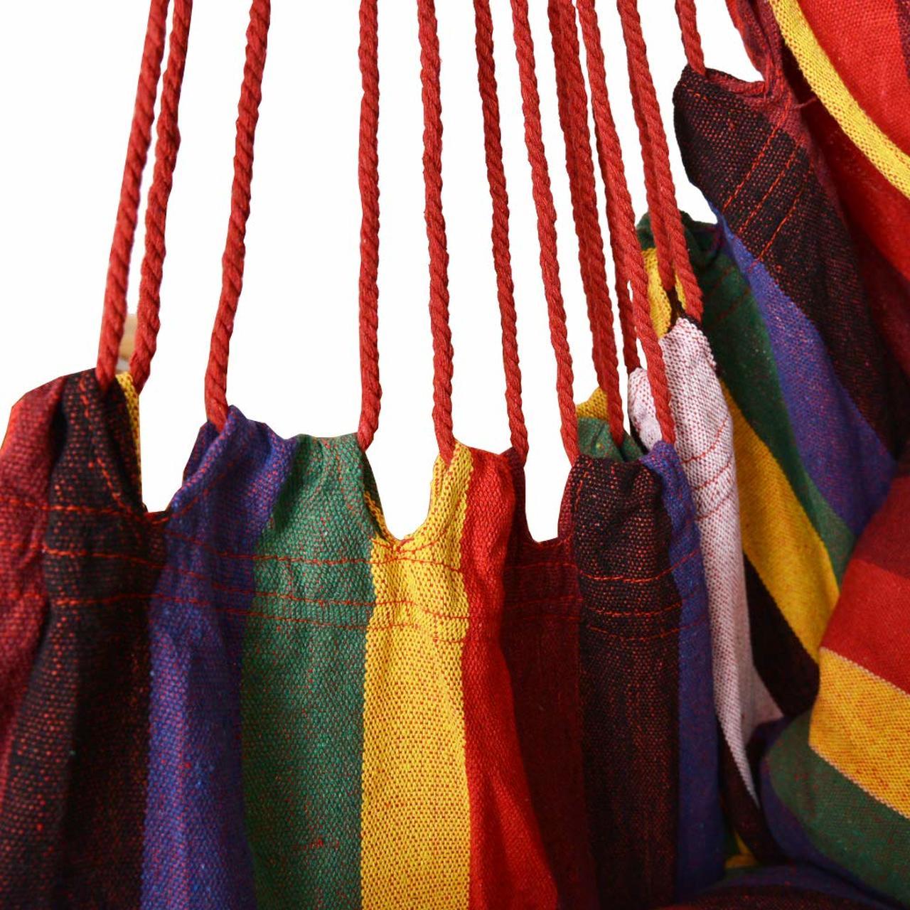 Our hammocks are hand woven by soft spun polyester which is the fabric to keep it away from rot, mold, and mildew., to ensure a quality hammock for an extended period.The multiple colorful stripn is soft, subtle color of the cotton hammock chair and wood coordinates nicely with any patio furniture set.
