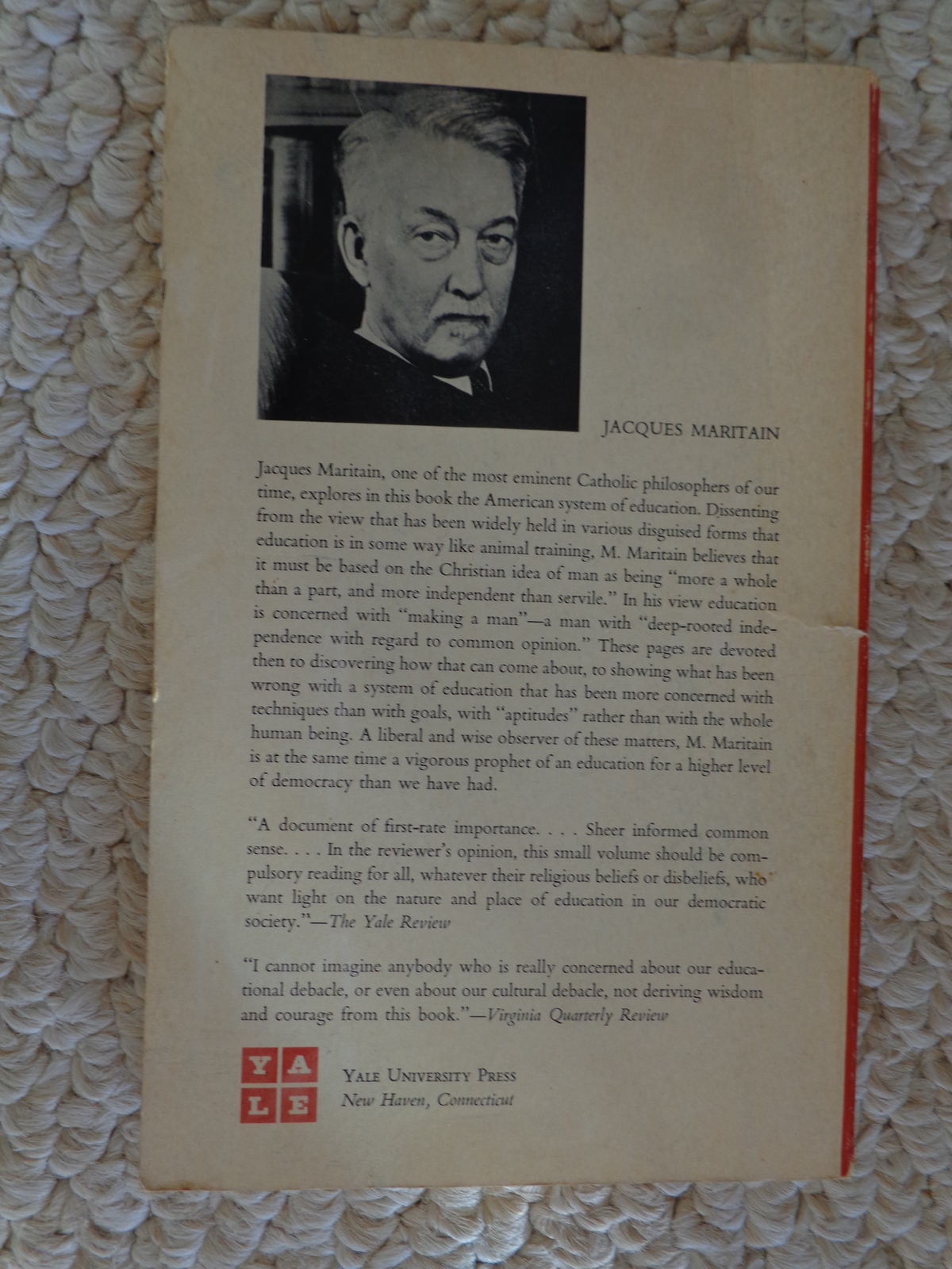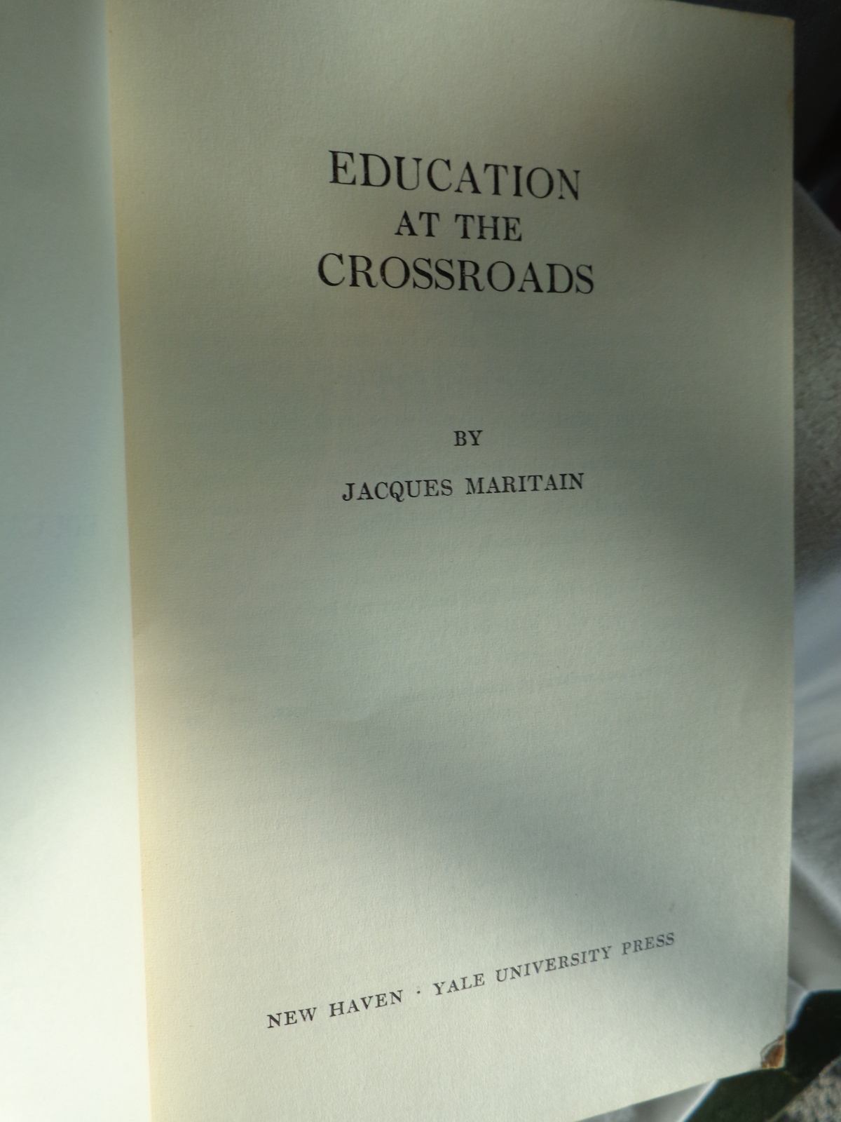 (#3479): Education at the Crossroads 1943 by Jacques Maritain. Based on the Terry Lectures delivered at Yale University, New Haven Yale University Press, Copyright 1943 by Yale University Press, Inc. Ninth printing June 1957, printed by the Colonial Press, Inc., Clinton, Mass. U.S.A. Jacques Maritain, one of the most eminent Catholic philosophers of our time, explores in this book the American system of education. Printed in the United States of America. It consists of 120 pages. It is in good condition, some spotting on the front cover, but there are no missing, or torn pages. Please see pix for a complete description.