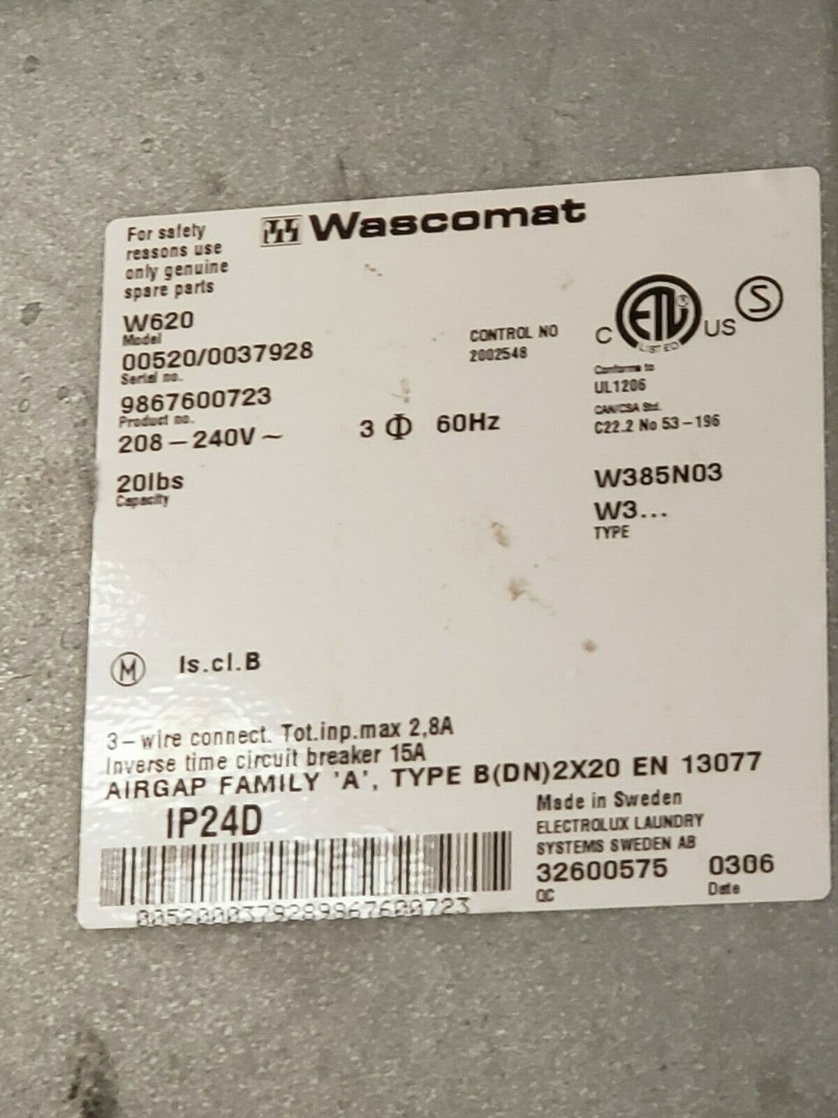 Description: Wascomat Front Load Stainless Steel Washer Coin Op 20LB, 208-240V 60Hz 3PH. Model Number: W620, Serial Number: 00520/0037928 [Refurbished].