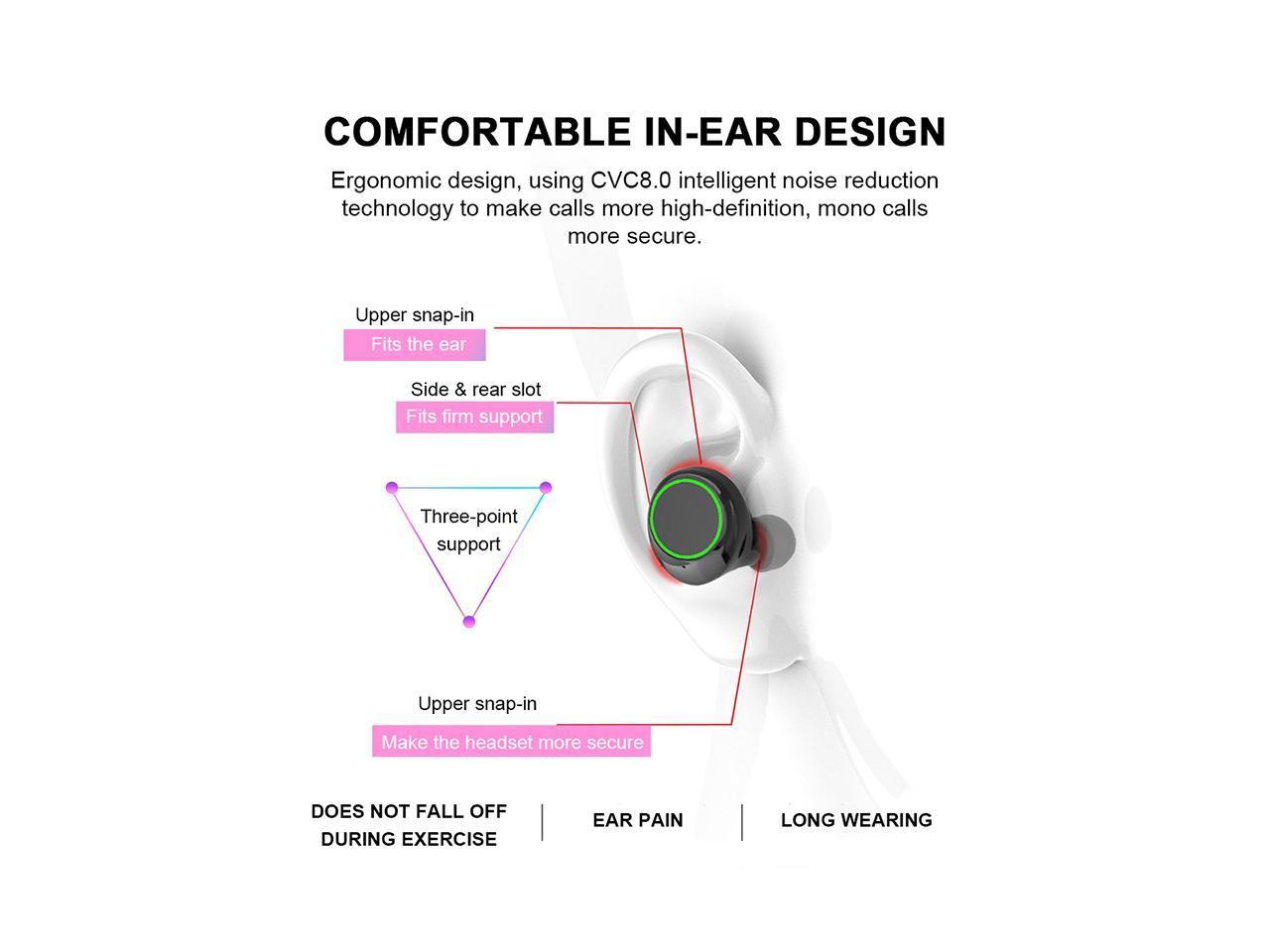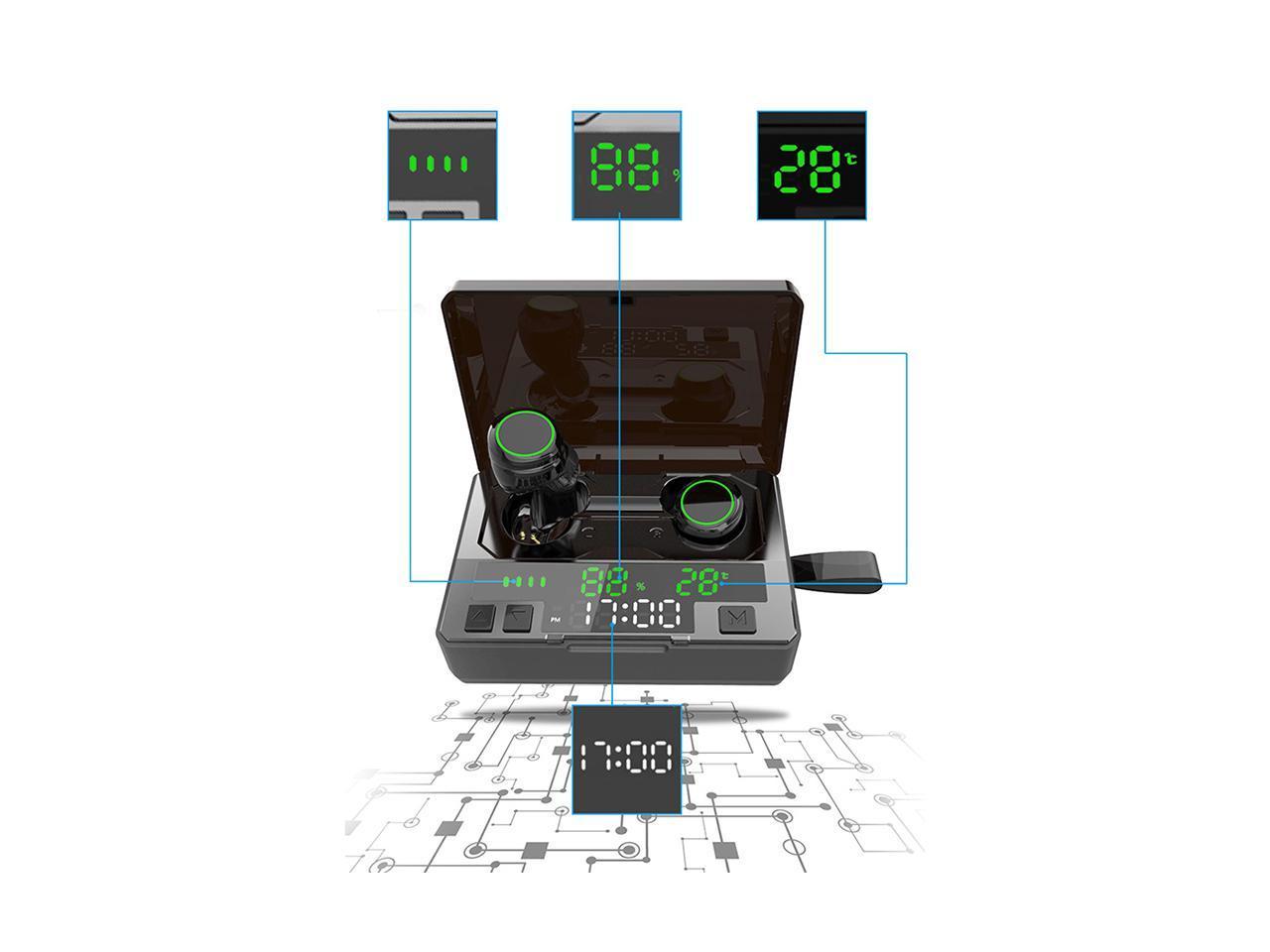 These True Wireless Stereo (TWS) in-ear headphones offer you freedom of movement and freedom from distractionโno cable for connecting to audio source or between two earbuds. They deliver superb sound for music and calls from 6mm drivers, and use energy-efficient Bluetooth 5.0 for stable, reliable connection. The earbuds offer roughly 4-6 hours music/call time, and a 6,800mAh charging case keeps them organized and juiced up when not in use. An LED display shows battery levels for earbuds and the charging case, as well as current temperature and time. Plus, the charging case can work as a power bank to charge other USB-enabled devices.