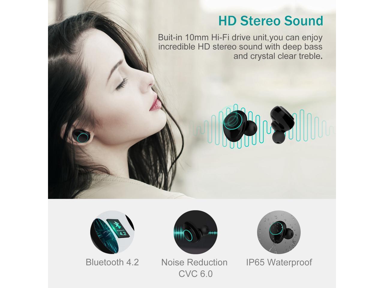 X9 Wireless Earbuds is designed base on thousands people's ear data, perfect angle and 3 sizes of ear cap,tailored fit to most people's ear. Super small (16mm*25mm*25mm) and lightweight (only 4g) make it is easy to carry and comfortable to wear.