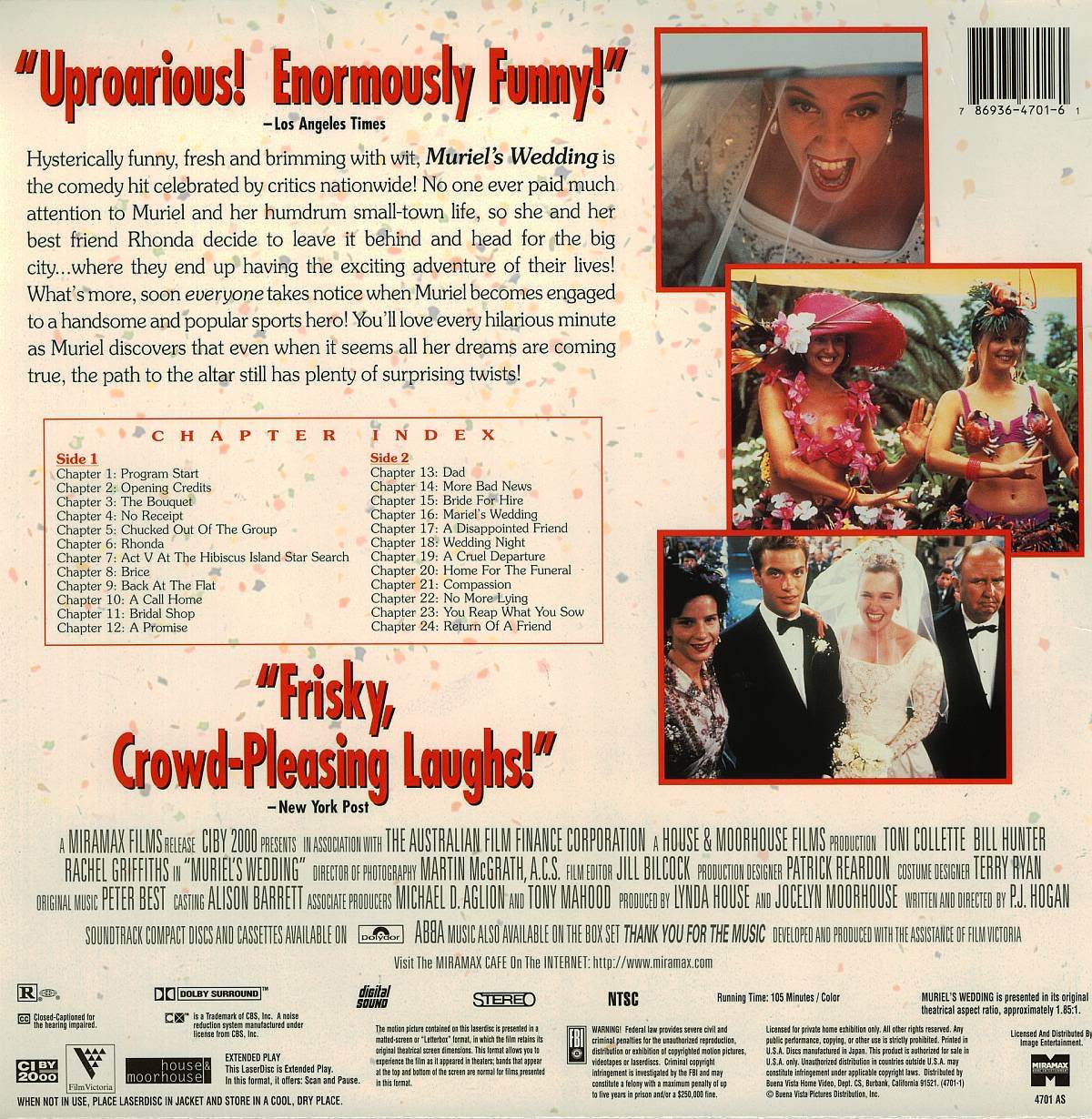 This is a previously viewed LASERDISC of the rare comedy classic MURIEL'S WEDDING, staring: