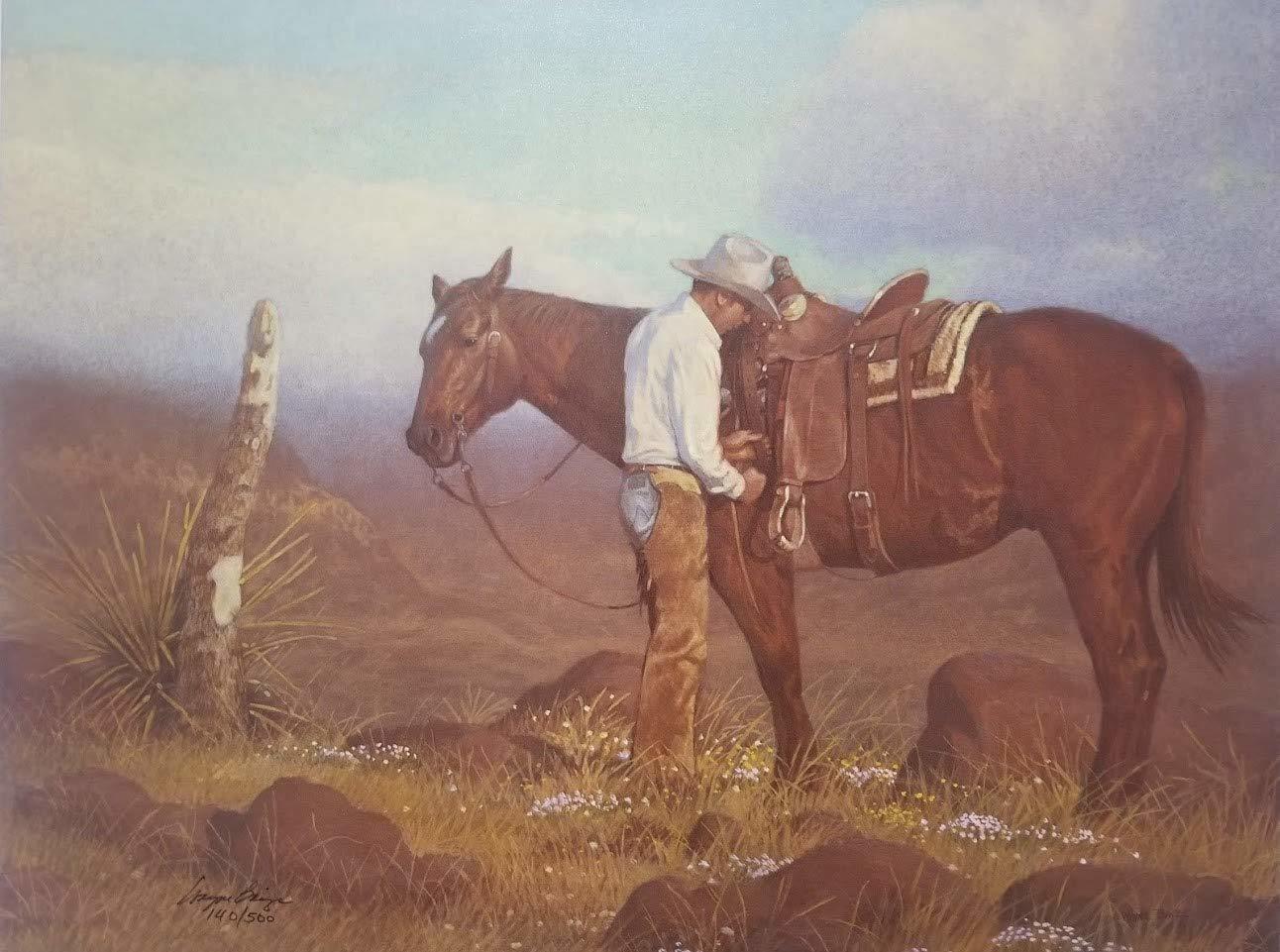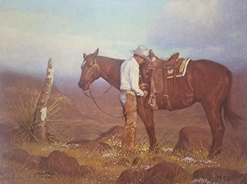 Product description: "When Sunshine prevails Over Mist" is a signed and numbered print by CAA Artist Wayne Baize. It depicts a cowboy saddling up his horse getting ready for a day's work. The print has been transferred to canvas and stretched, giving it the look of an oil painting. Like an oil painting, it can be framed without glass or matting. The image size is 18" x 24". It was published by Fenton Press in 1984. One of a Limited Edition of only 500 prints, this print is rare and hard to find. About the Artist: Wayne Baize has shown an affinity for art since his early days in public school. His first private art teacher was Sarah McDonald, a friend of artist Frank Tenney Johnson. After high school graduation, Wayne set up a table at Luskey?s Western Store in Abilene where he commissioned portraits of people and their animals. Words of praise for Baize's work soon spread along the local grapevine, prompting Brad Thompson to offer Baize his first one-man show in Stephenville, Texas. The show was a sellout and provided the income and confidence that Baize could make a living as an artist. Wayne s favorite subject is the horse. He is known for his ability to accurately portray a horse?s muscling and structure. Wayne and Ellen?s four children and their horses are also often depicted in Wayne?s paintings. In the late 80s, Baize shifted his focus away from mixed media and pencil drawings and started putting his main efforts into oil paintings. That transition into oil painting was encouraged by the prestigious Cowboy Artists of America and Wayne was invited to become a member of the CAA in 1995. Baize considers this to be the highest honor that he could obtain in his art career. Other honors include the silver medal award for drawings at the 1997 Cowboy Artist Show in Phoenix, AZ and he was awarded the American Cowboy Culture Award for 2004. Baize?s paintings and drawings have graced the covers of several horse and cattle magazines including The Quarter Horse Journal.