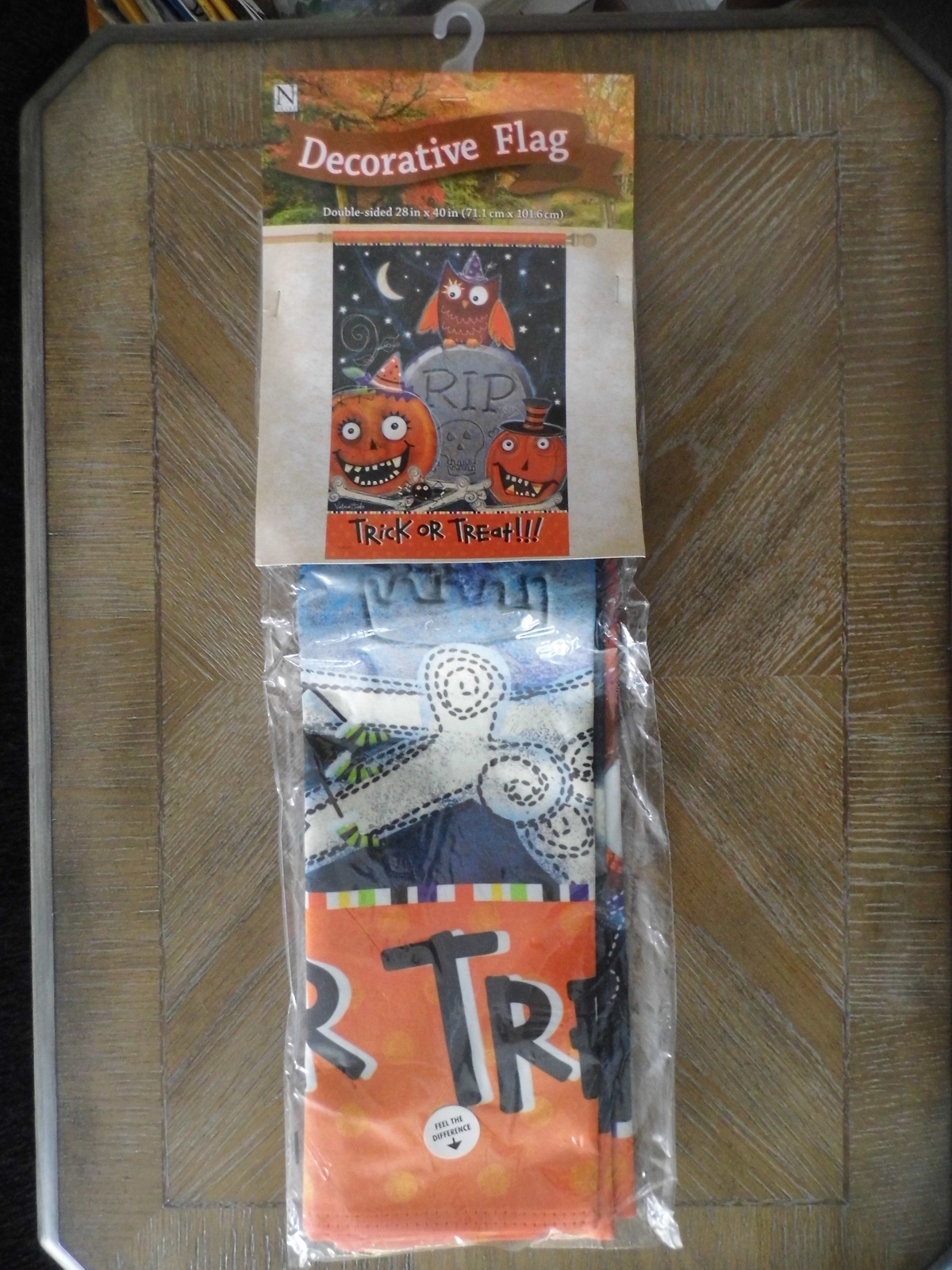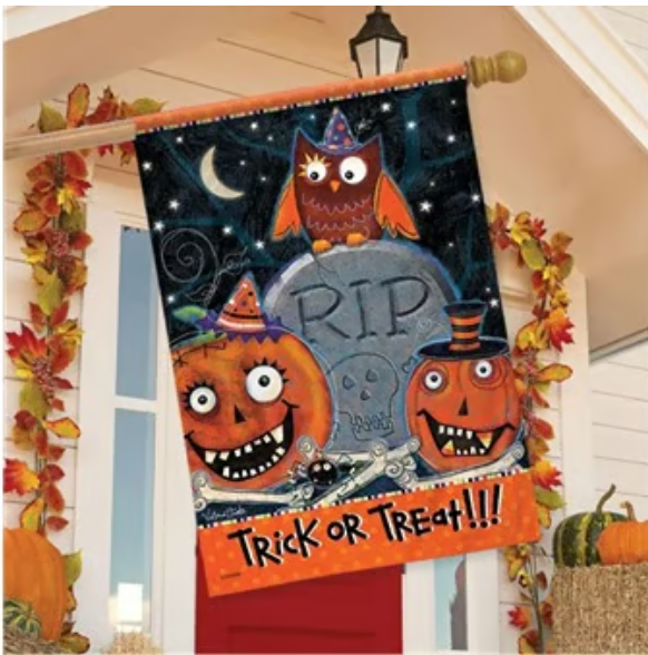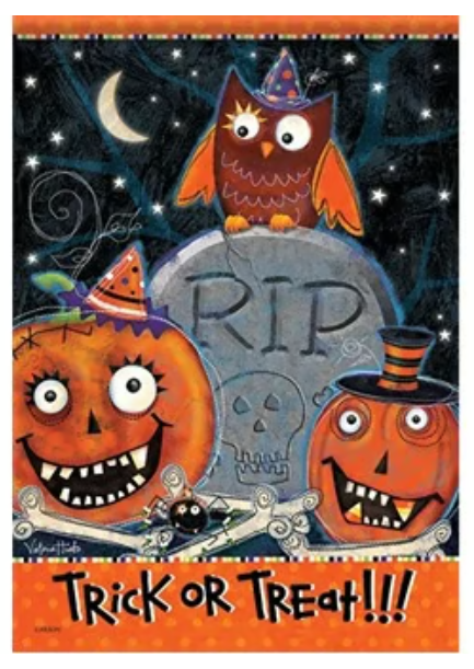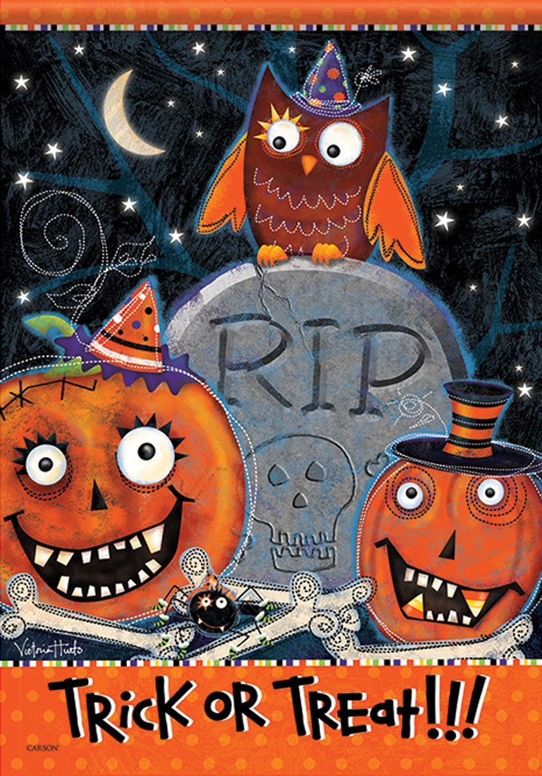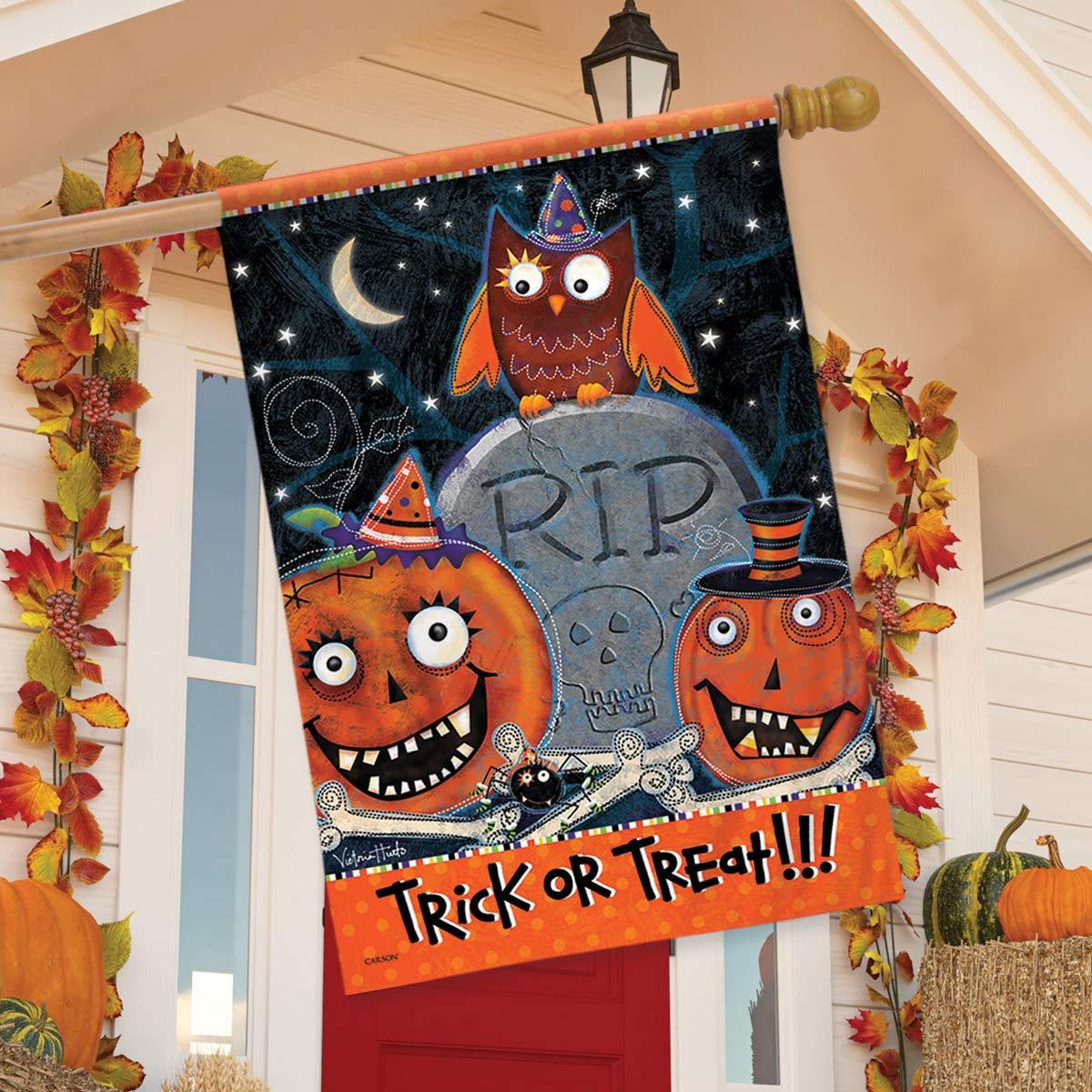 Kooky Spooky decorative Halloween House Flag measures 28"x 40".What a fun design to welcome the spooky season, featuring funny Jack O'Lanterns with wicked smiles next to a gravestone with RIP message with an owl perched on it. Message "Trick Or Treat" is shown near bottom border. . "Trick Or Treat" reads correctly on both sides. The contrasting colors create a unique Halloween outdoor flag to welcome friends and family to your home. This Halloween outdoor house flag will be a great addition to your Halloween decorations. Artwork by Victoria Hutto. Flag pole not included.