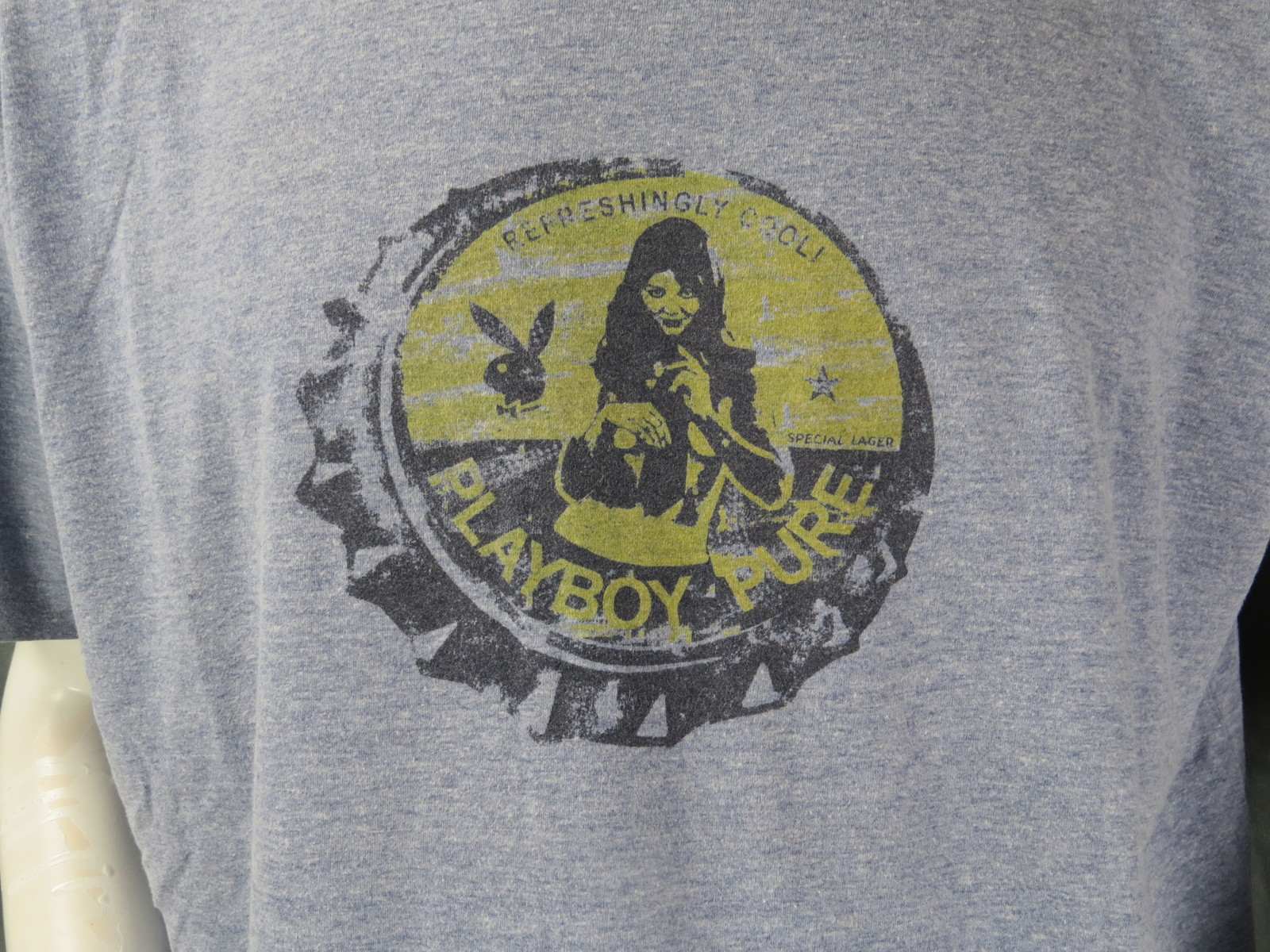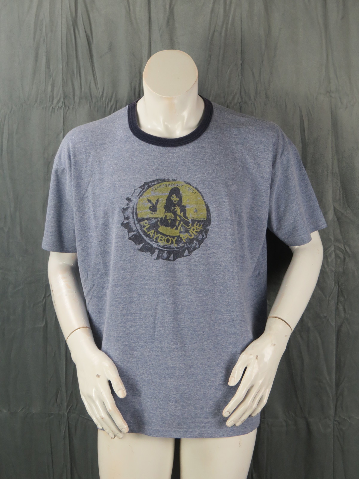 Up for sale is a vintage Playboy shirt. It has a light blue base colour with thick blue trim. The graphic on the shirt features a bottle cap with a sexy lady in it and the wording Playboy pure across the top of the bottle cap. What an amazing vintage graphic t-shirt do not miss out on it.