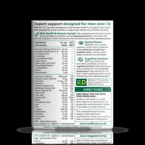 Wellman 70+ provides a comprehensive range of 30 vitamins, trace elements and specialist advanced nutrients specifically formulated to help safeguard the nutritional needs of men aged 70 and above.