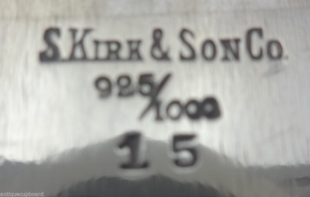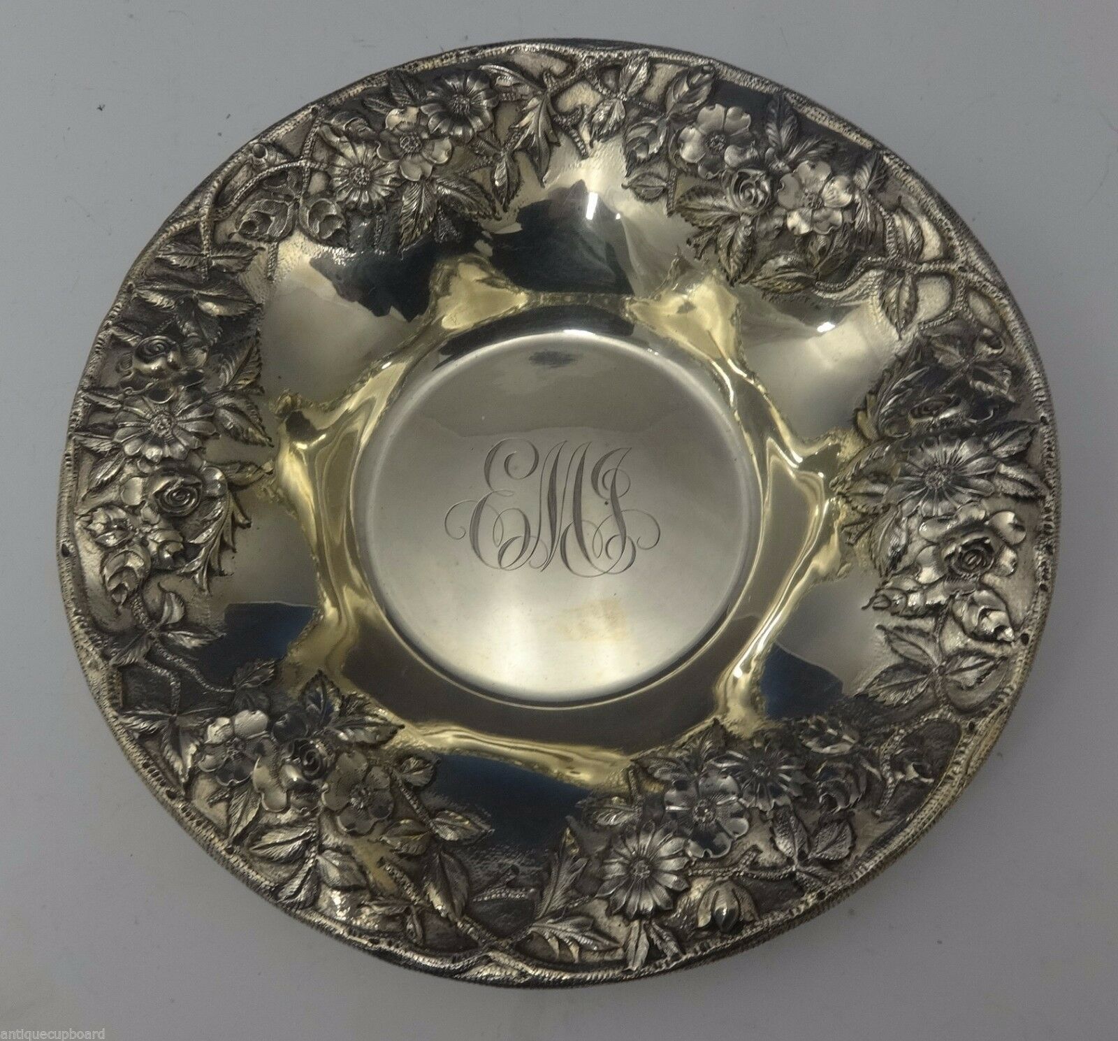 Repousse by Kirk sterling silver fruit bowl. It has an "EMJ" monogram. The piece is marked with #15 and 925/1000, and it dates from 1896-1924. It measures 1 1/2" tall, 9" in diameter, and it weighs 12.5 ozt. It is in excellent condition.
