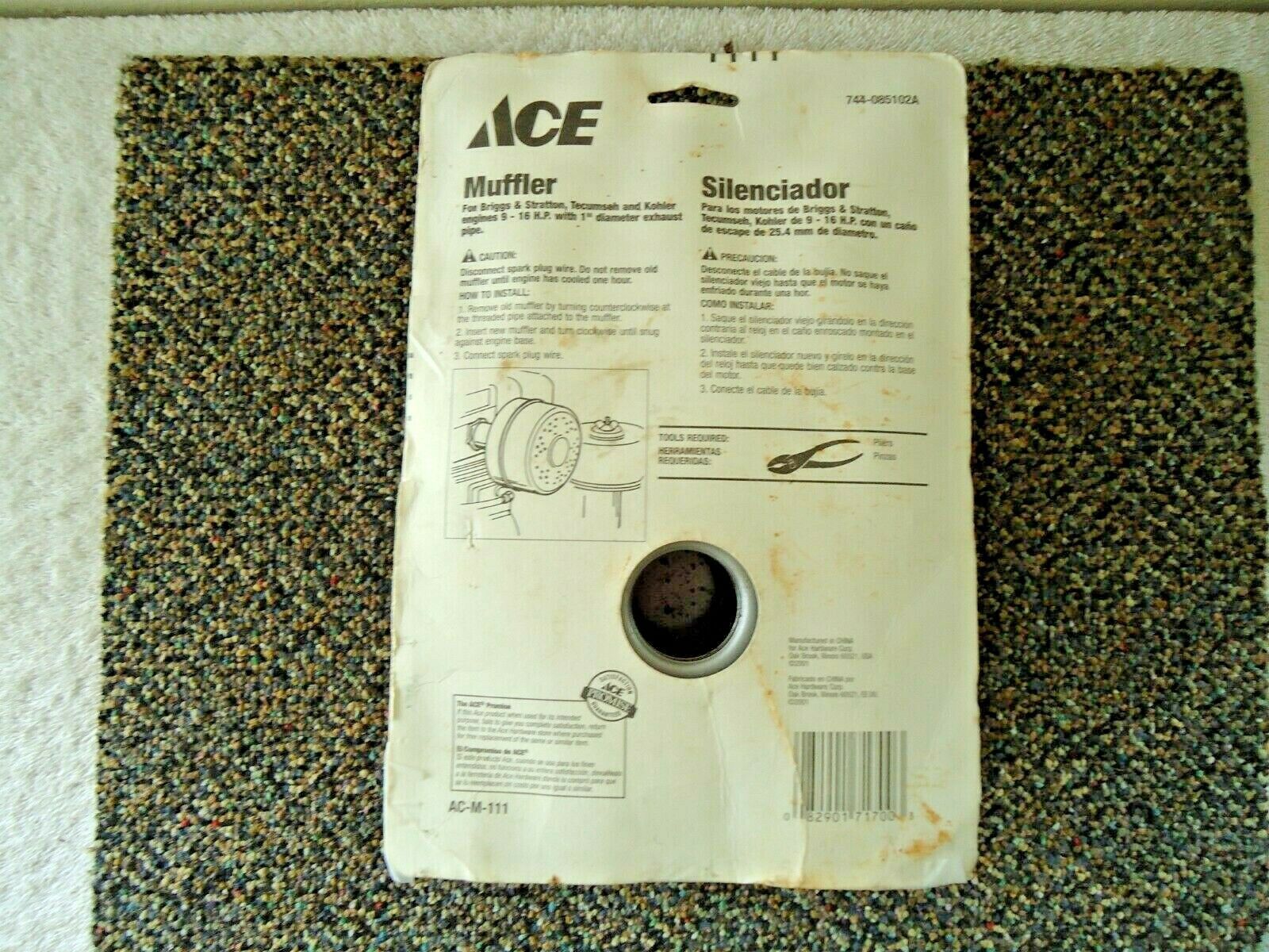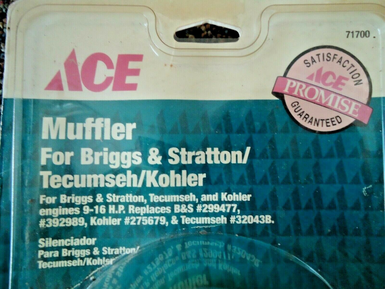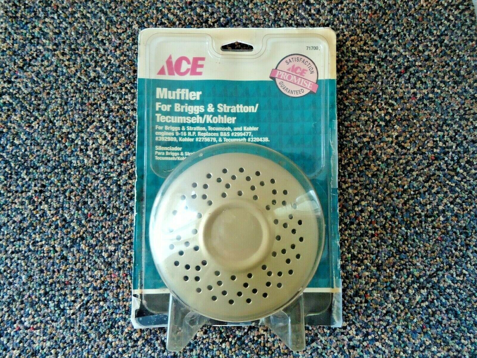 Here is a " NOS " Ace # 71700 Muffler For Briggs Stratton,Tecumseh, Kohler Fits Various Engines 9-16 H.P.This is a must for anyone who needs this or any repair shop for stock, collector,or decorator wanting that vintage retro look.If you have any concerns or questions about this item(s) please ask before bidding / purchasing because this item(s) is being SOLD AS IS.Thank You.-(PC65S)