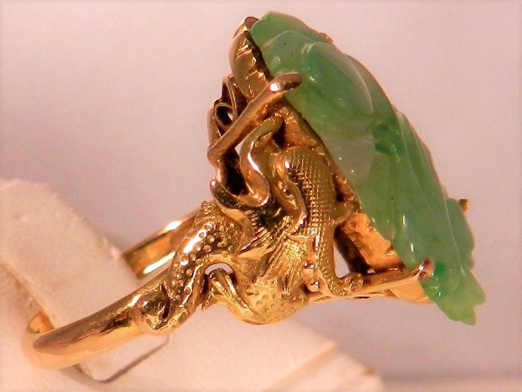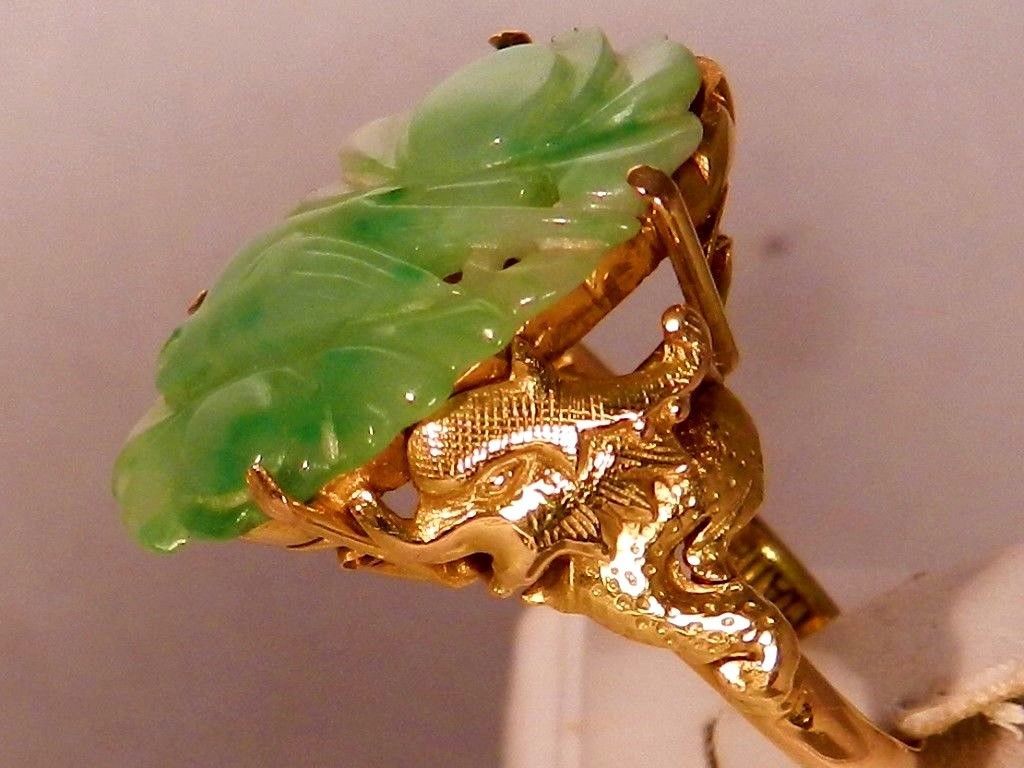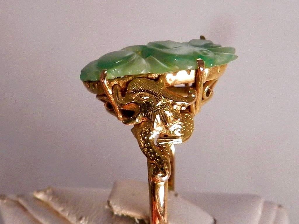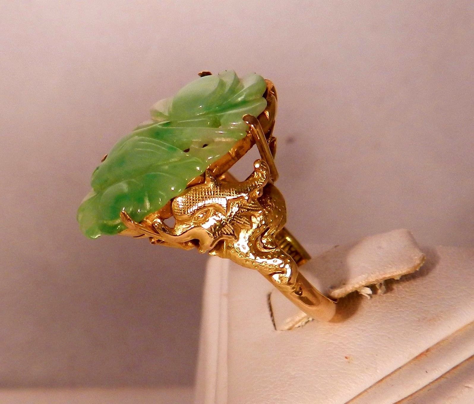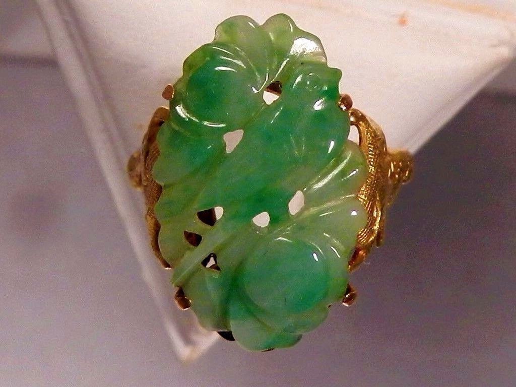 THIS sale FEATURES A VINTAGE SOLID 14K YELLOW GOLD AND CARVED GREEN JADE/JADEITE RING. THE JADE MEASURES JUST UNDER 1" X 1/2" ( approx. 20mm x 13mm) AND HAS A FLOWER AND A BIRD CARVED INTO IT. THE SHANK IS 14KT GOLD (MARKED) AND HAS THE DETAILED IMAGE OF A DRAGON AT EACH SIDE- SEE PICTURES. THE RING IS A SIZE 7 1/2 CURRENTLY, AND CAN BE RESIZED. IT WEIGHS A TOTAL OF APPROX. 6 GRAMS. THIS IS A MARKET FRESH ESTATE PIECE, RECENTLY ACQUIRED FROM AN HEIR TO ITS ORIGINAL OWNER. NO DAMAGE OR REPAIRS. INSIDE THE SHANK IT READS "MADE IN CHINA" AND "14K". WILL SHIP INTERNATIONALLY, INCLUDING CHINA JAPAN.