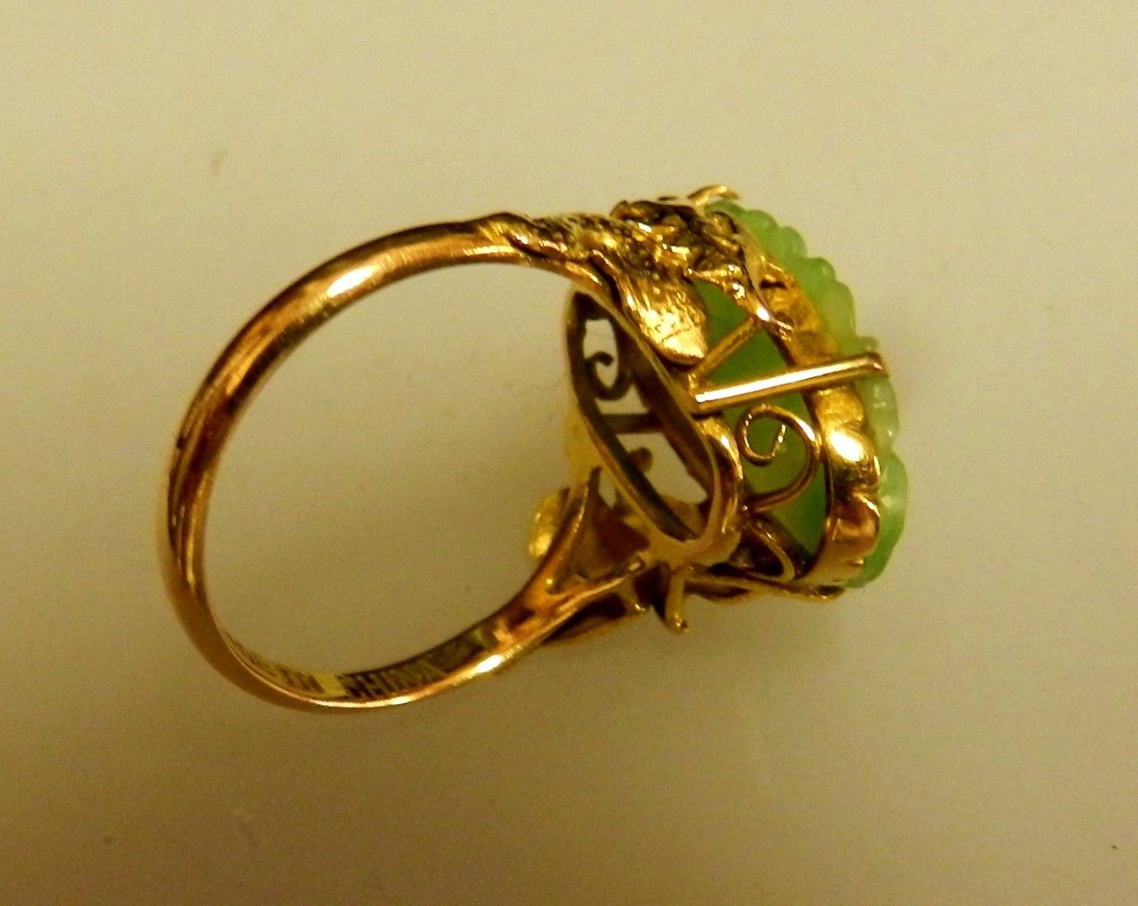 ASIAN CHINESE 14K GOLD & CARVED GREEN JADE JADEITE RING, SZ 7.5, BIRD, DRAGONS