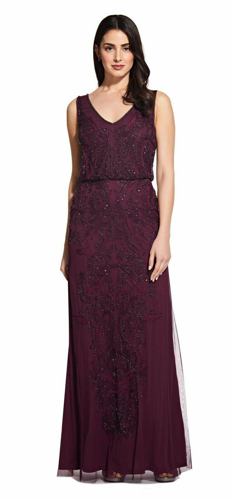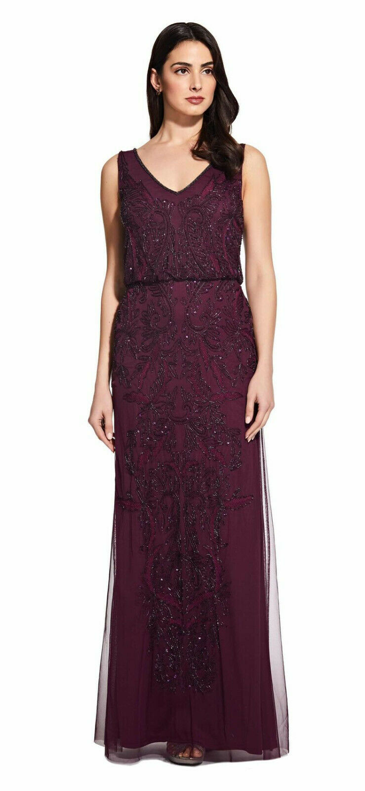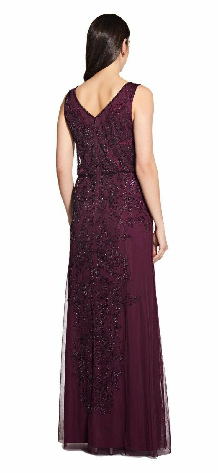 Adrianna Papell Cassis Filigree Beaded Blouson Dress with V Neck & V Back 12