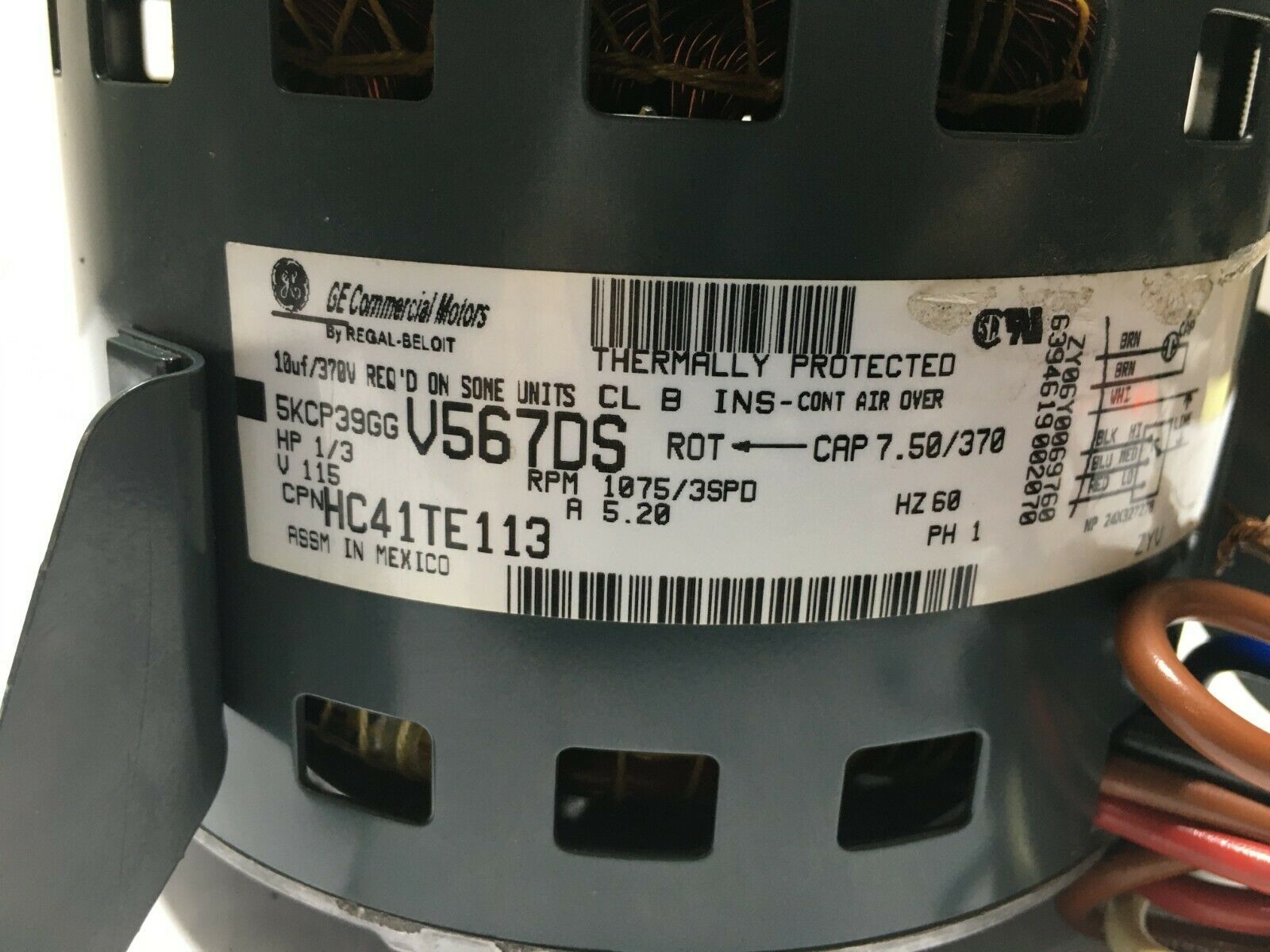 This is GE Motors 5KCP39GGV567DS Blower Motor 1/3HP 1075RPM 3SPD 115V HC41TE113 used part.