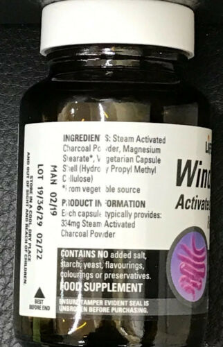 Lifeplan WindAway Activated Charcoal 334mg 30 Capsules WindAway contains activated charcoal to help with the build-up of intestinal gas. This product contains pharmaceutical grade charcoal which is derived from coconut shells. Activated charcoal contributes to reducing excessive flatulence after eating if the recommended dosage is taken. Nutritional Information: Each capsule typically provides: 340mg Steam Activated Carbon Powder. Ingredients: Steam Activated Carbon Powder, Magnesium Stearate*, Vegetarian Capsule Shell (Hydroxy Propyl Methyl Cellulose) *From vegetable source. Contains no added salt, starch, yeast, flavourings, colourings or preservatives Suitable for vegans Directions for Use: To help reduce excess flatulence, take three capsules at least half an hour before a meal and three capsules shortly after eating, as required Do not use as a substitute for a varied diet and healthy lifestyle. What is steam activated charcoal? This is a special product which involves heating charcoal to a high temperature to alter its structure, opening up millions of tiny pores between the carbon atoms. This special process results in highly porous charcoal which increases its surface area, making it capable of absorbing unwanted substances. Are there any side effects? Activated charcoal does not irritate the mucous membranes of the gastrointestinal tract and therefore is unlikely to cause any side effects. However the product may cause darkening of the stools.