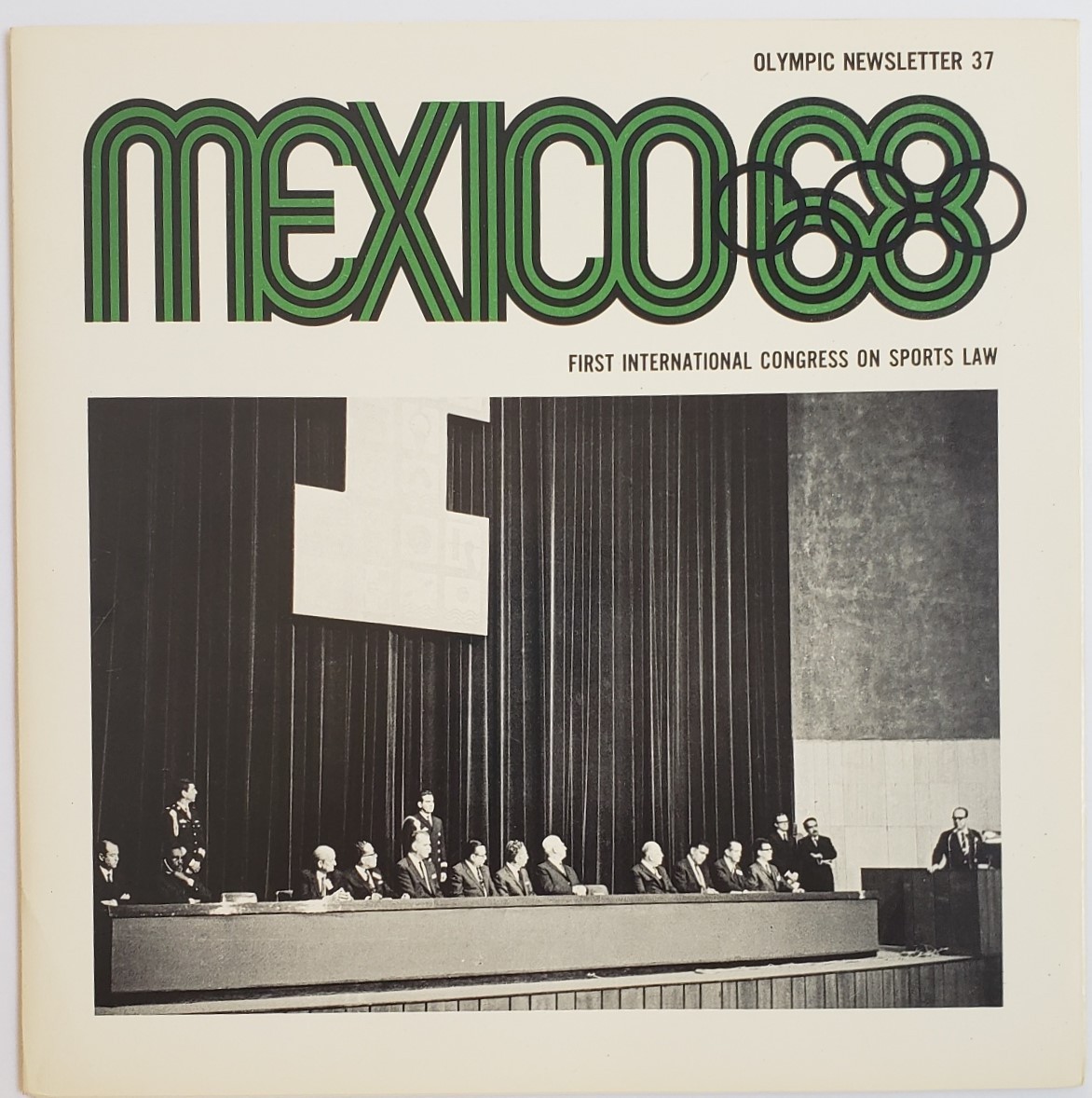 This is an original Olympic Newsletter No. 37 from the 1968 XIX Olympiad featuring First International Congress on Sports Law.