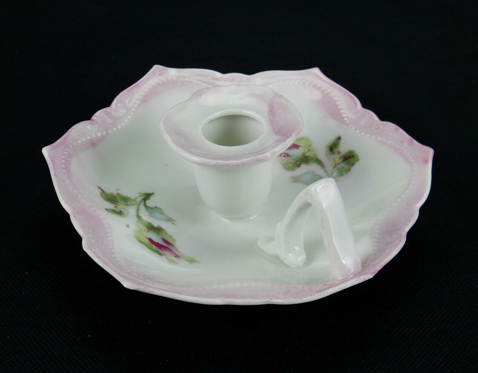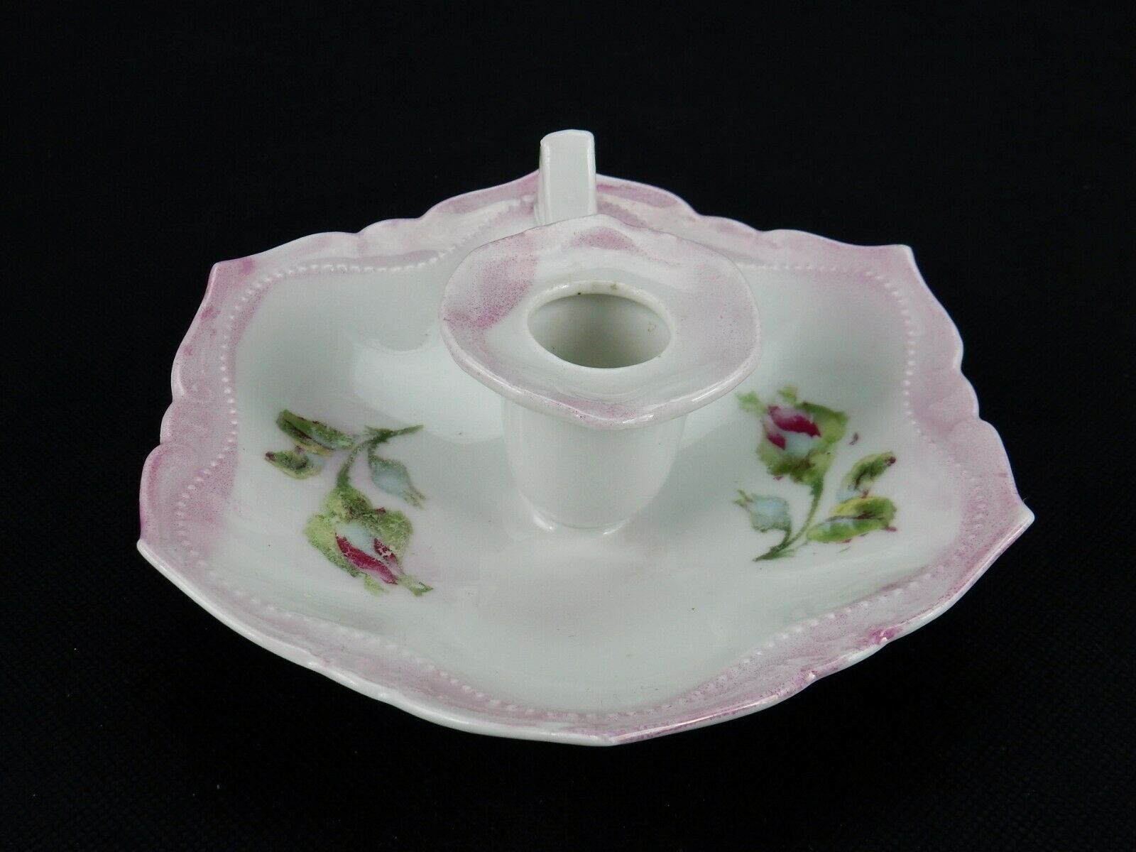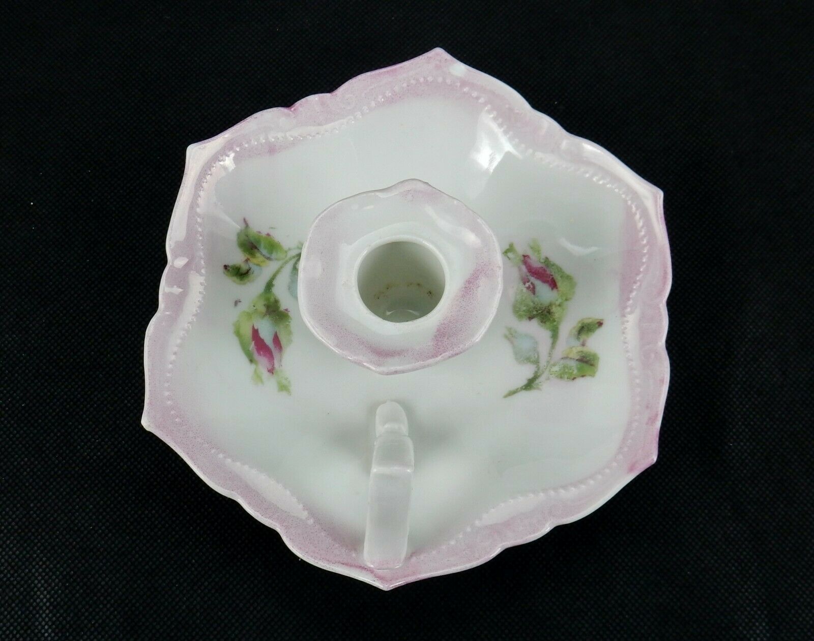 Glazed Porcelain Candlestick, Hand Painted Flowers, Pink Borders, Loop Handle