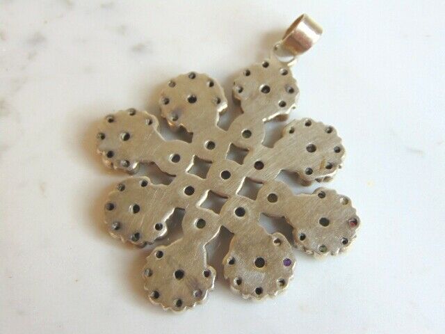 FOR SALE IS THIS WOMENS VINTAGE ESTATE STERLING SILVER MULTI STONE PENDANT . PENDANT WEIGHS 33.2g AND PENDANT MEASURES 2 7/8" LONG BY 2 1/4" WIDE. MAKES A GREAT GIFT FOR THAT SOMEONE SPECIAL. IF ANY QUESTIONS, PLEASE ASK. BE SURE TO CHECK OUT OUR OTHER ITEMS FOR SALE.