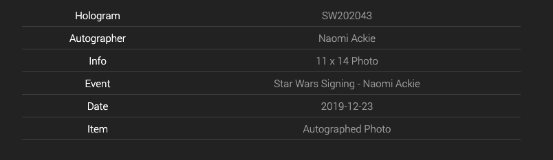 This item has been certified authentic by Star Wars Authentics which is run by Topps Trading Card Co. who is the official autograph and trading card partner of Star Wars via Lucas Film Limited. This is the best authentication you can get for Star Wars autographs as the autographs are guaranteed by Lucas Films and Topps. You can verify the authenticity of this item by heading to the Star Wars Authentics website and typing in the code number found on the hologram number. We have already done this but have taken a screenshot of the authenticity as verified in their database which includes the exact day this photo was signed!
