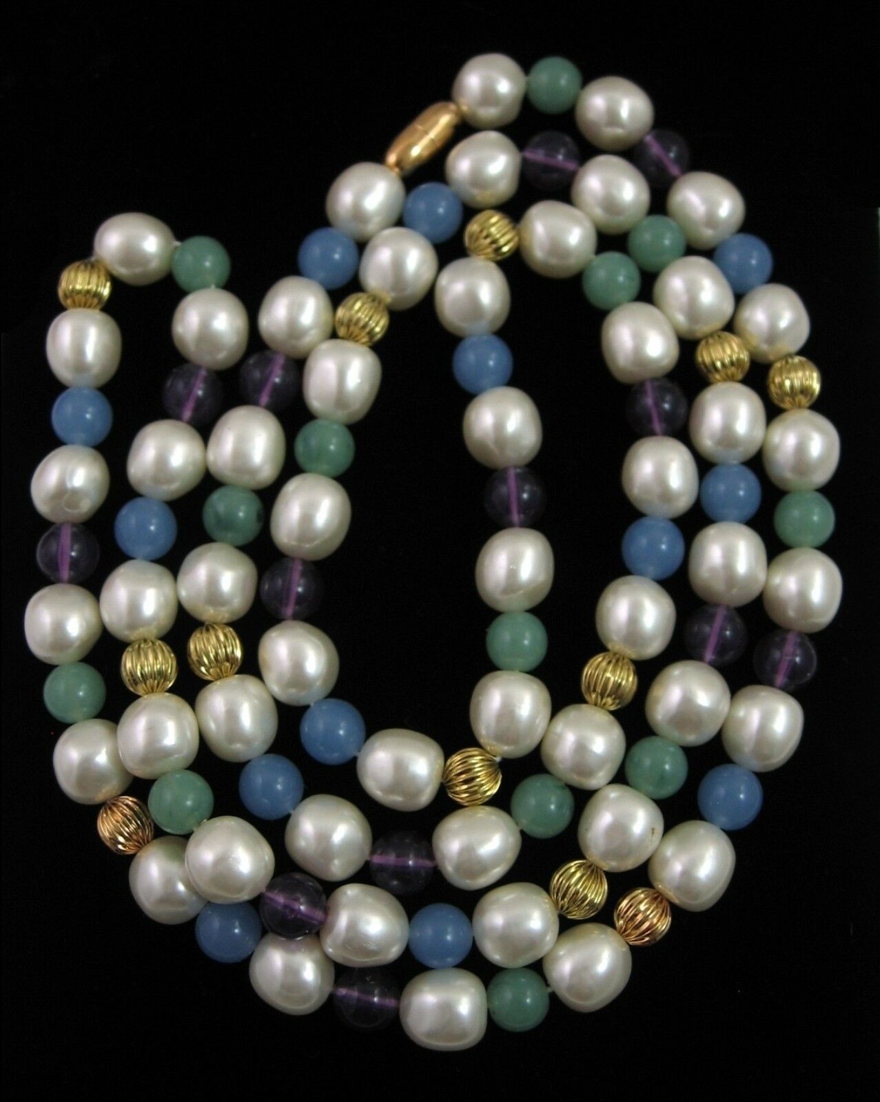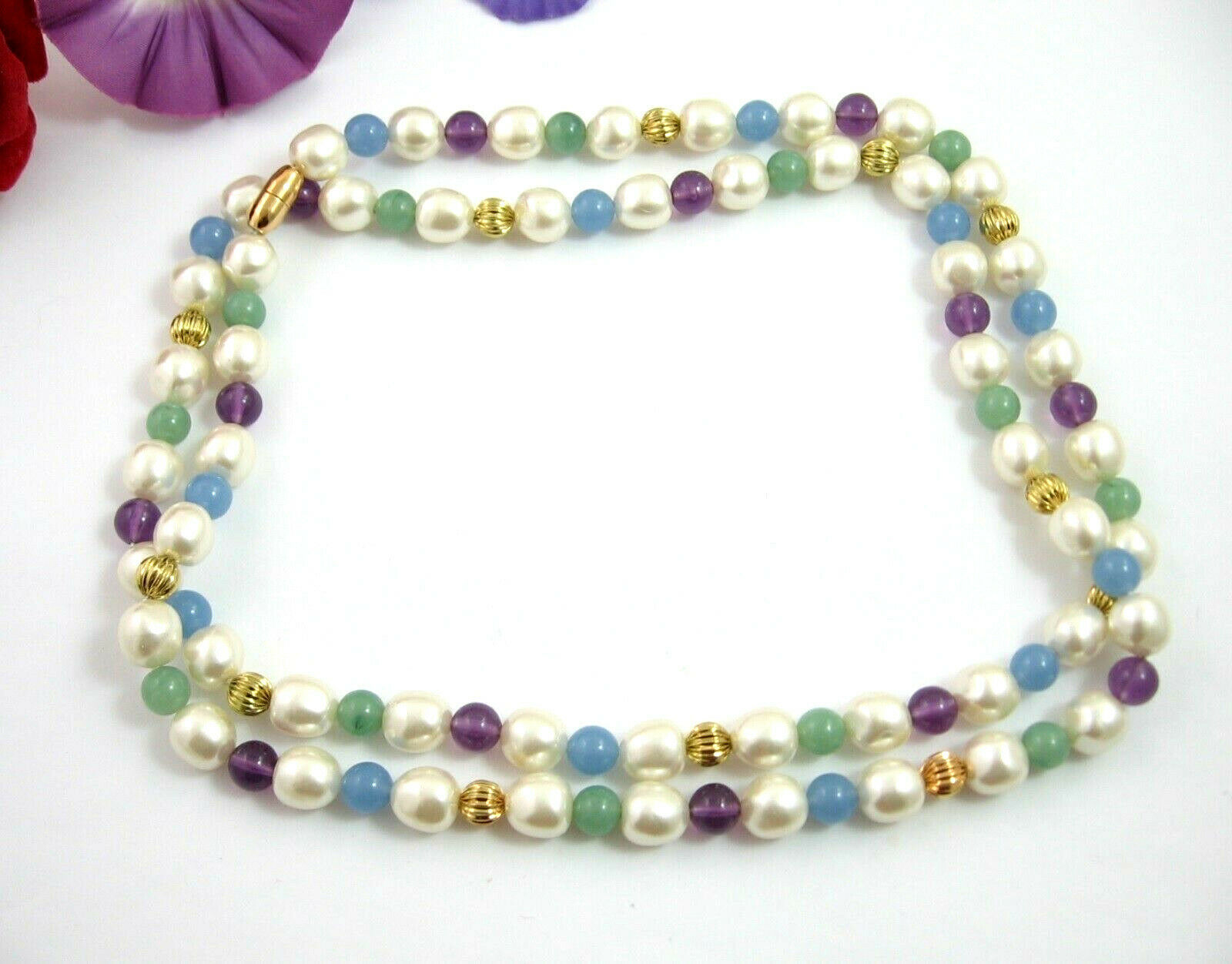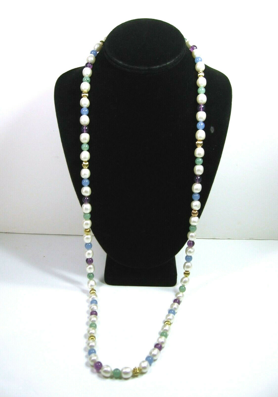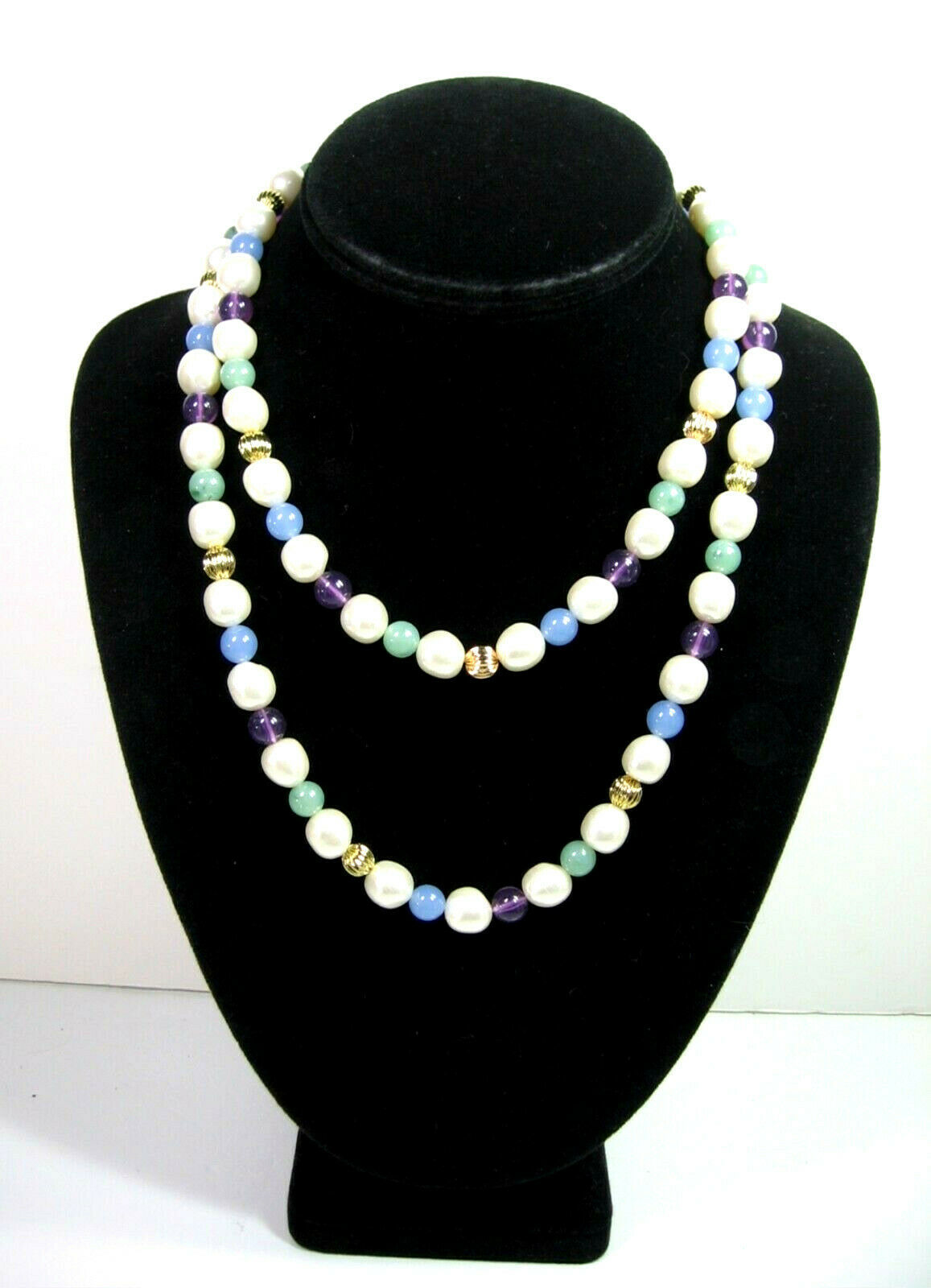 White PURPLE BLUE MINT GREEN BEADED Necklace 4 Color Beads Vintage Goldtone 36"