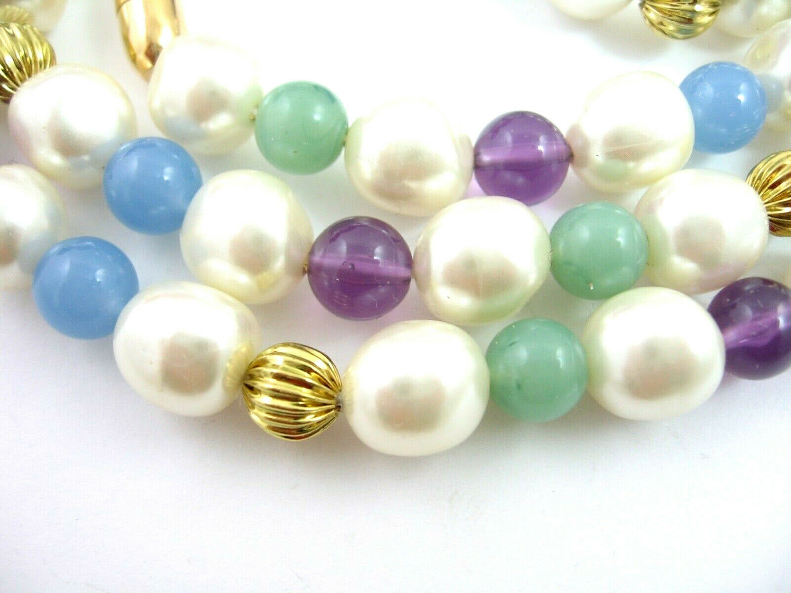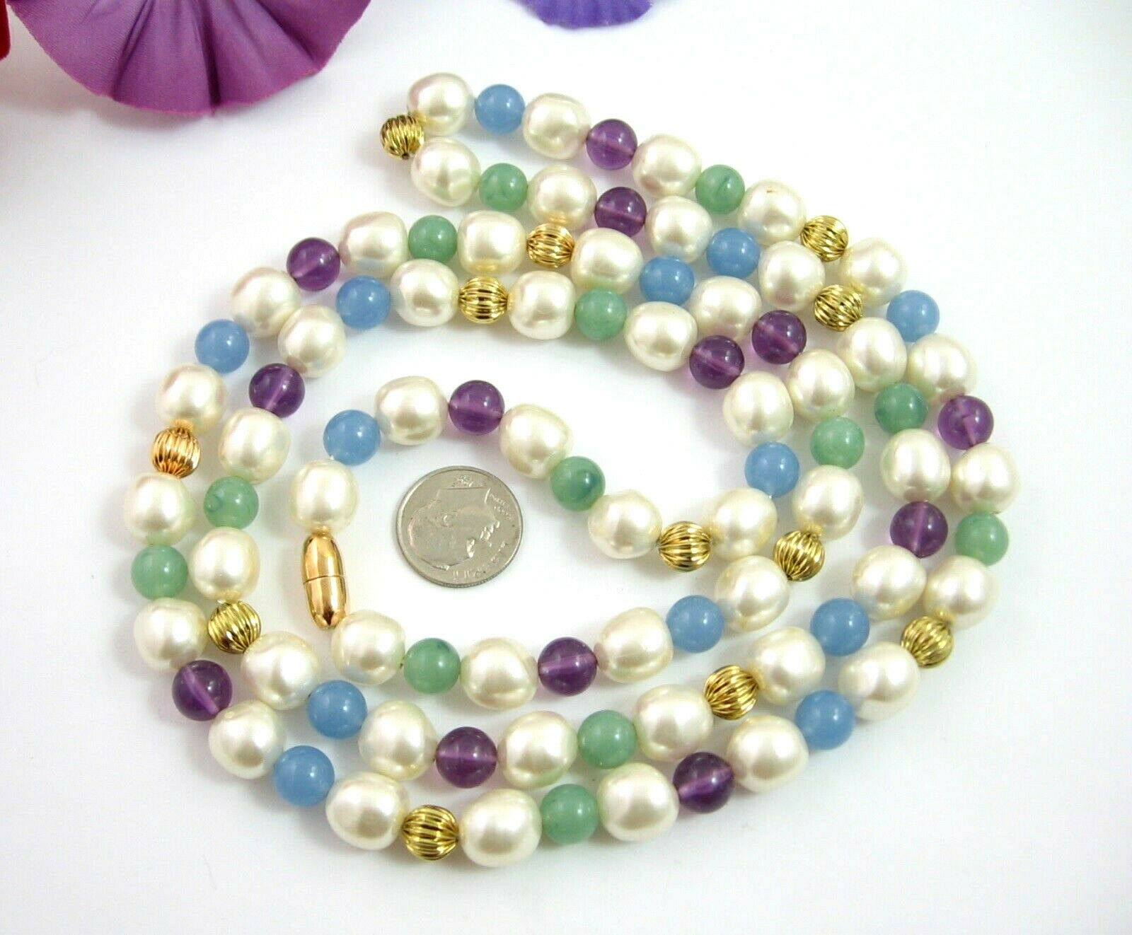 White PURPLE Light BLUE MINT GREEN BEADED Necklace Beads Vintage Goldtone 36"