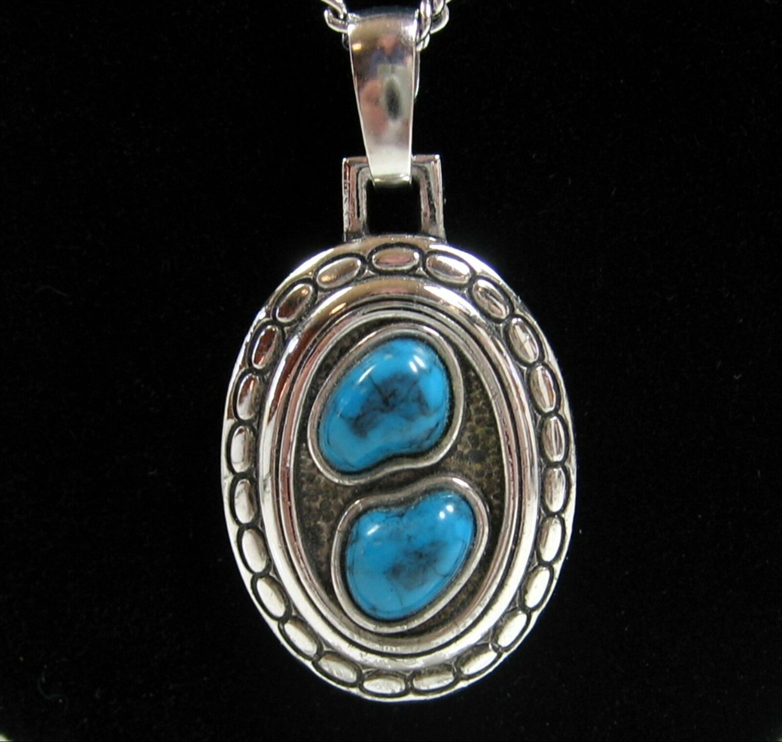 In a silvertone metal, this vintage chain necklace holds an oval pendant with a pair of imitation turquoise stones!