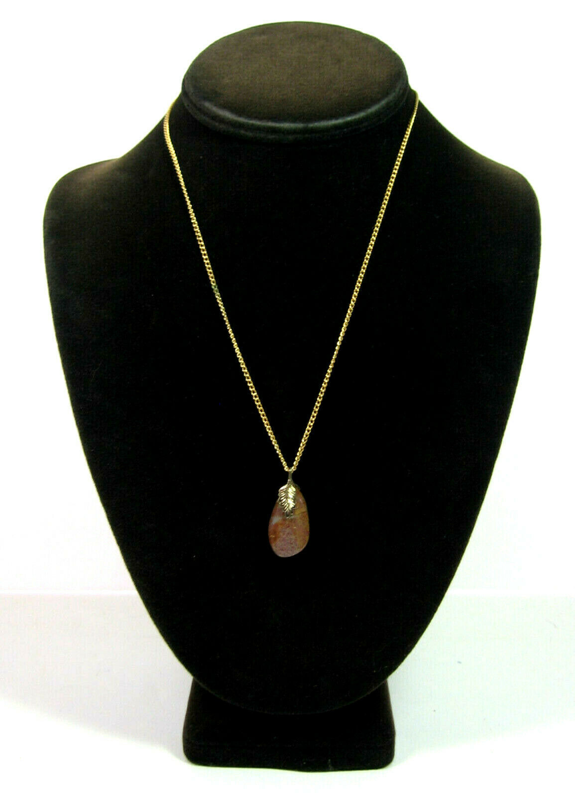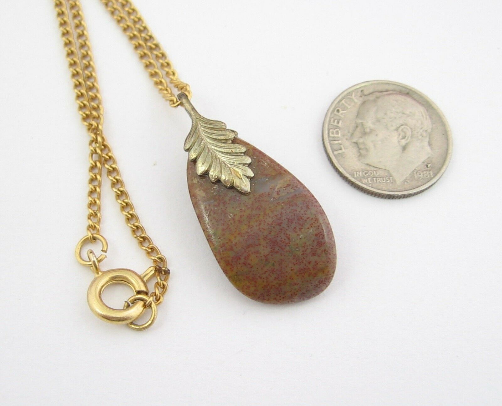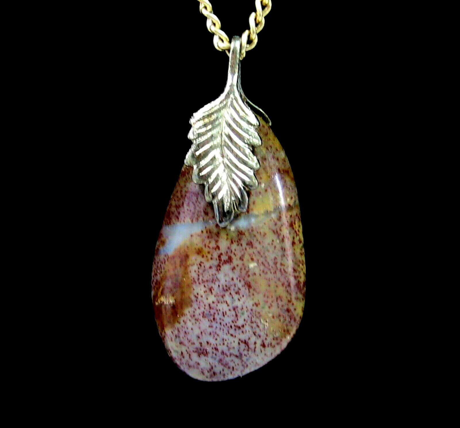 GRAY With RUST RED Speckles Dots Agate Stone Pendant Vintage Necklace Goldtone