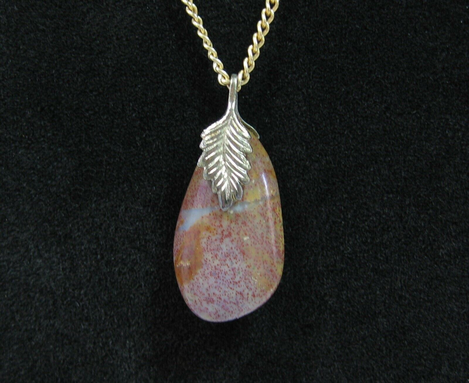 Hanging from a goldtone metal chain is this piece of polished GRAY with RED SPECKLED POLISHED STONE PENDANT!