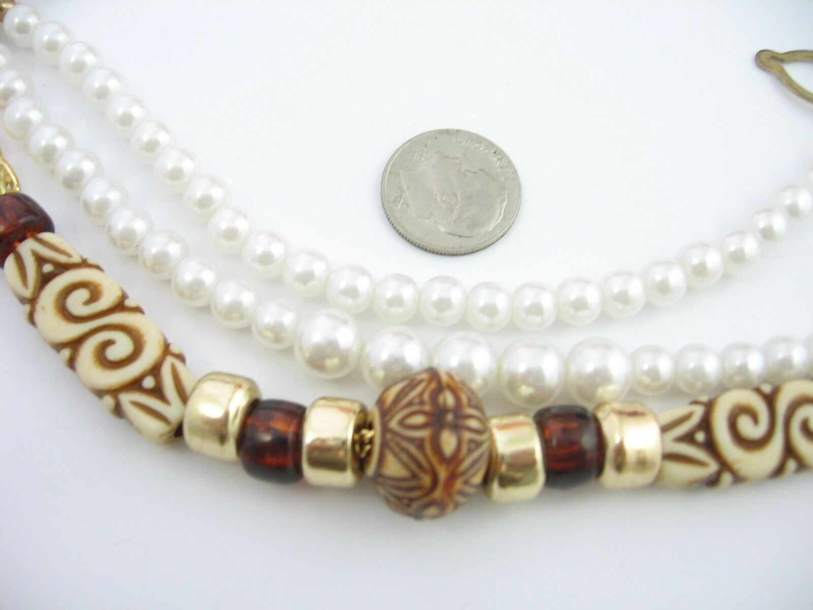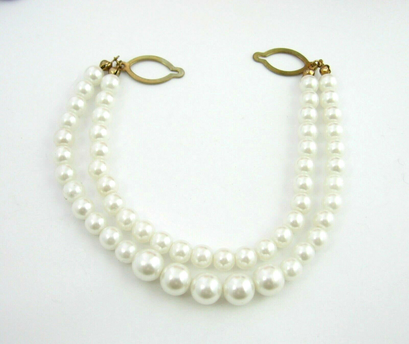 FAUX PEARL BEADS -- this one has two strands of off white plastic faux pearl beads. They drape, so the lower strand appears "longer" and has larger beads in the center. The full length across the shortest strand is 7 1/2", this includes the goldtone metal "loop hooks" on each end.