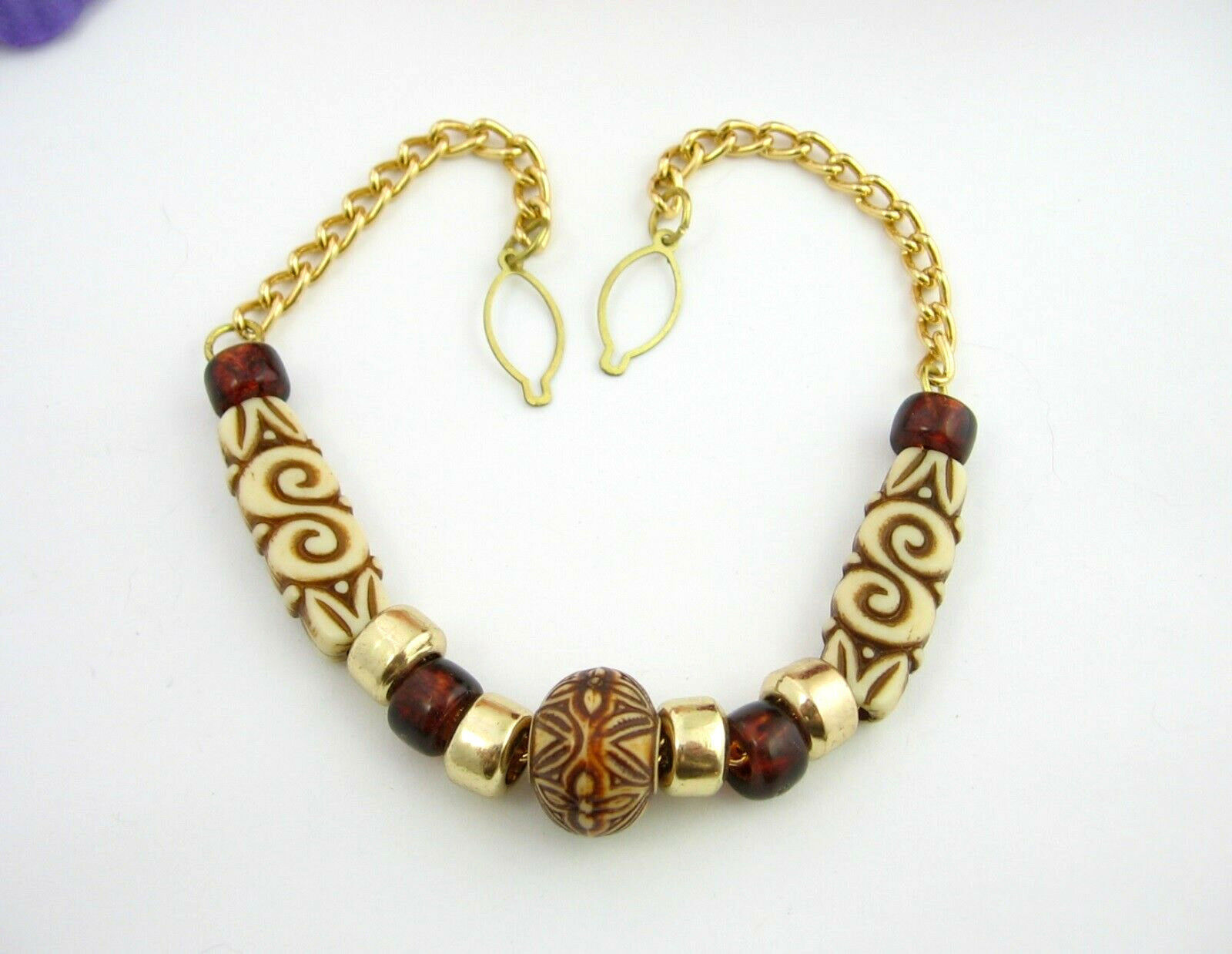 BROWN BEADS -- This one has a length of goldtone chain on either end. The beads in the center are in shades of cream to brown and are all made of plastic. A pair of rectangular cream beads have an "S" swirl design on each one. The full length is 11 1/2" including the metal loop hooks on both sides.