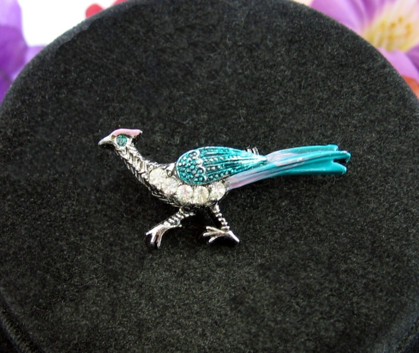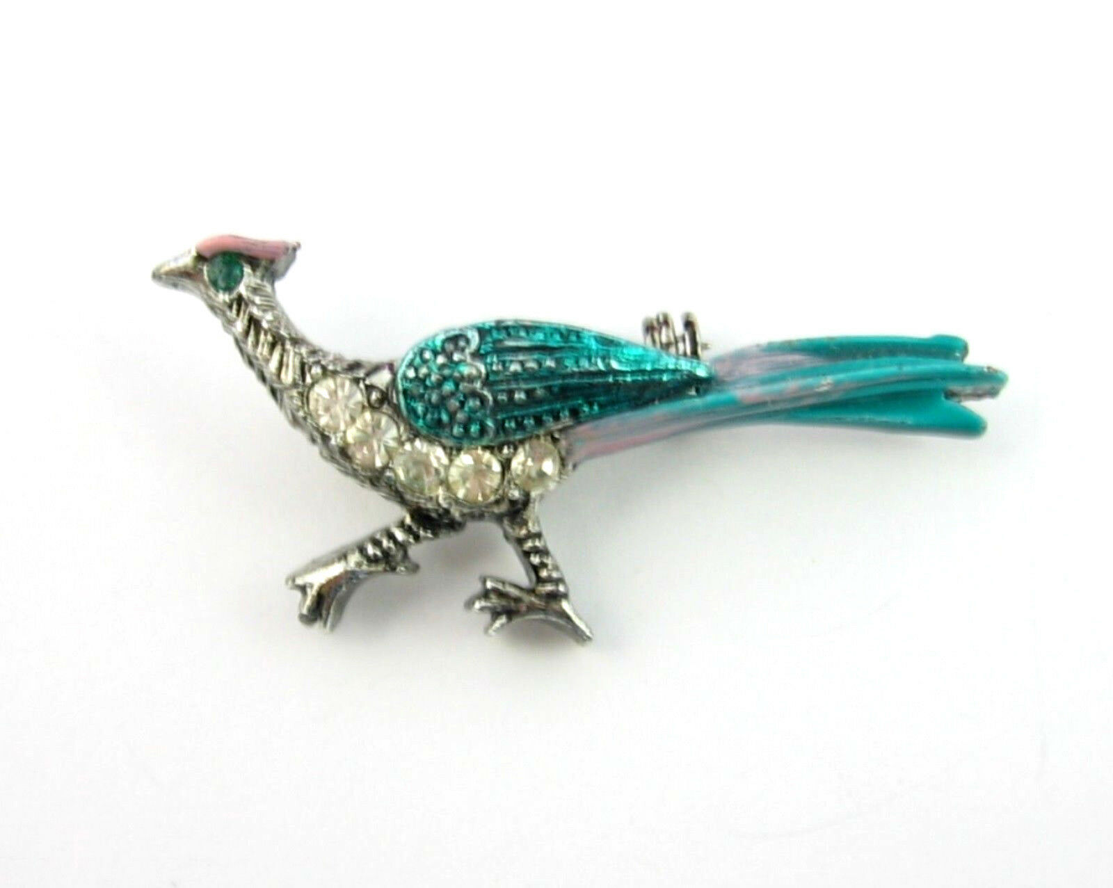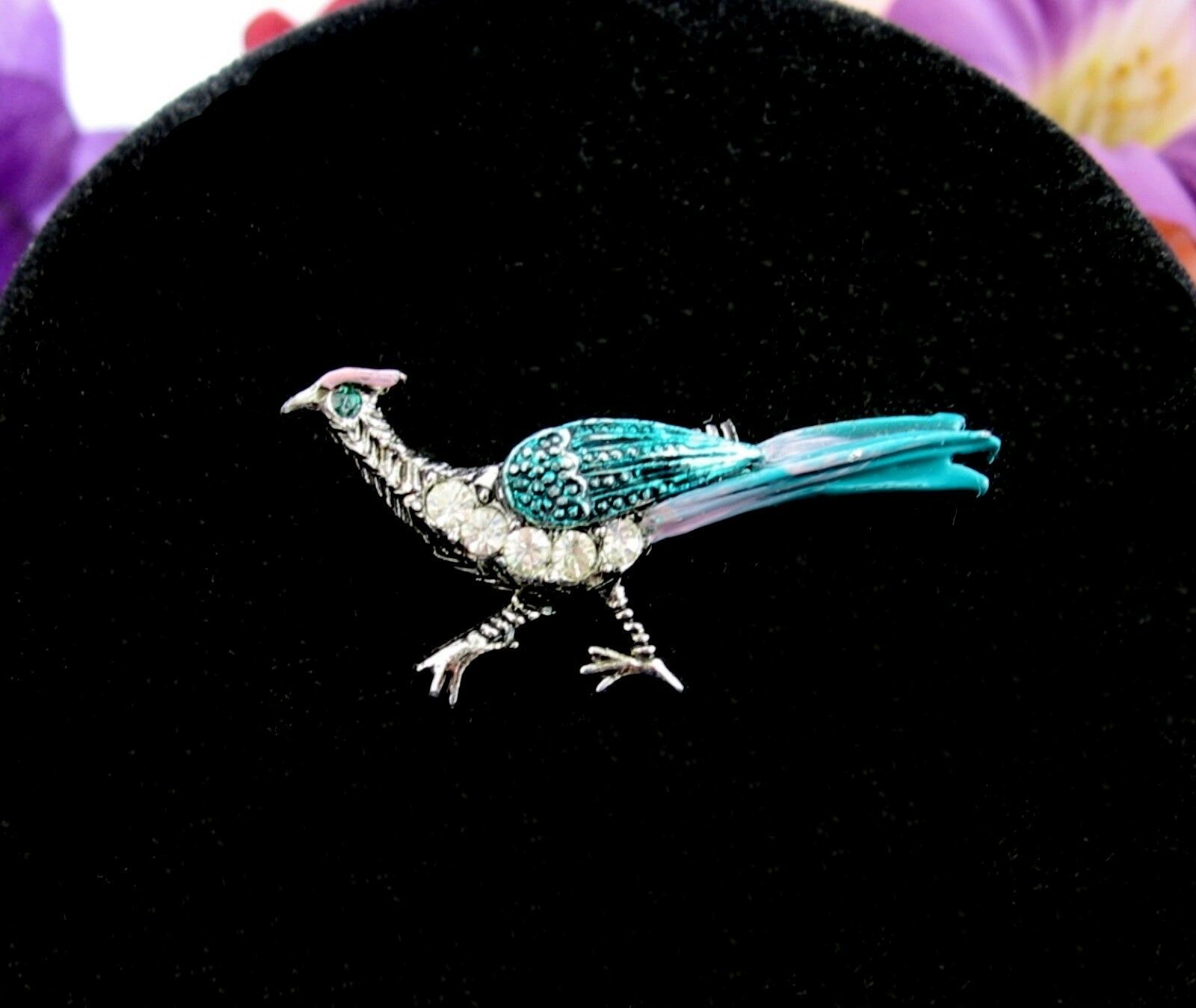 Blue Green PHEASANT PIN Vintage Brooch Wild Bird Rhinestones Enamel Silvertone