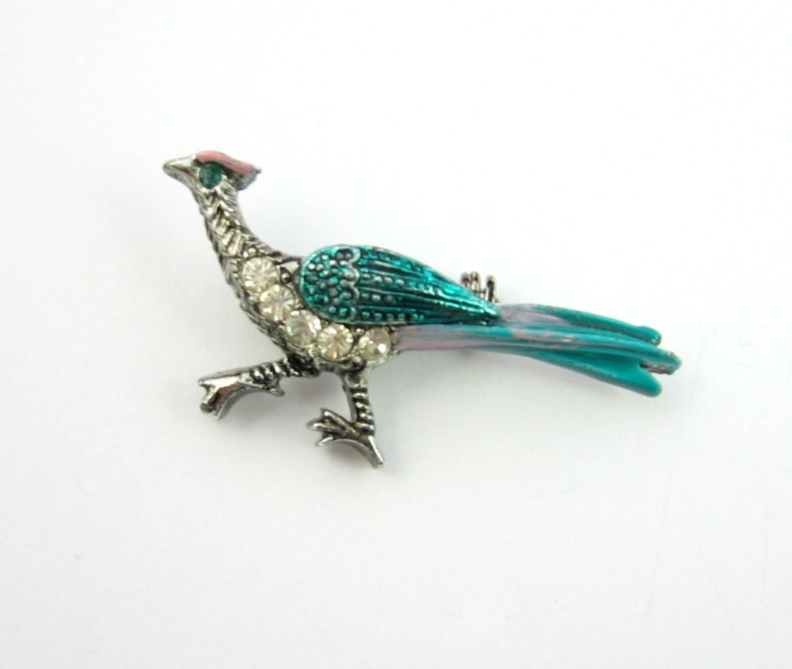 PHEASANT PIN Vintage Blue Green Brooch Wild Bird Rhinestones Enamel Silvertone