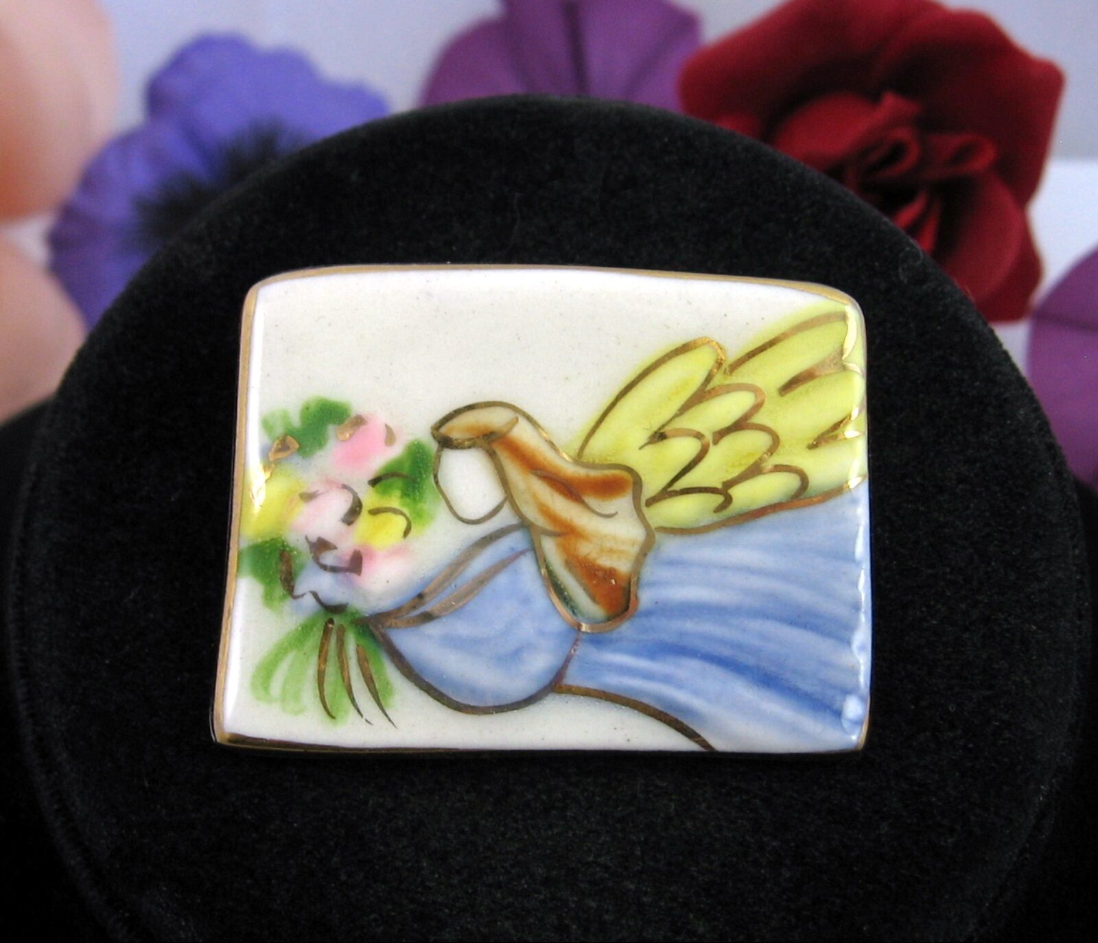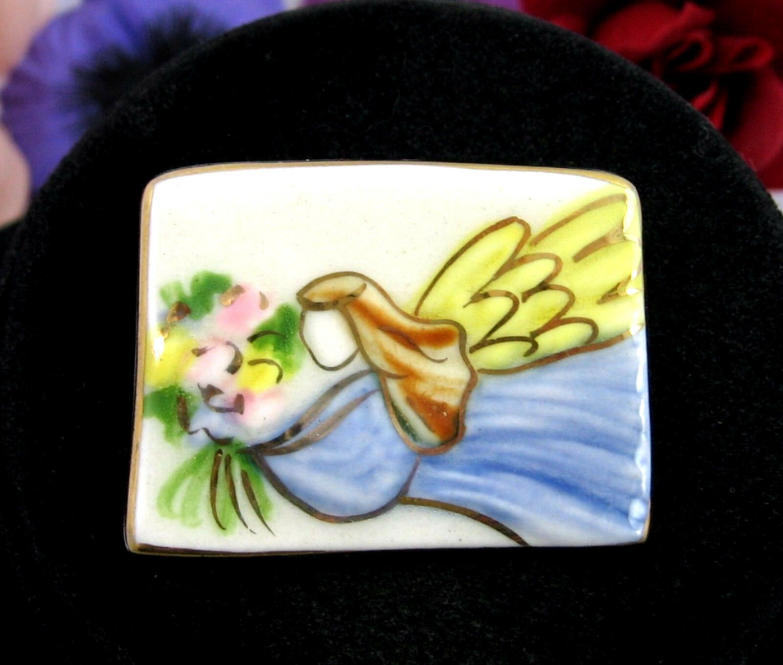 ANGEL with FLOWERS Ceramic BROOCH Vintage Pin Goldtone Accents Hand Crafted