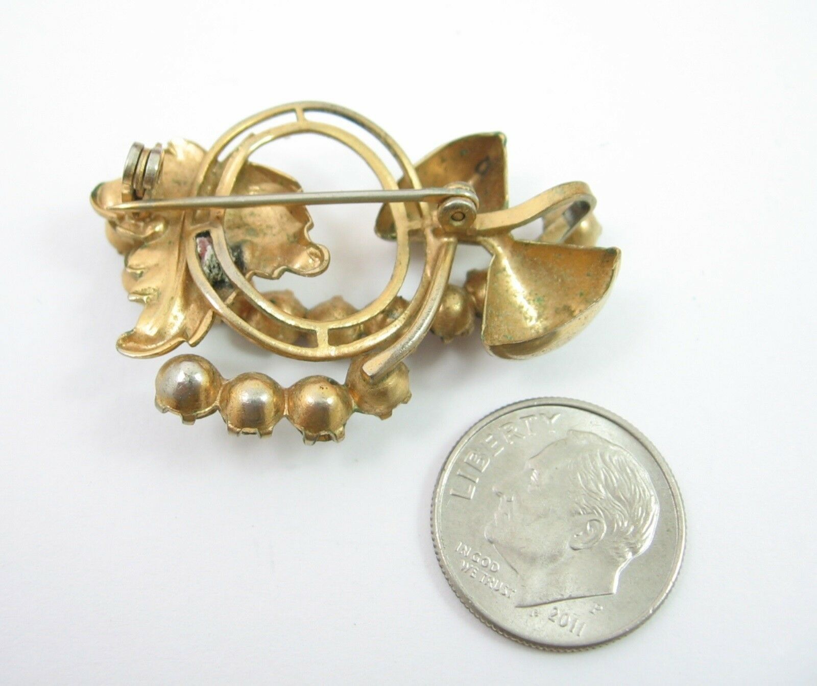 Connecting the two is a double circle ring. Over top connecting the hourglass to the leaf is a row of red round cut rhinestones with three clears on top of the leaf.