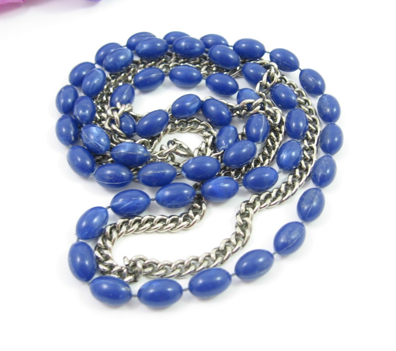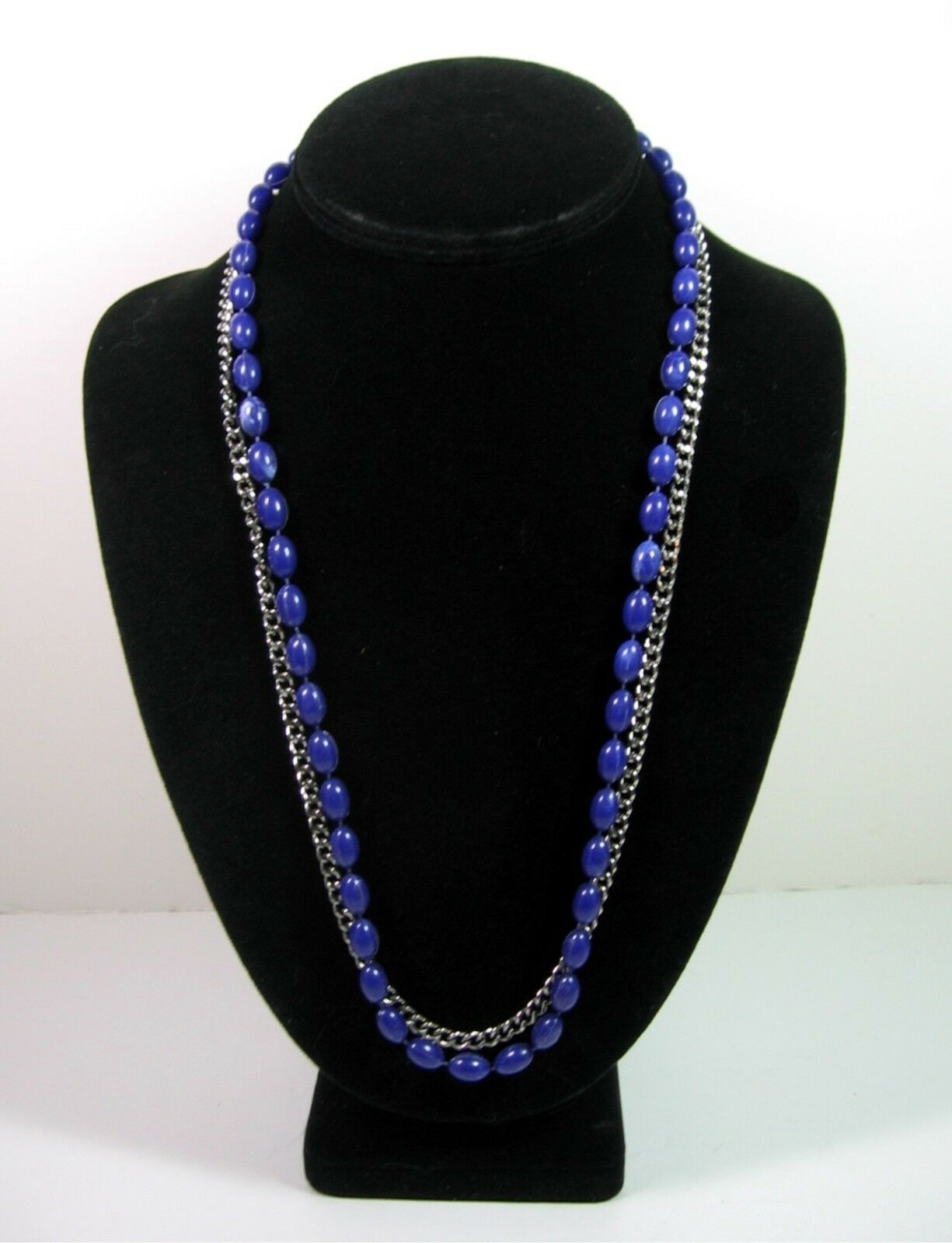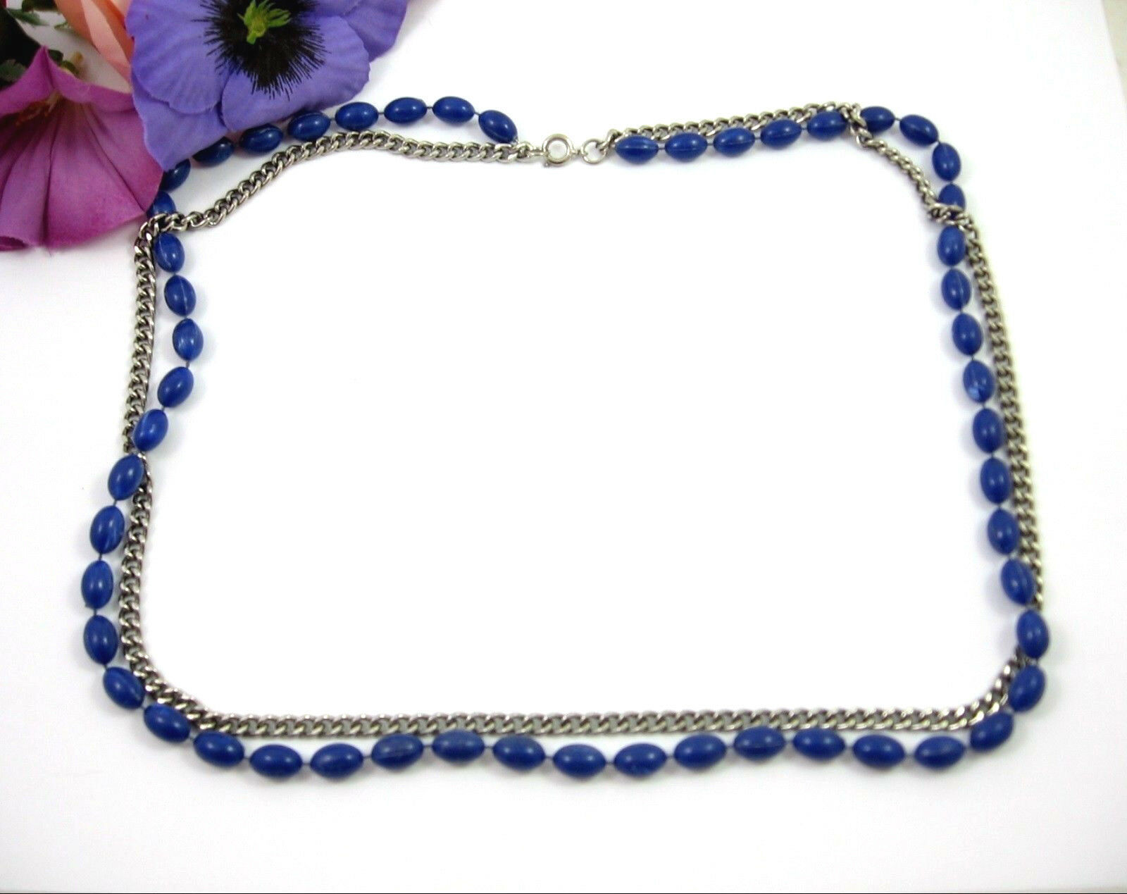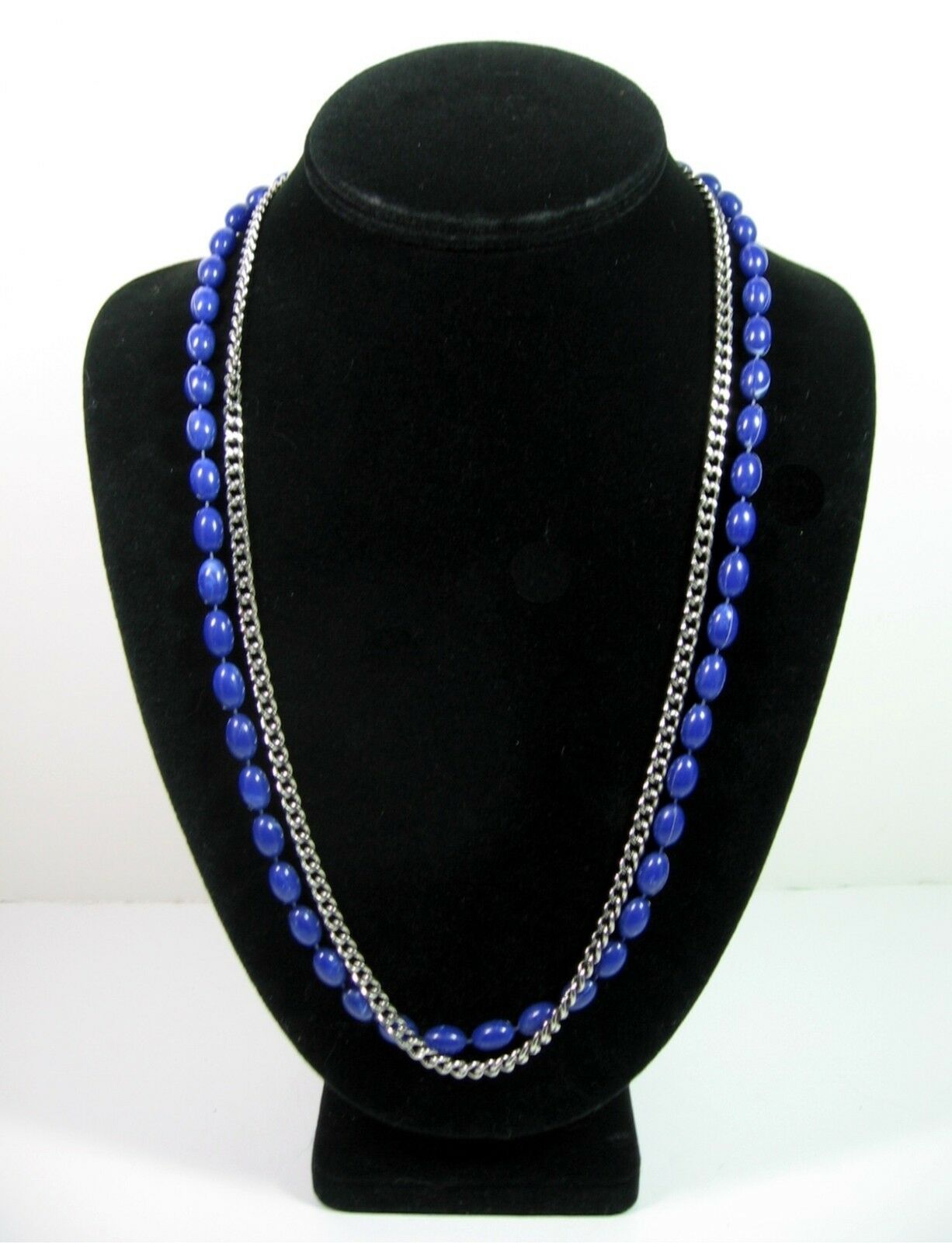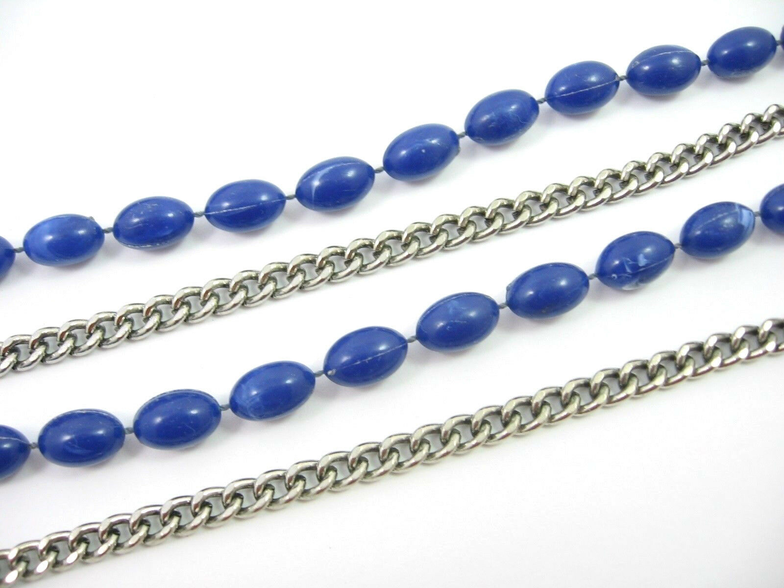 This necklace is a double strand. One strand consists of blue plastic oblong beads, the other strand is a silvertone metal chain!