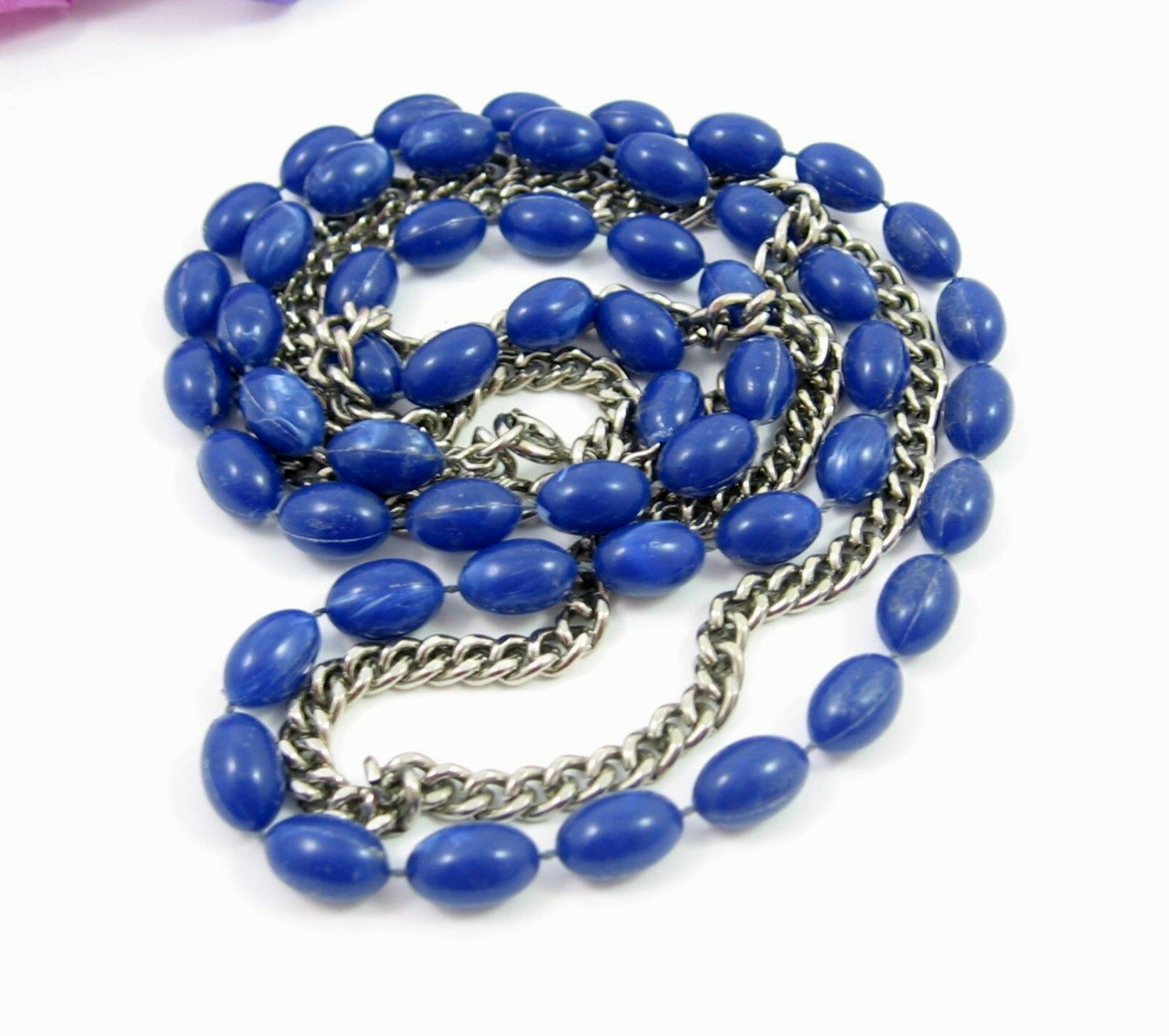 This is a vintage BLUE PLASTIC BEAD and SILVERTONE METAL CHAIN NECKLACE!