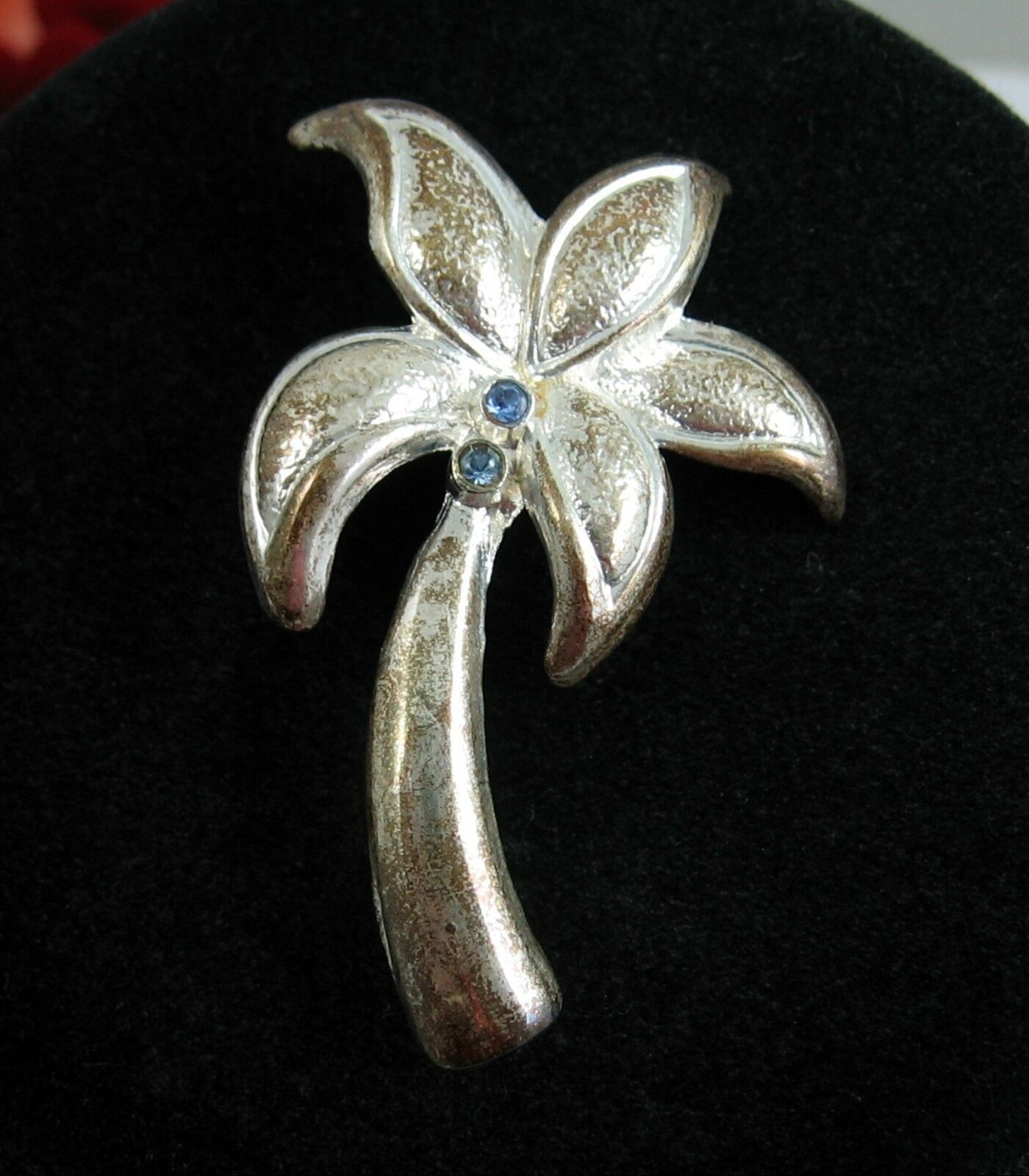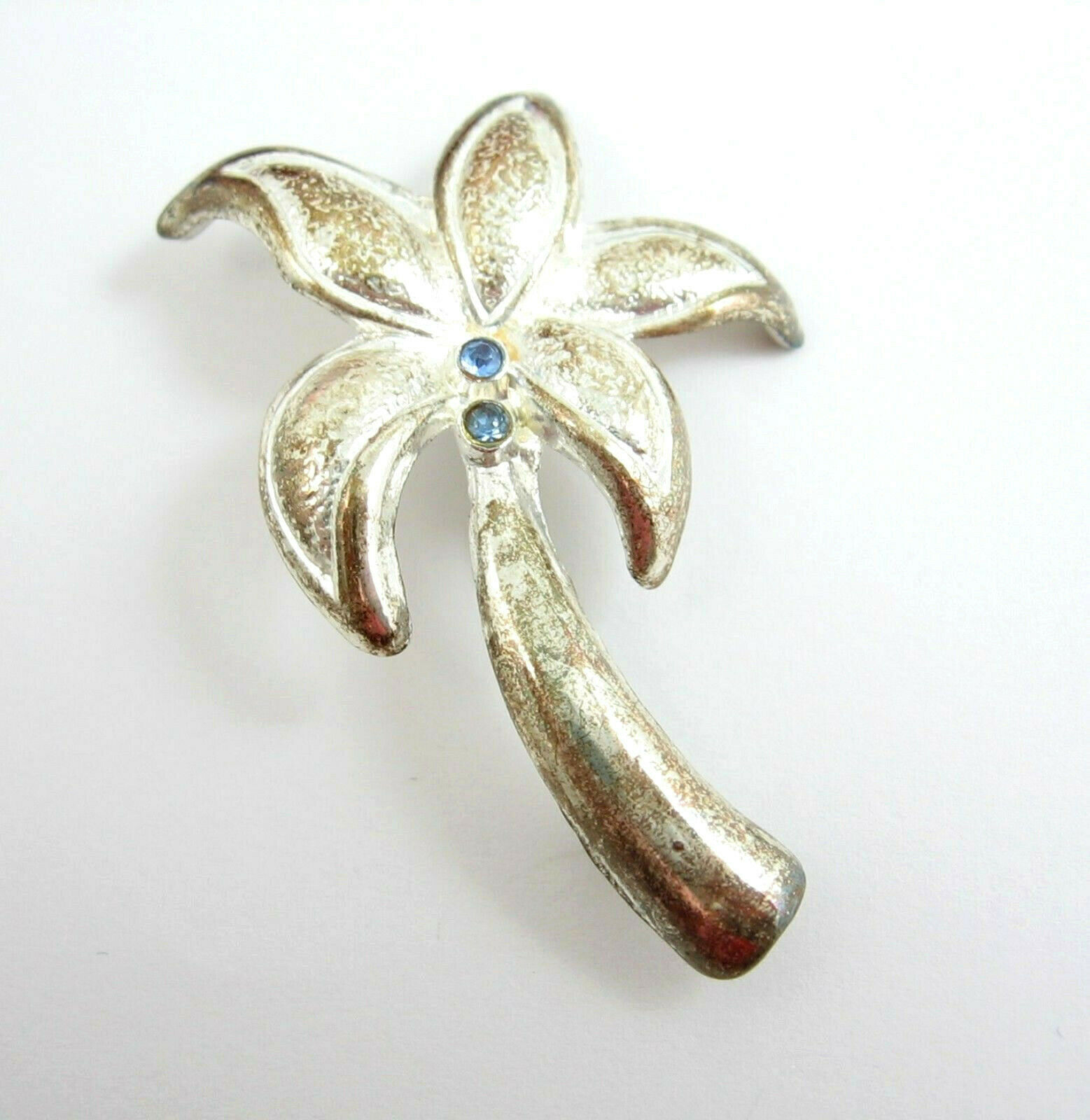PALM TREE PIN Vintage BROOCH Silverplate Blue Rhinestone Tropical Summer Jewelry
