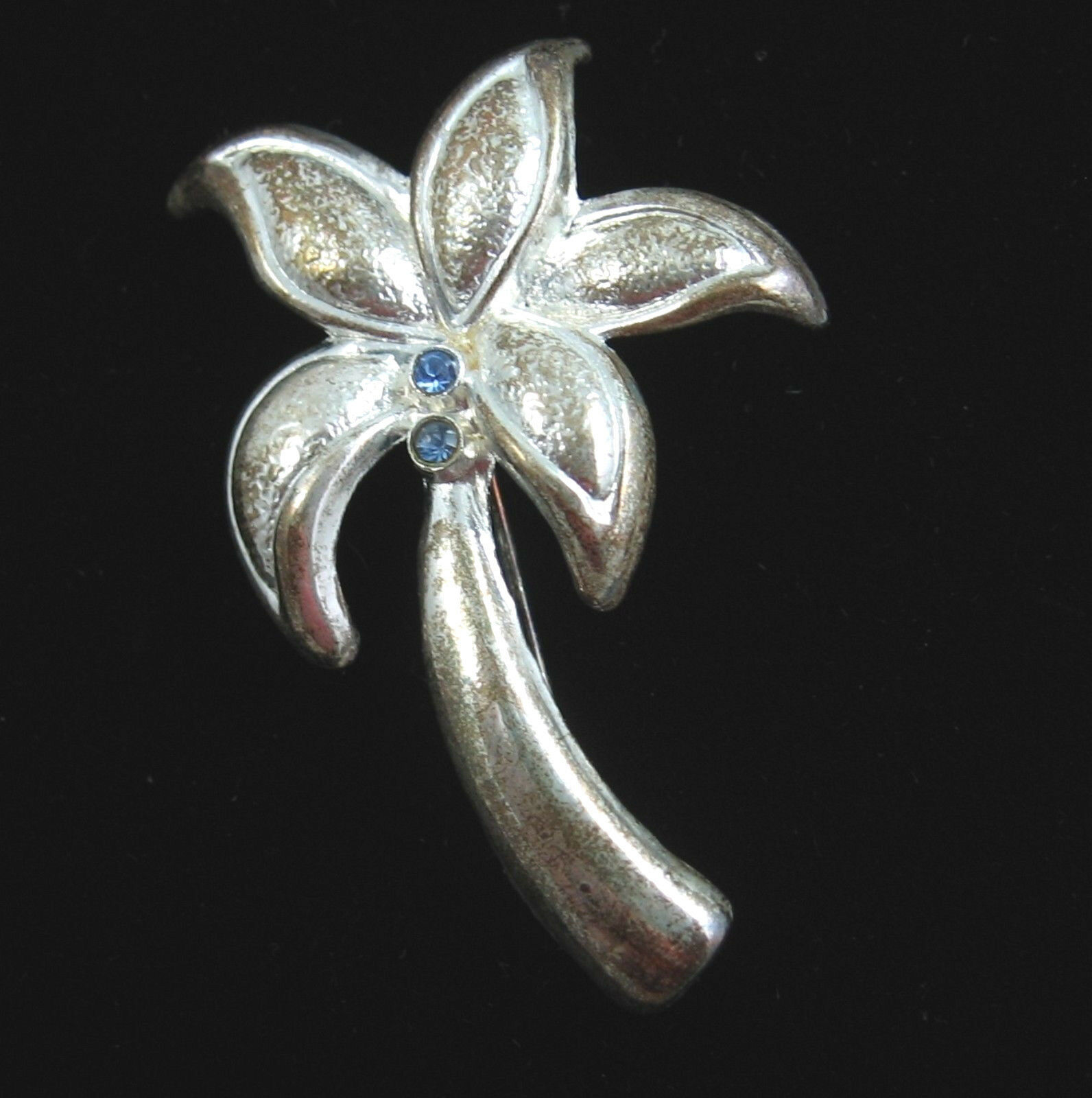 PALM TREE PIN Vintage BROOCH Silverplate Blue RHINESTONE Tropical Summer Jewelry