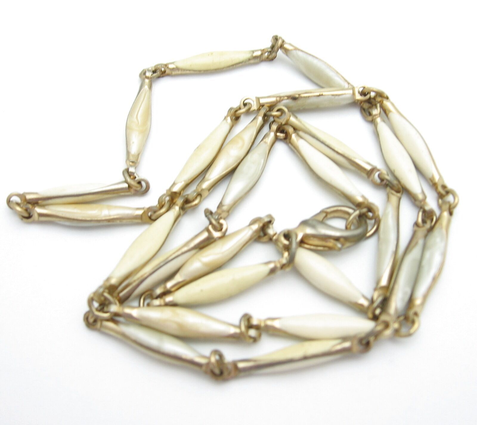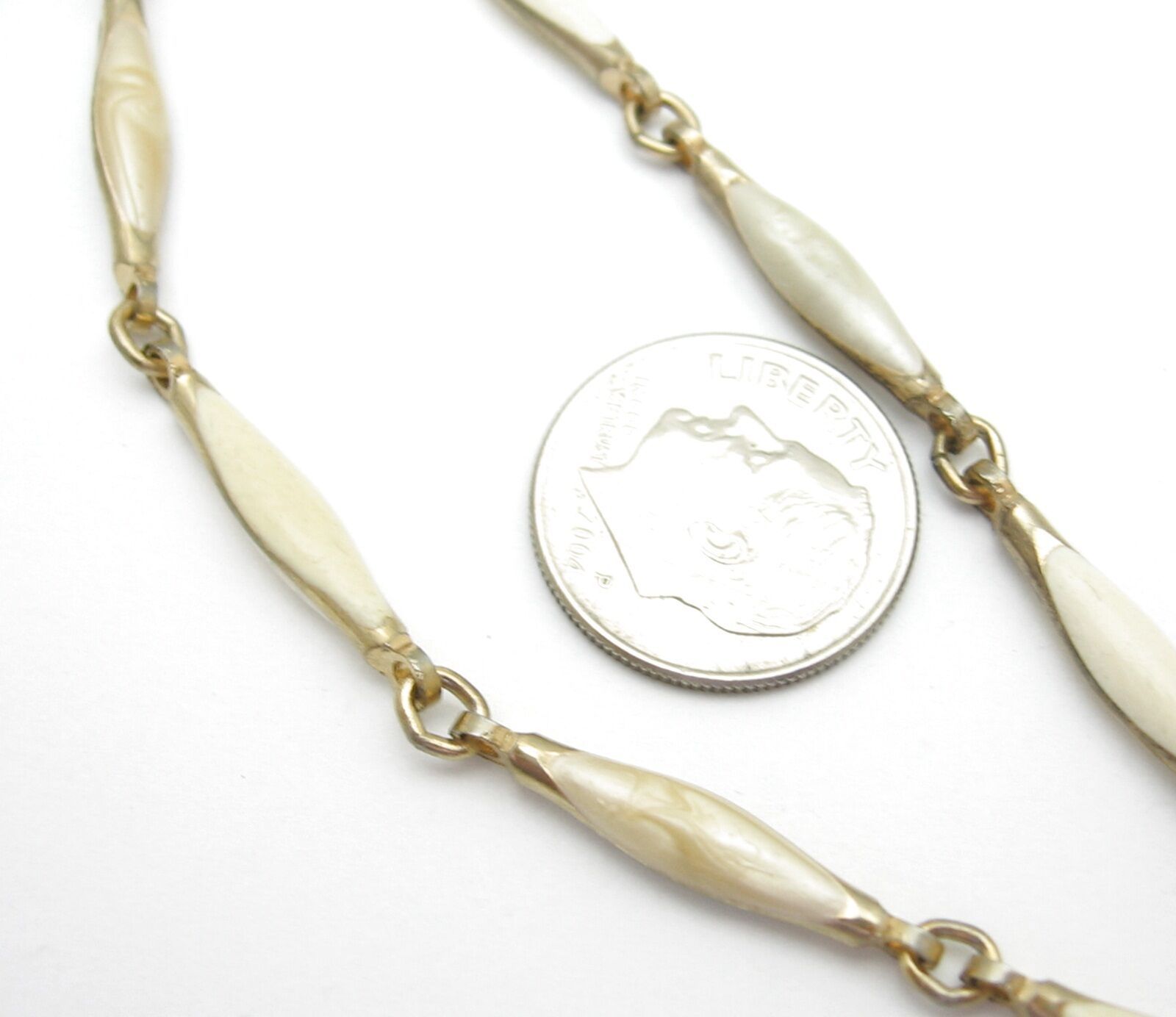 The NECKLACE is goldtone metal with creamy enamel accents on each link! It measures about 22" in length.