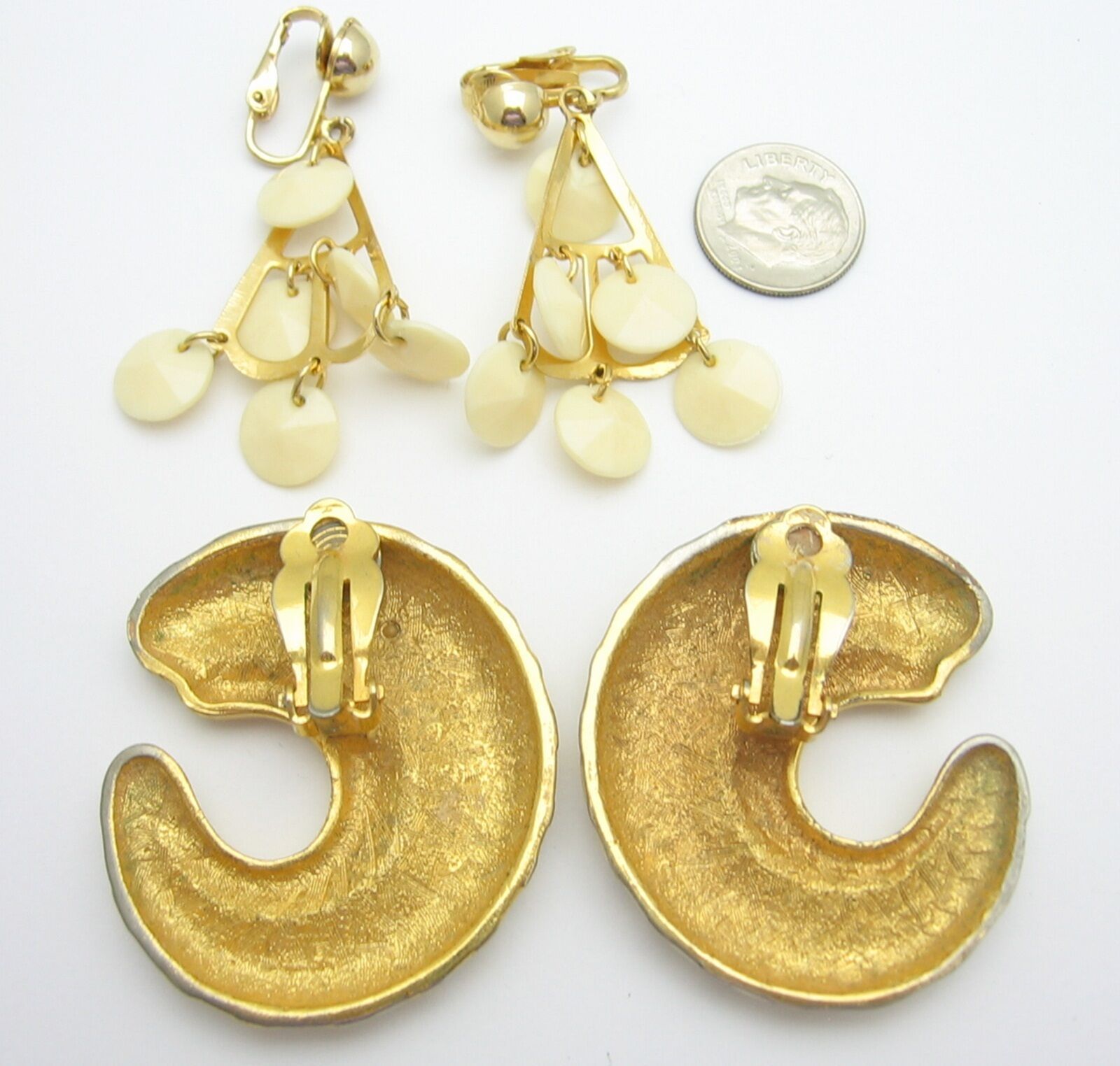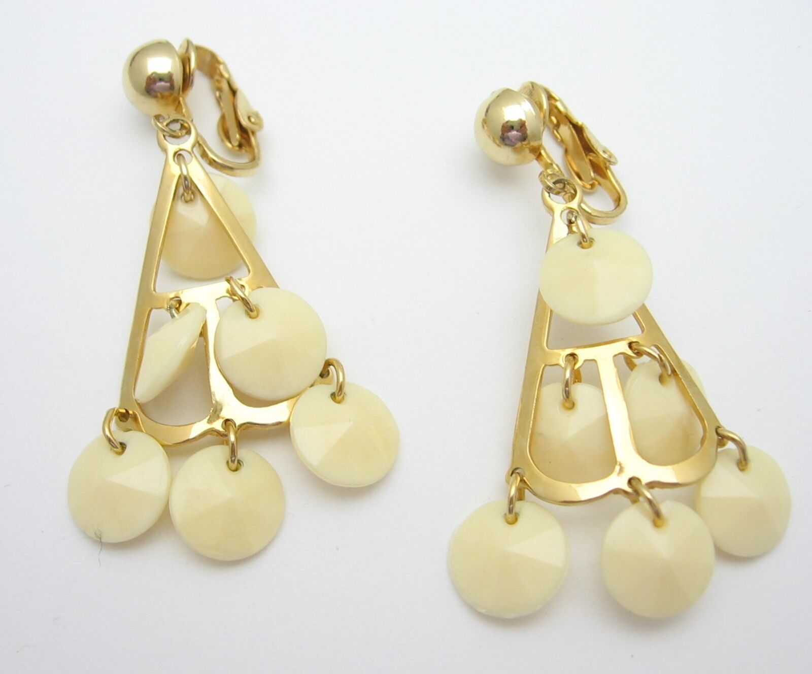 The second pair of EARRINGS are clip-on as well. Each one is a triangular shape with creamy ivorytone plastic dangling discs. They measure 2" in length.