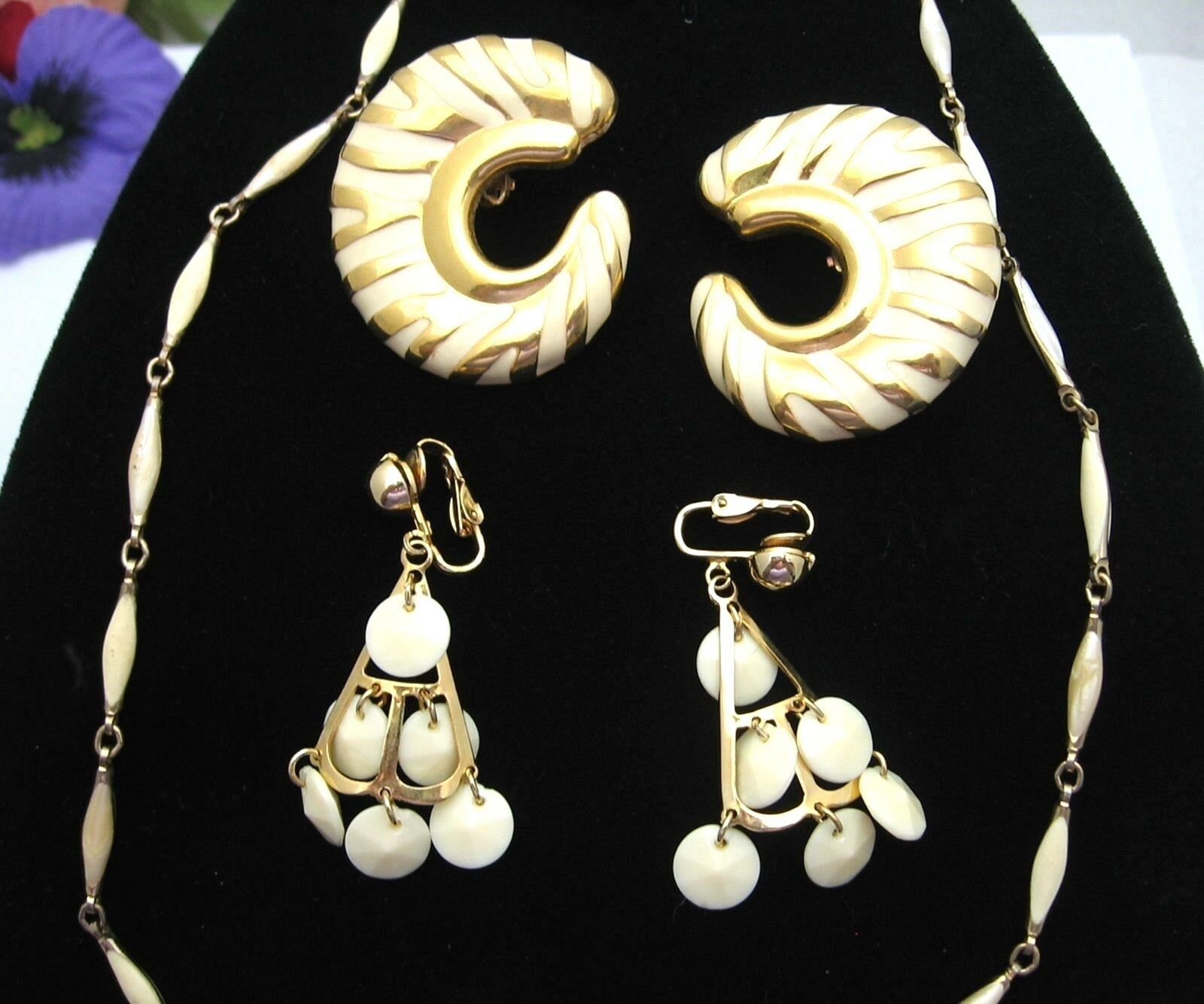 CREAMY ENAMEL Goldtone NECKLACE 2 PAIRS of EARRINGS! Vintage CLIP ONS