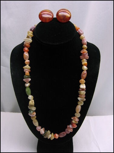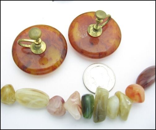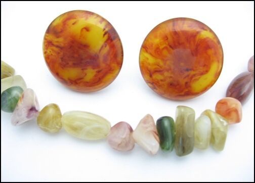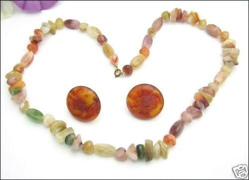 FAUX STONE Imitation NECKLACE Vintage BEAD Screw Back EARRINGS Browns Greens