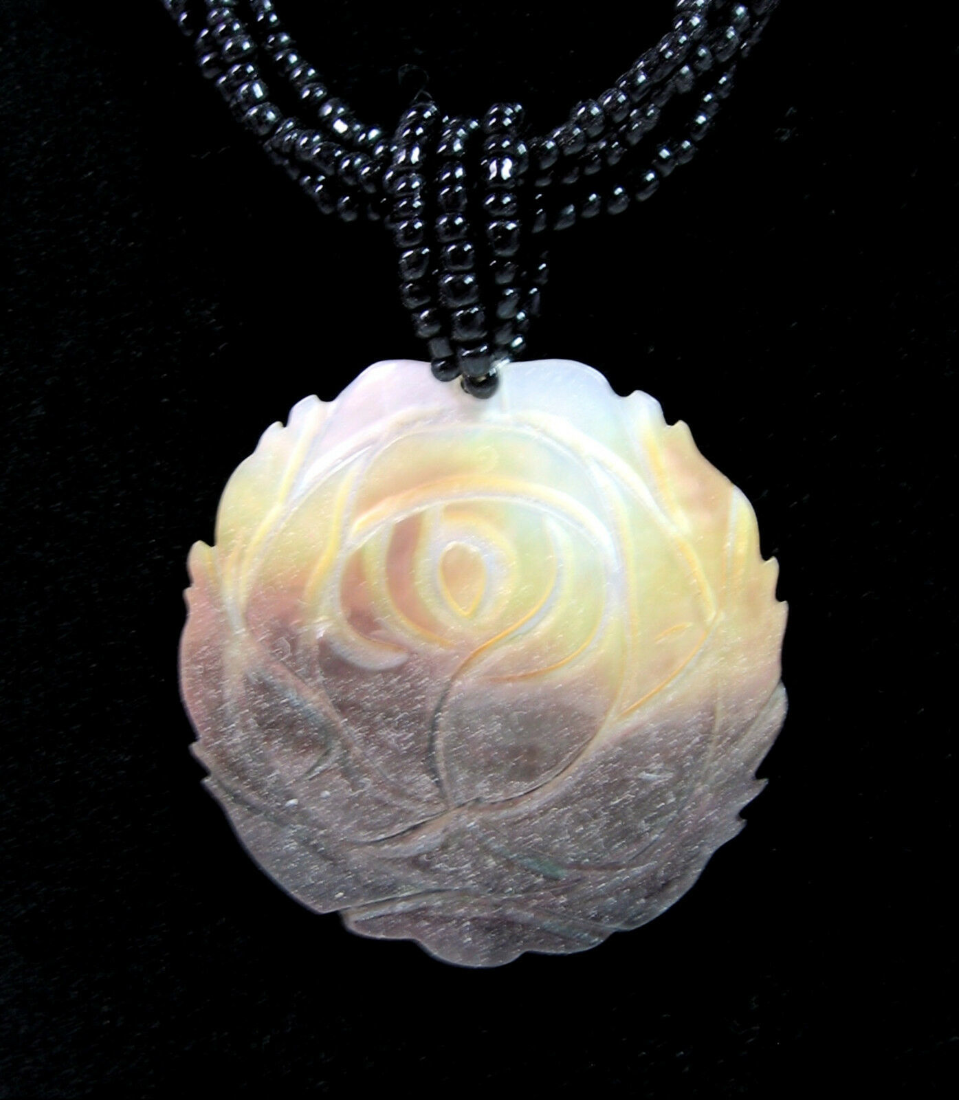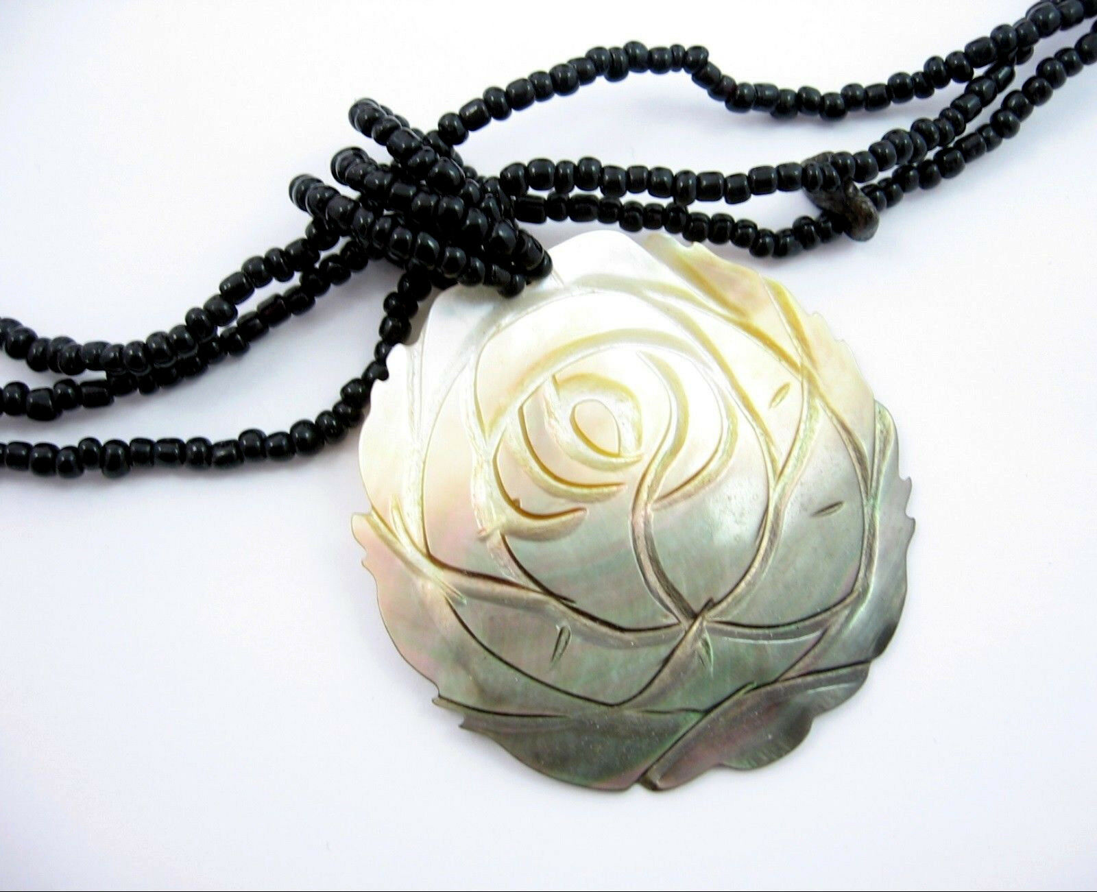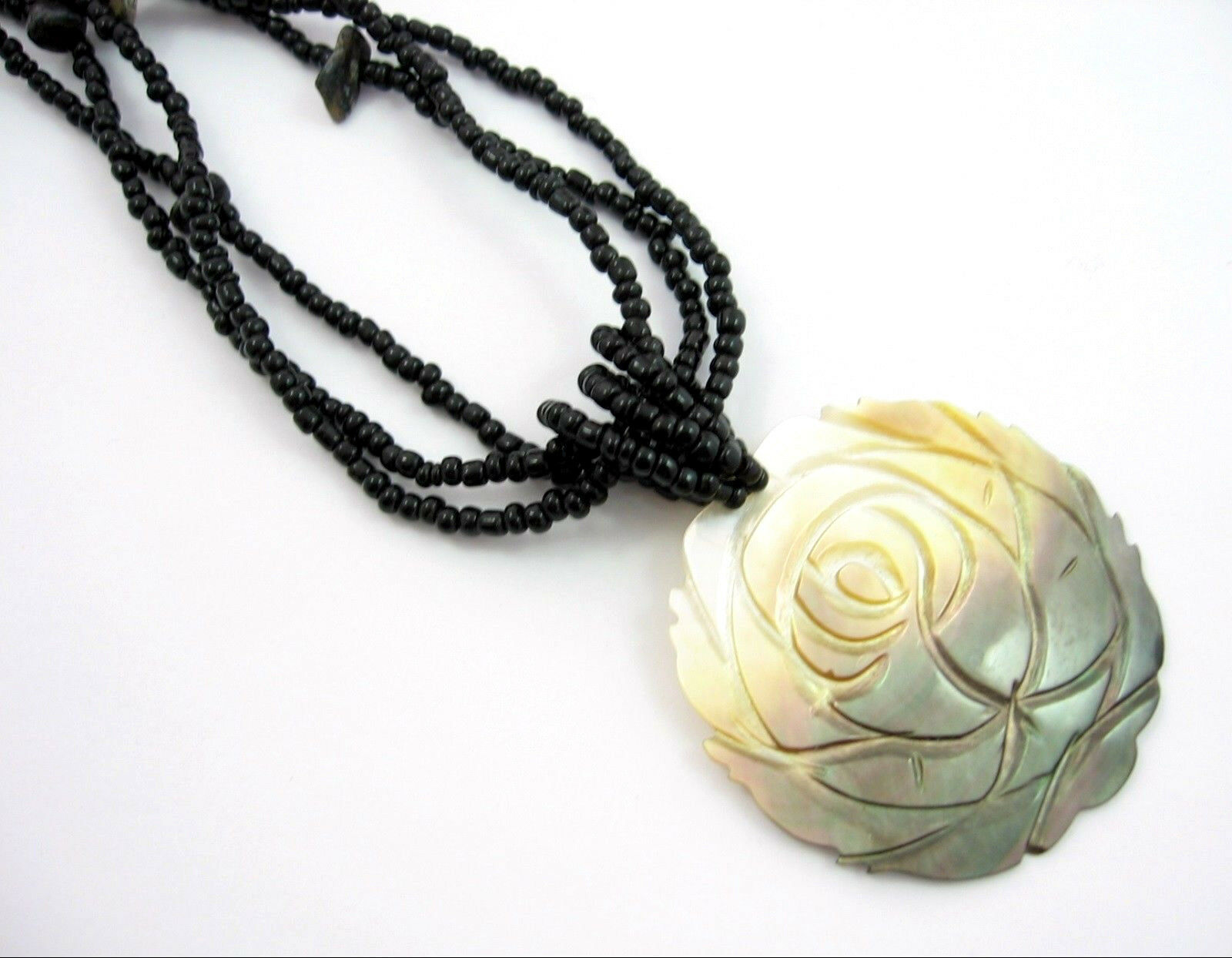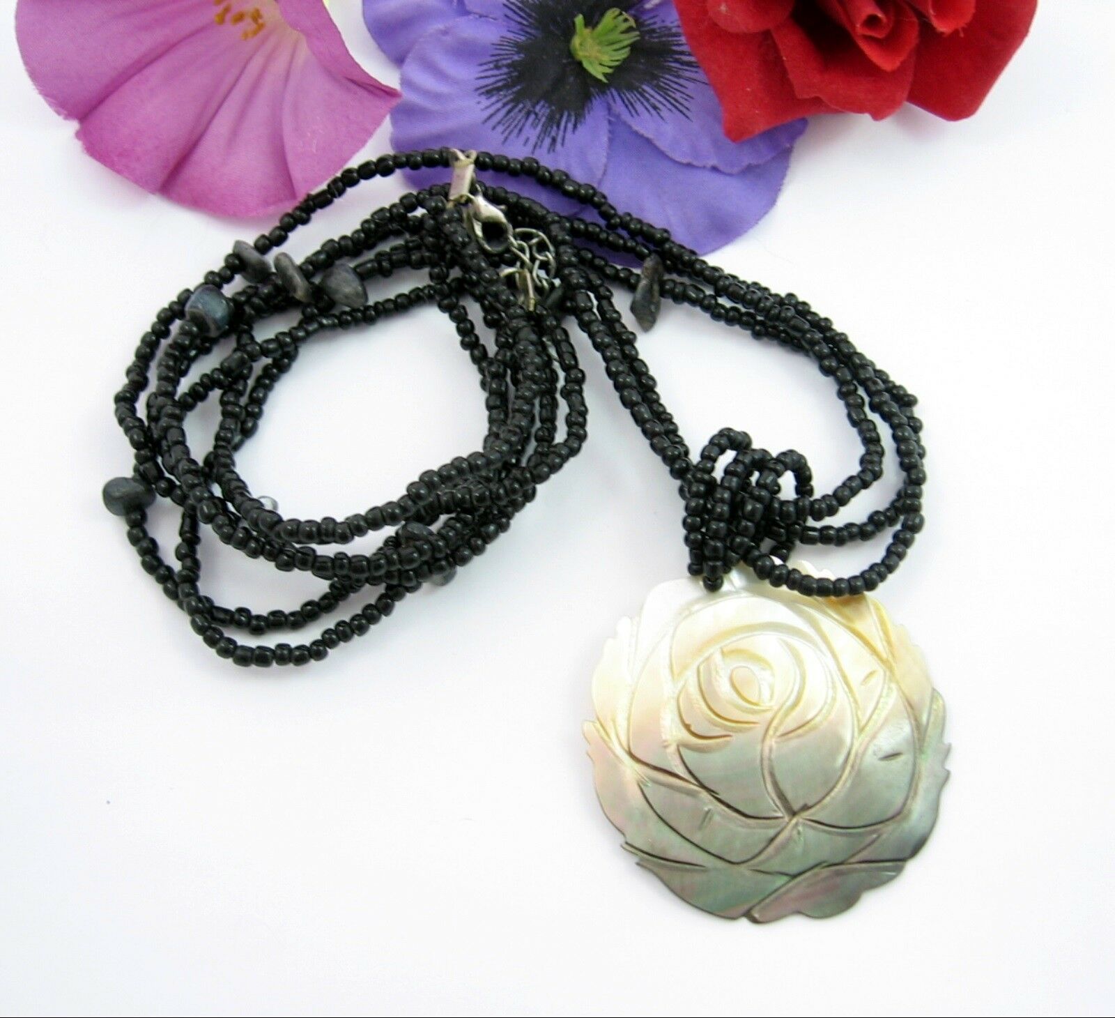 With three strands of BLACK GLASS SEED BEADS, this fabulous vintage NECKLACE has a CARVED MOTHER OF PEARL ROSE MEDALLION!