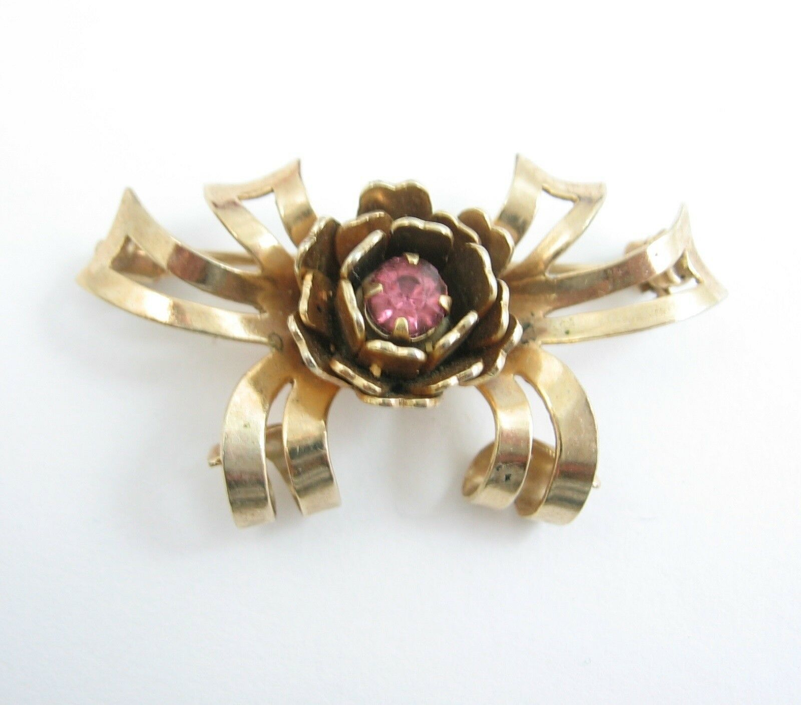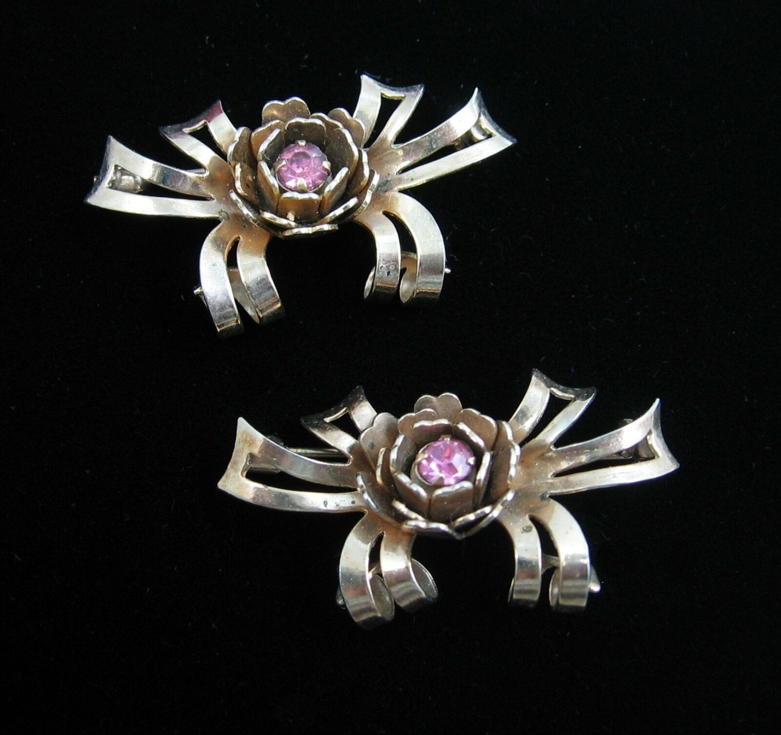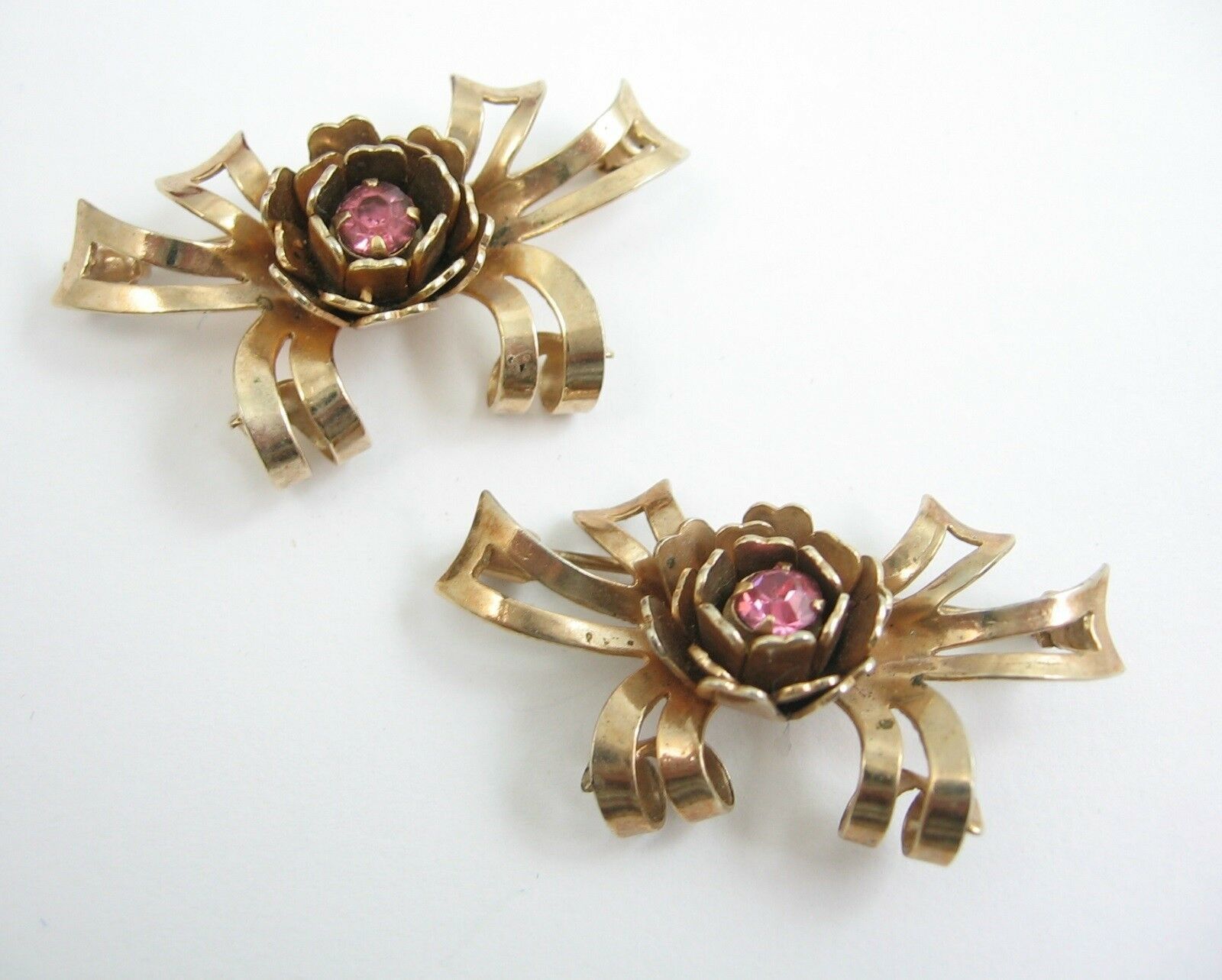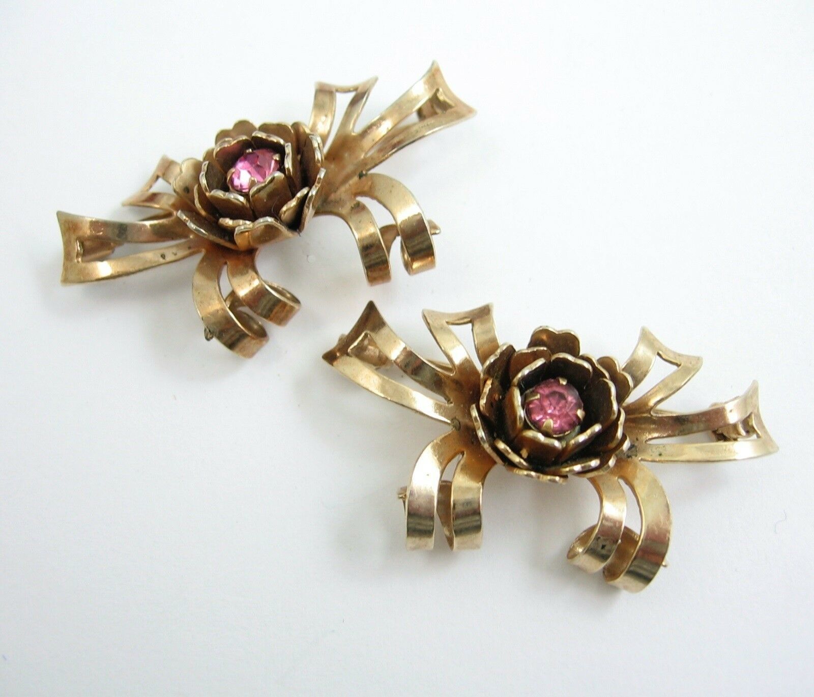In a goldtone metal, this pair of matching pins each has a rose flower bloom with a purple rhinestone in the center. Behind the bloom, curled ribbons can be seen.