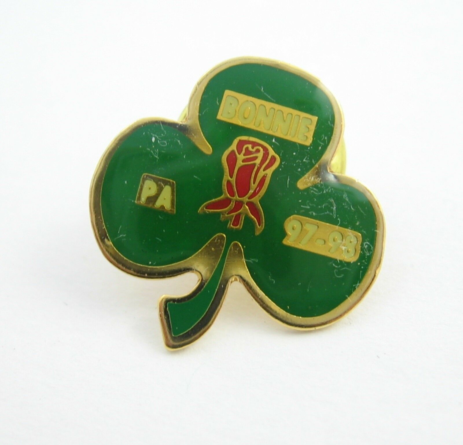SHAMROCK Rose PINBACK Vintage Tie Tack Pin BONNIE PA 97 - 98 Green Goldtone