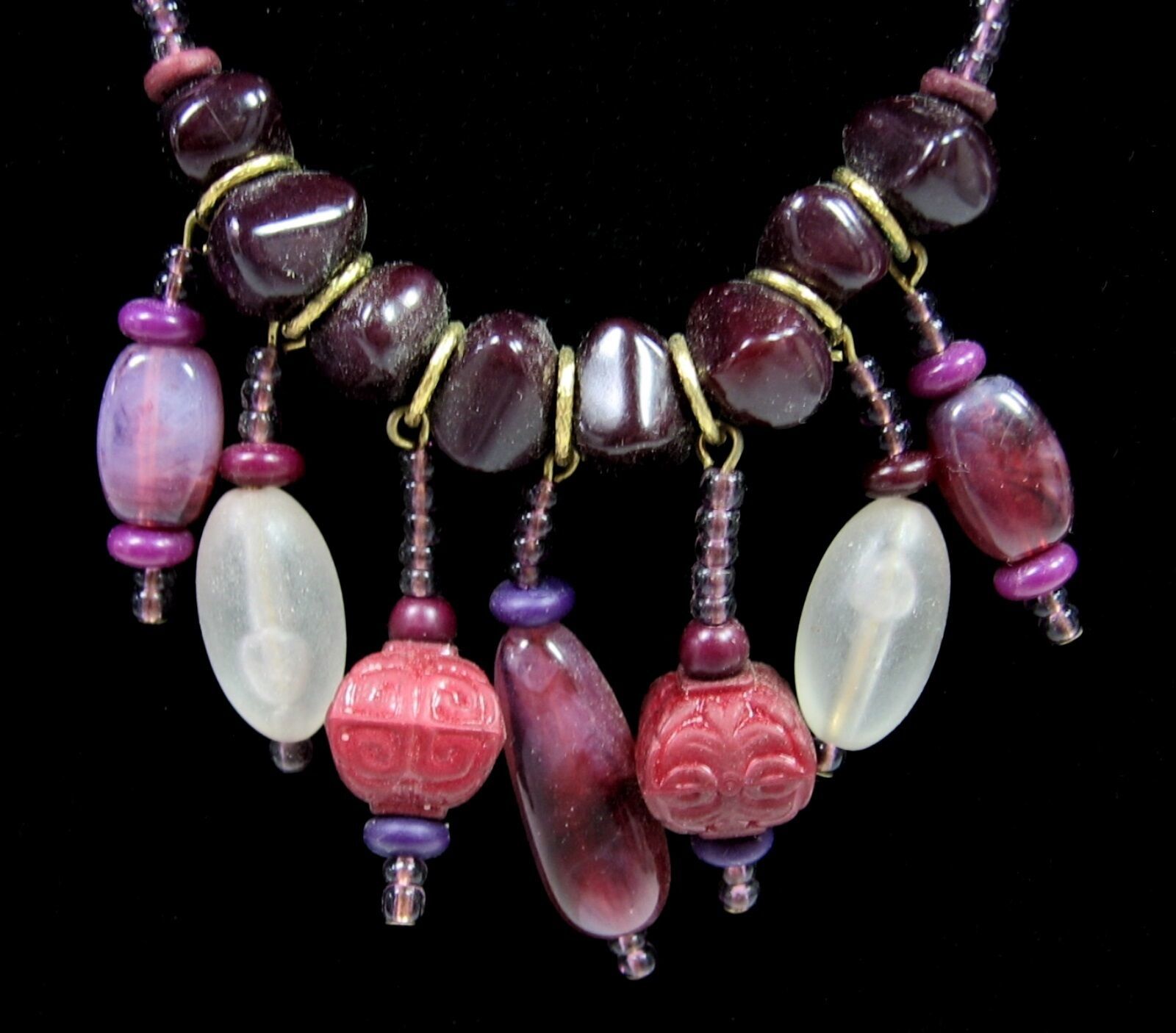 Vintage Shades of PURPLE DARK RED Dangle BEADS Front Piece NECKLACE 16" Plastic Light