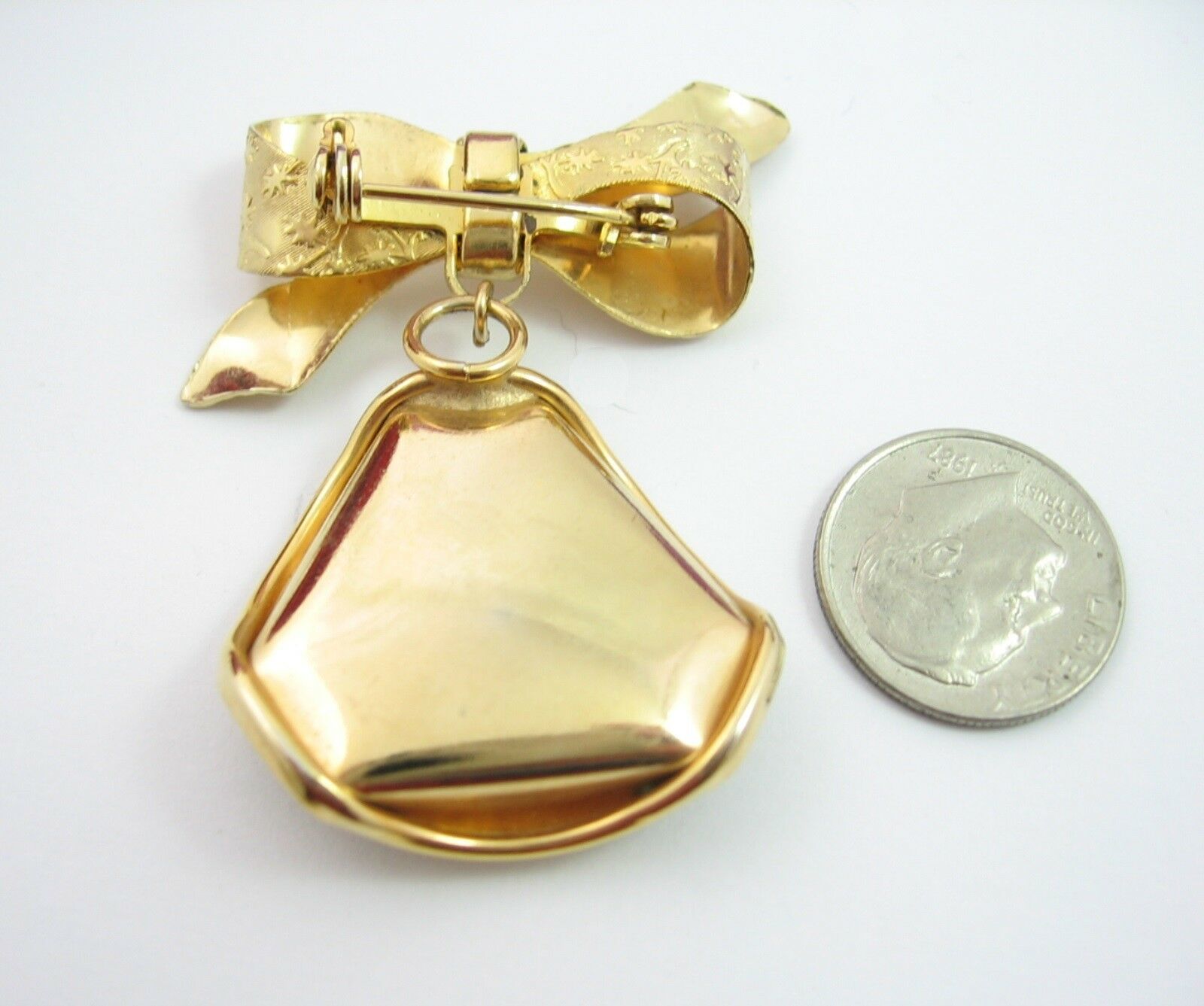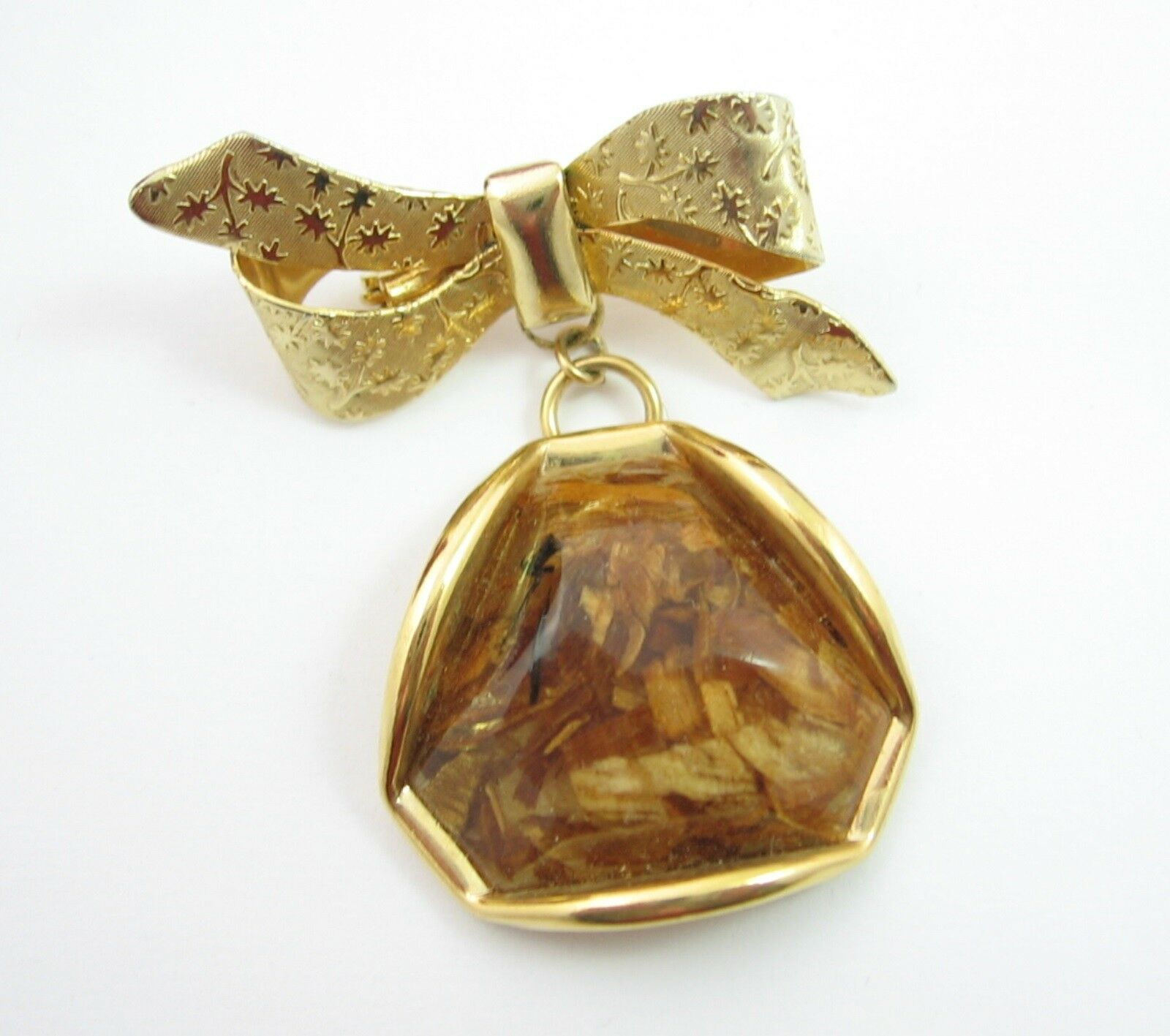 Imitation AMBER CHARM Triangular BOW BROOCH Vintage Pin Grass Bark Goldtone