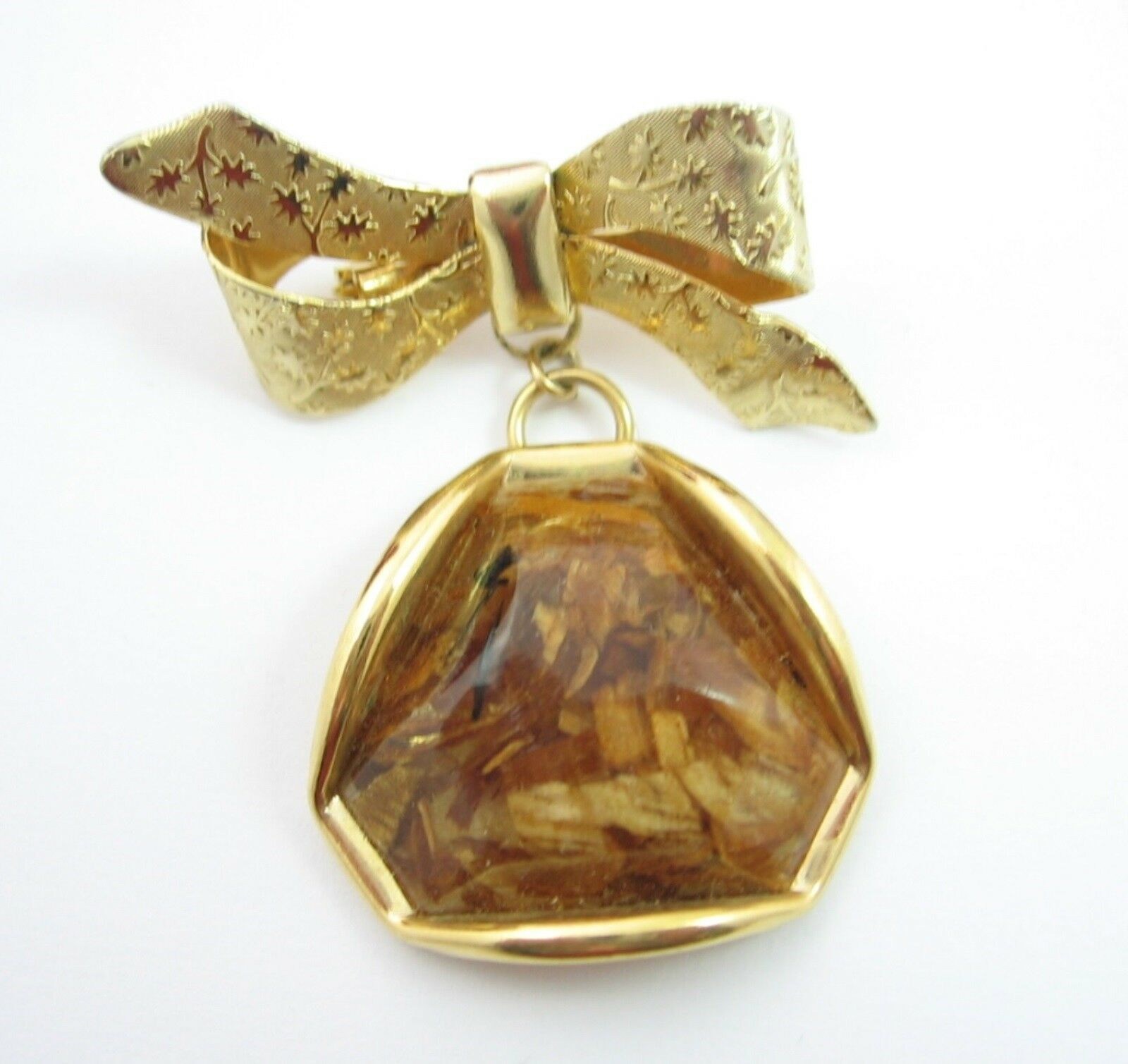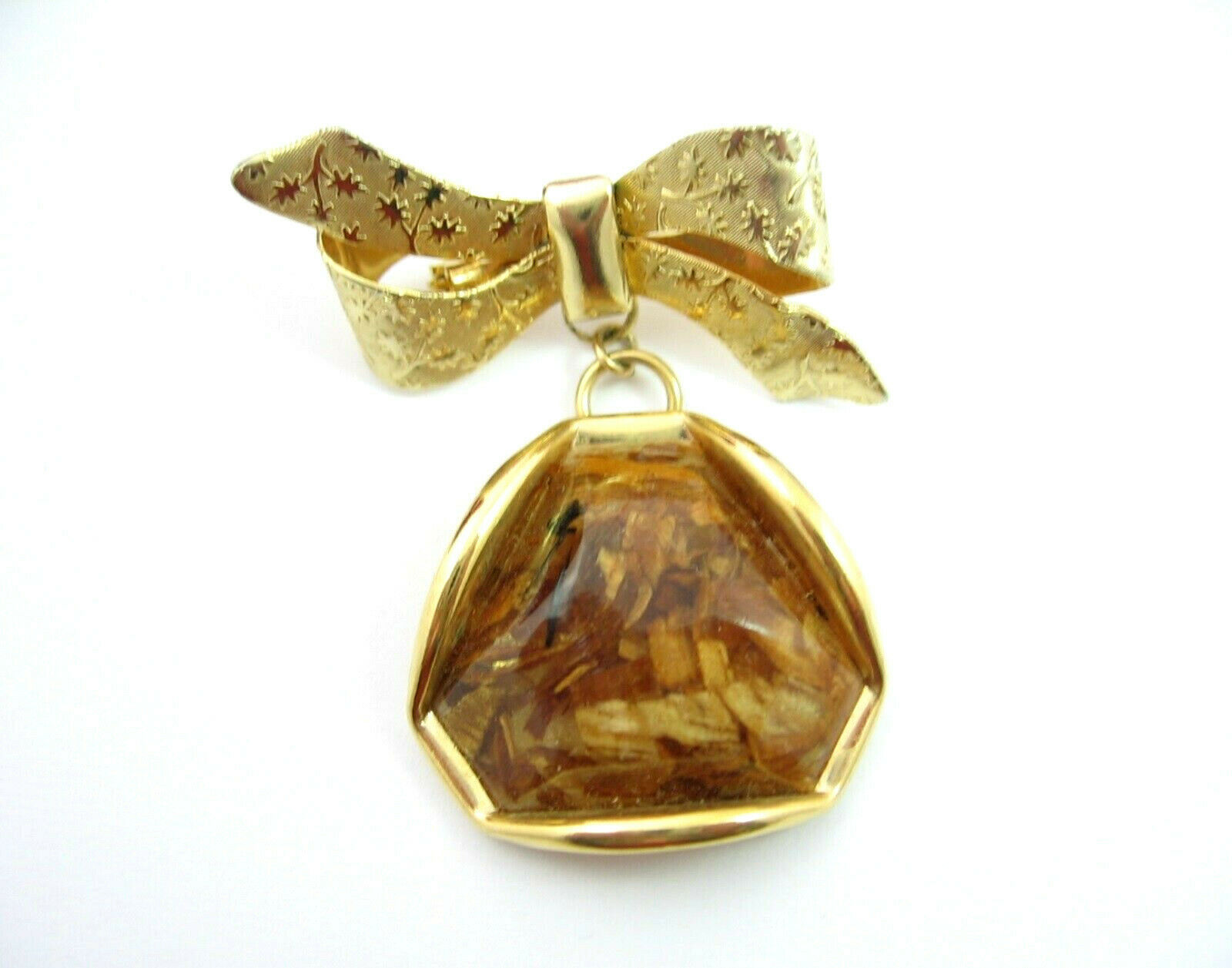 Vintage Imitation AMBER CHARM Triangular BOW BROOCH Vintage Pin Grass Bark Goldtone