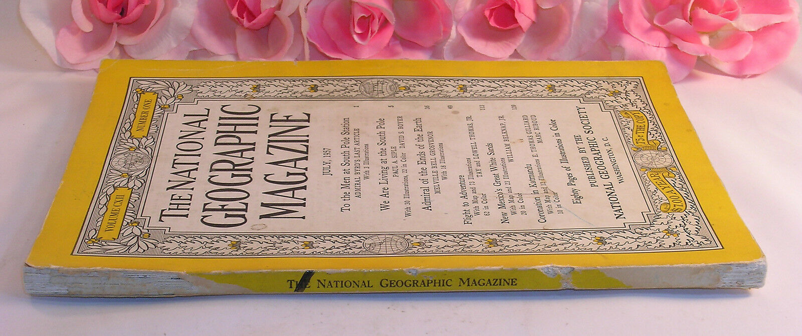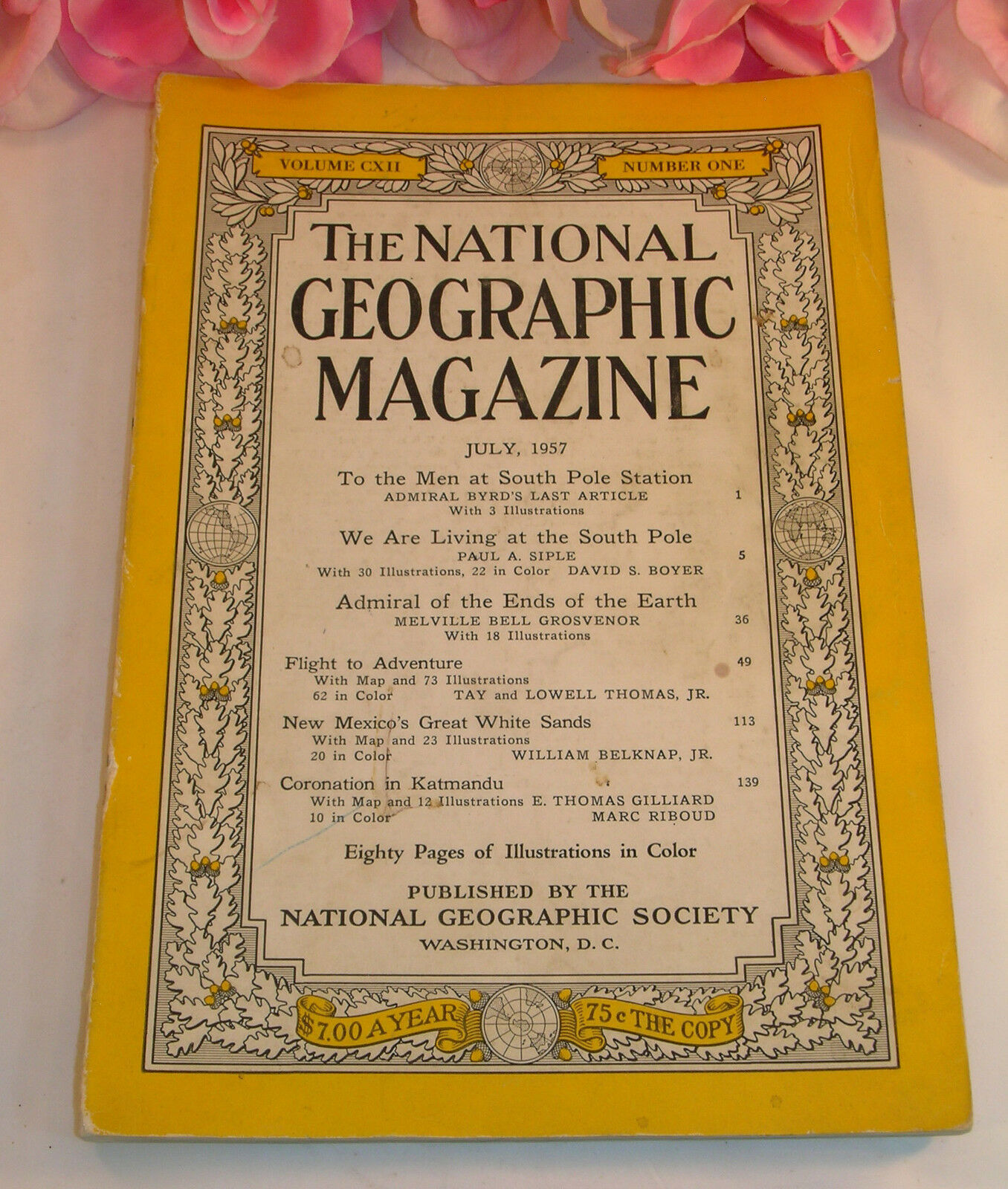 You are buying a gently used National Geographic Magazine. This magazine is from July1957, Volume CXII, Number One. The magazine is in used condition. The stories in this issue are about Men at the South Pole Station Admiral Byrd's last article, Living at the south pole, Flight to adventure, New Mexico's Great White Sands Coronation in Katmandu.